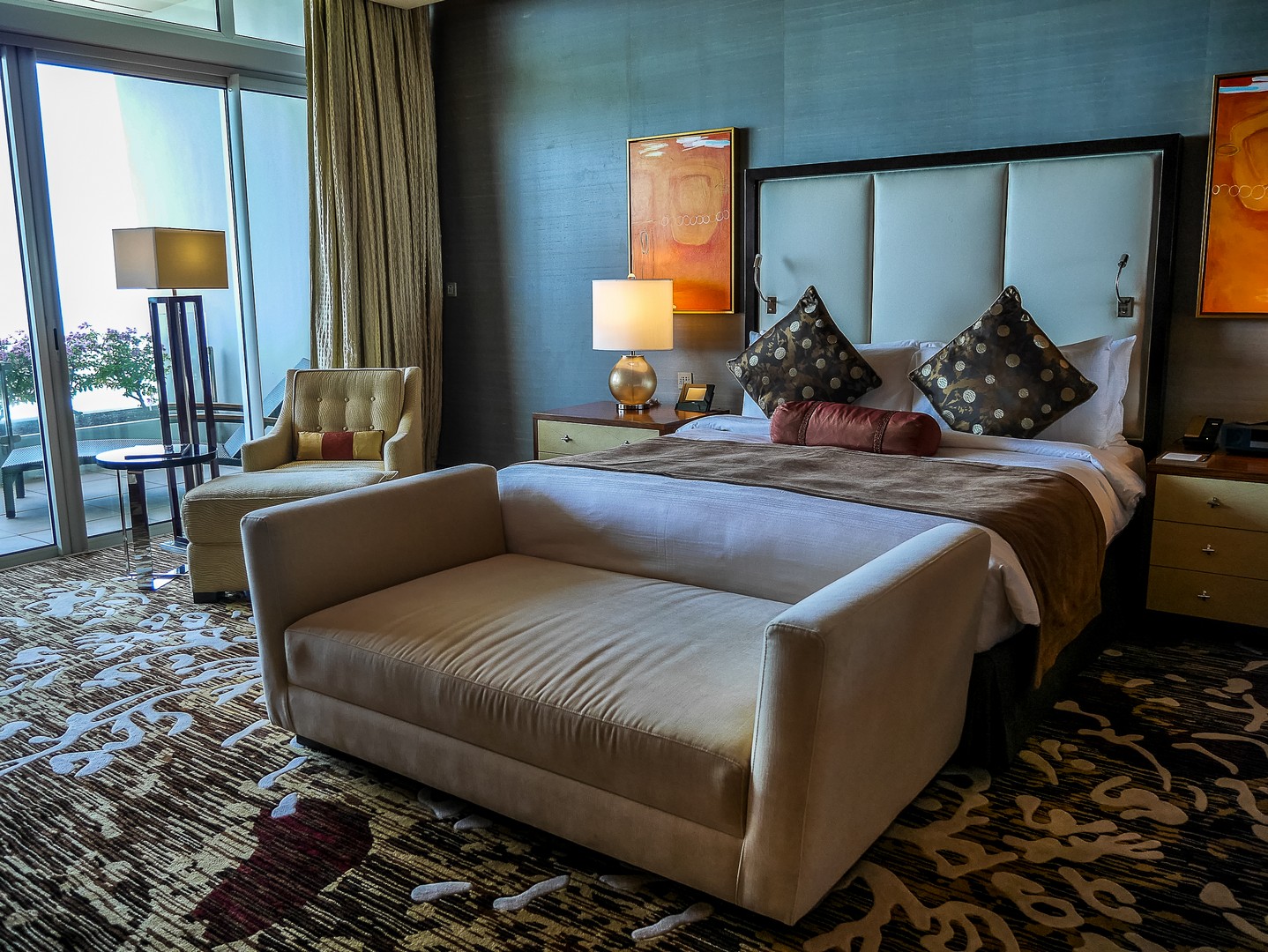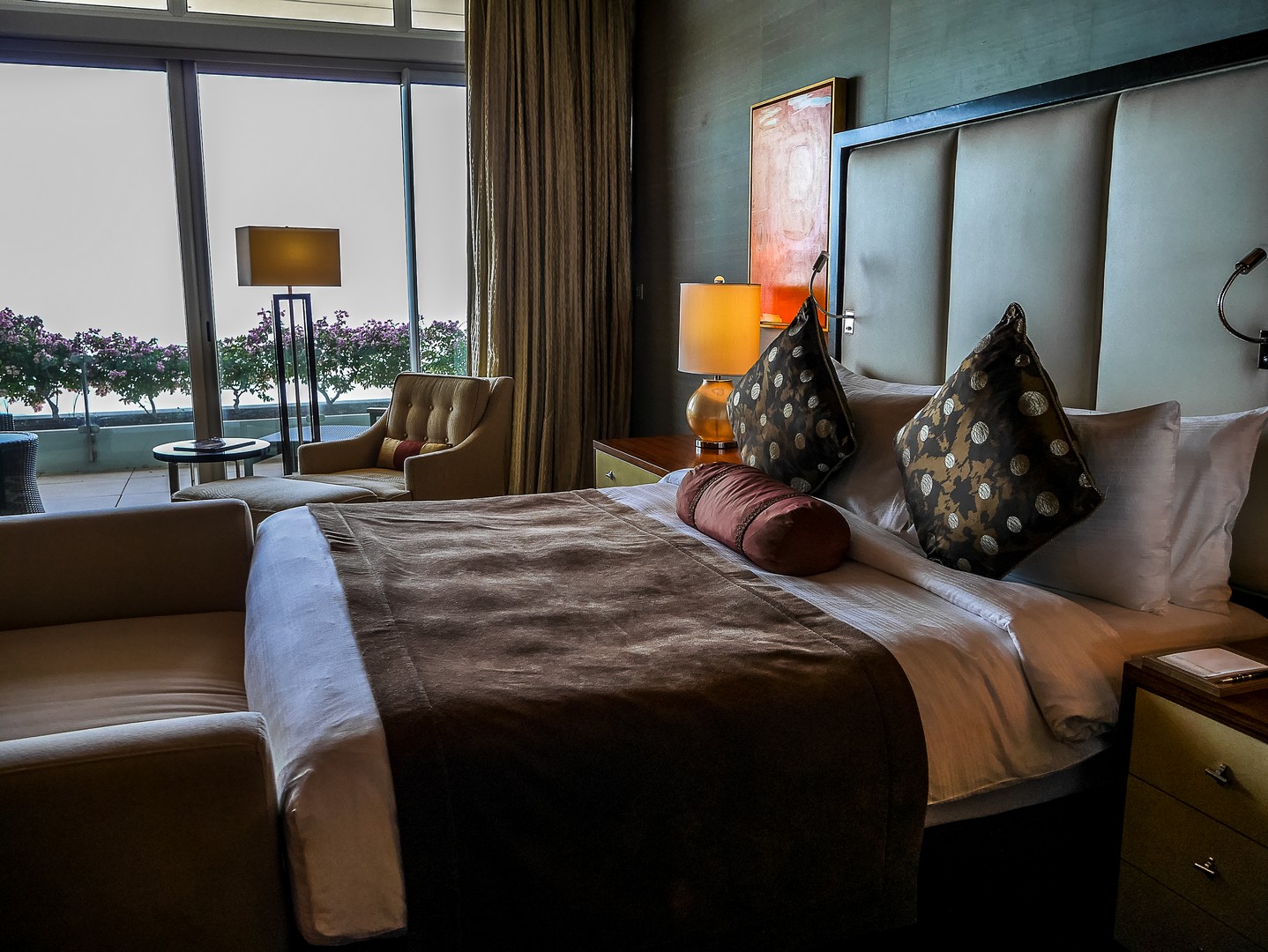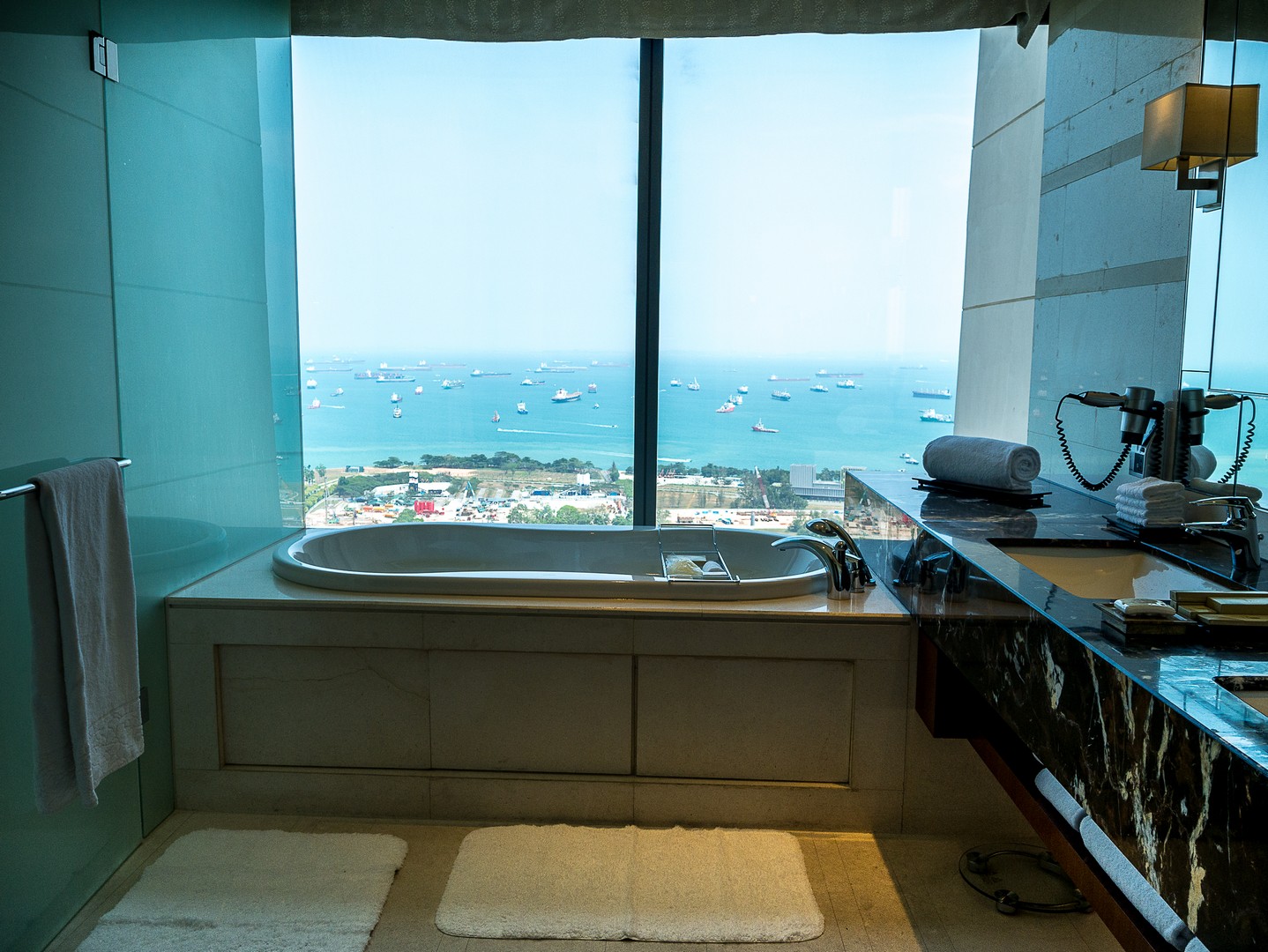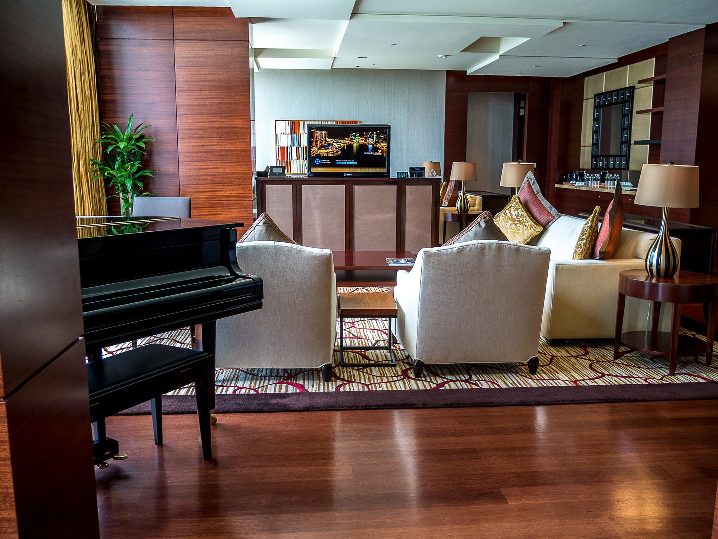 Commençons par l’entrée…. Sache, Lectrice, Lecteur, qu’elle est tout simplement gigantesque : elle couvre toute la distance qui sépare la première et la troisième tour. C’est d’ailleurs plus une véritable promenade intérieure, bordée de restaurants et de magasins qu’une entrée d’hôtel classique. Le marbre brille, il y a des plantes et arbustes à profusion et une lumière blanche est naturellement diffusée dans tout l’atrium. C’est très impressionnant ! Bien vite, la responsable marketing va m’emmener visiter une chambre dont je peux seulement rêver. Que dis-je une chambre ? Une suite ! Deux chambres de tailles égale, chacune avec sa salle de bain et sa baignoire (je prends celle qui vue sur la baie !!!) le tout dans une décoration très sobre, avec des tons de marrons, de beige, de champagne, quelque fois illuminé de note de bleu clair ou de jaune orangé. Ce qui extravagant, c’est l’équipement qu’on peut y trouver : un piano à queue trône de le salon. La suite à sa propre salle de gym, ainsi que son propre espace beauté-massage, une terrasse kilométrique et même une cuisine pour qu’un chef puisse y préparer des plats ! Et ce n’est même pas la suite la plus luxueuse de l’établissement.