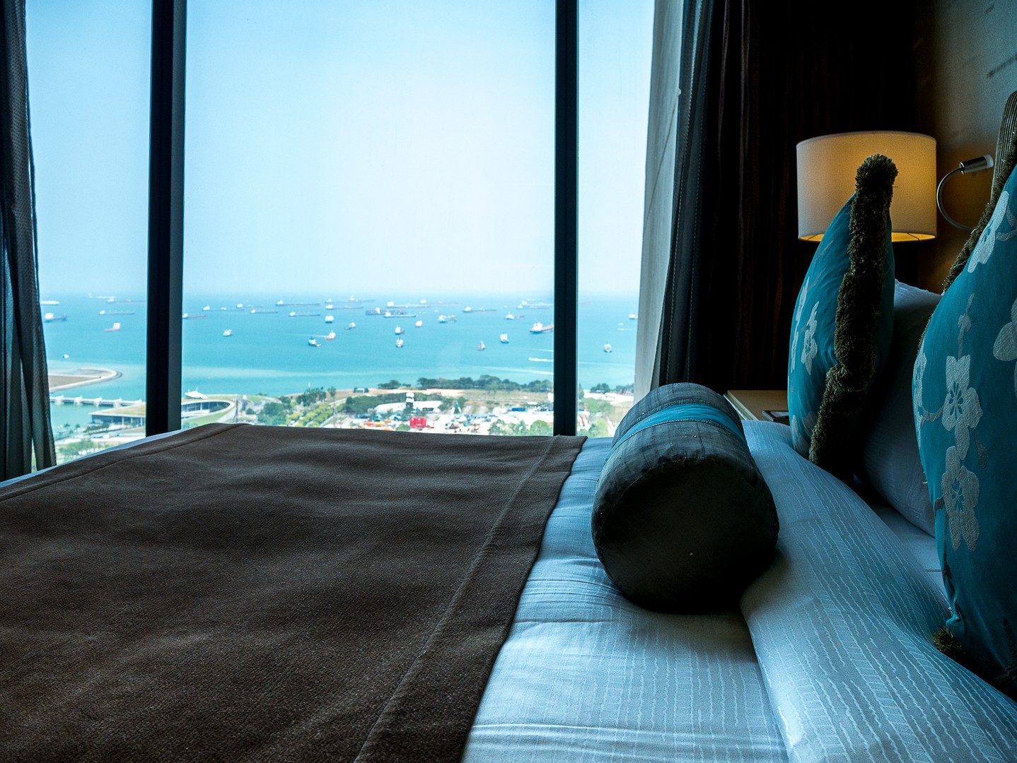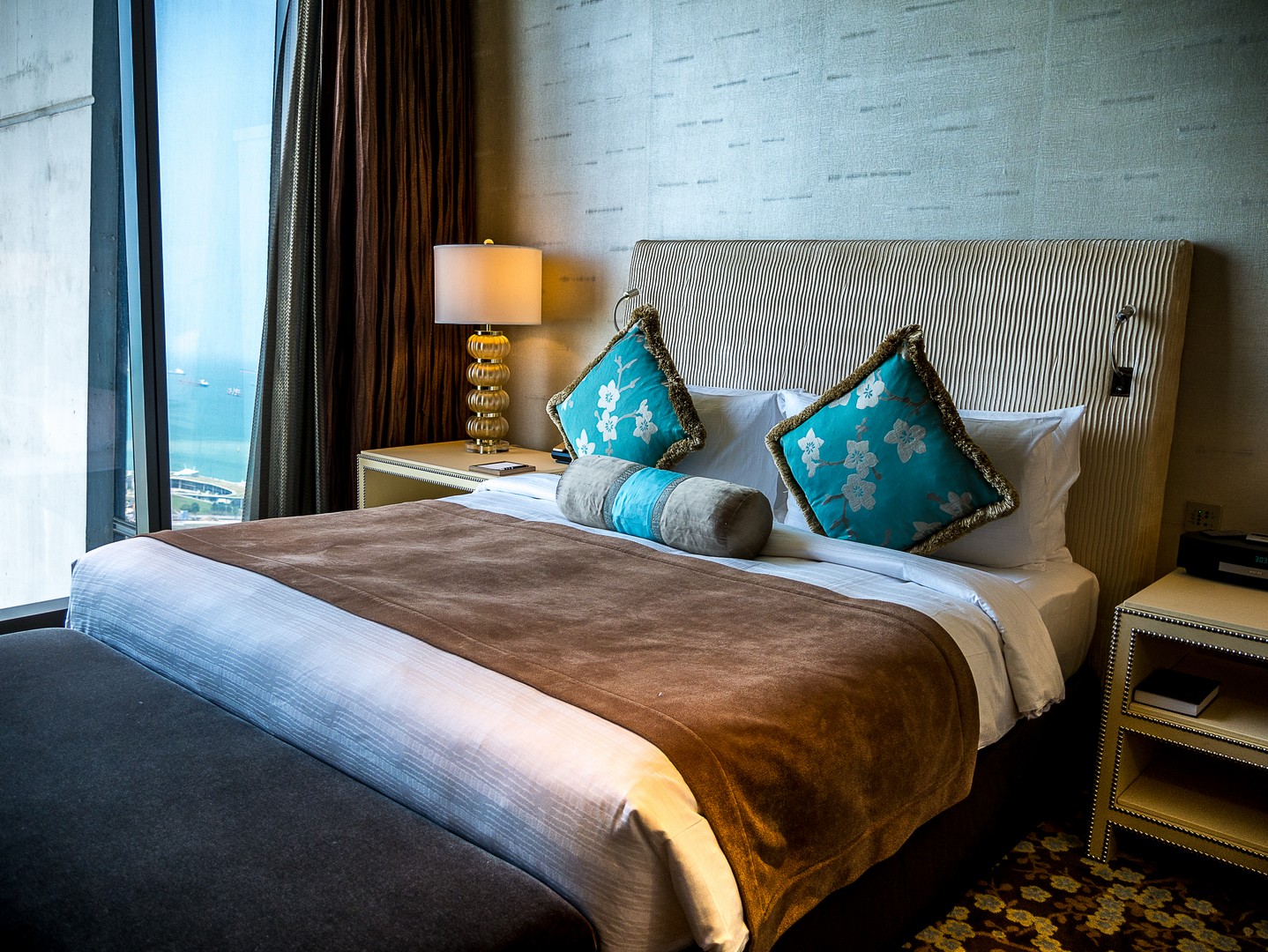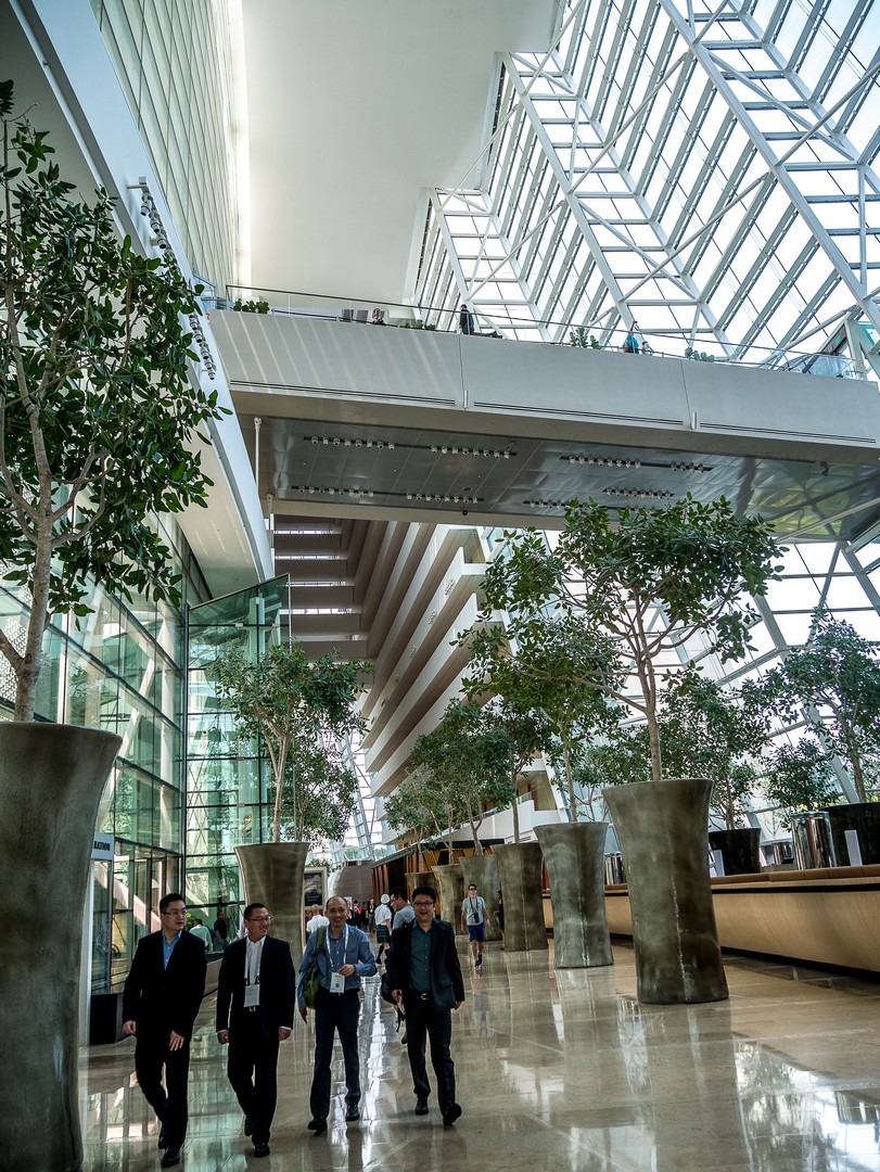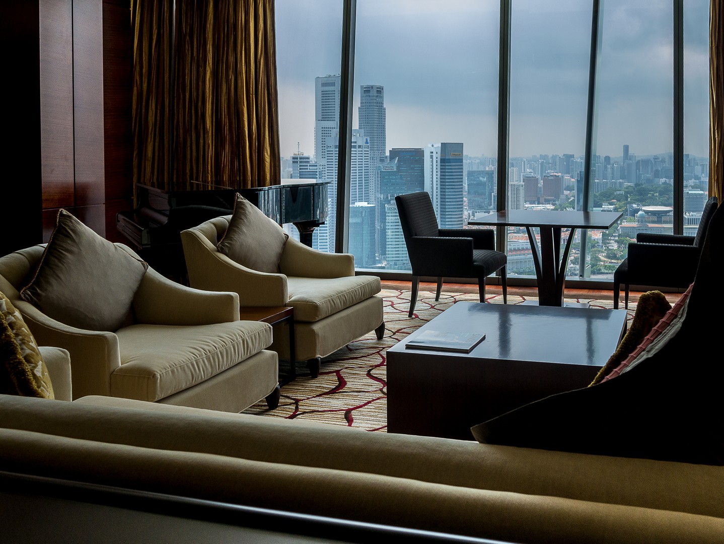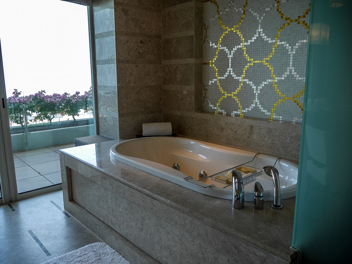 Commençons par l’entrée…. Sache, Lectrice, Lecteur, qu’elle est tout simplement gigantesque : elle couvre toute la distance qui sépare la première et la troisième tour. C’est d’ailleurs plus une véritable promenade intérieure, bordée de restaurants et de magasins qu’une entrée d’hôtel classique. Le marbre brille, il y a des plantes et arbustes à profusion et une lumière blanche est naturellement diffusée dans tout l’atrium. C’est très impressionnant ! Bien vite, la responsable marketing va m’emmener visiter une chambre dont je peux seulement rêver. Que dis-je une chambre ? Une suite ! Deux chambres de tailles égale, chacune avec sa salle de bain et sa baignoire (je prends celle qui vue sur la baie !!!) le tout dans une décoration très sobre, avec des tons de marrons, de beige, de champagne, quelque fois illuminé de note de bleu clair ou de jaune orangé. Ce qui extravagant, c’est l’équipement qu’on peut y trouver : un piano à queue trône de le salon. La suite à sa propre salle de gym, ainsi que son propre espace beauté-massage, une terrasse kilométrique et même une cuisine pour qu’un chef puisse y préparer des plats ! Et ce n’est même pas la suite la plus luxueuse de l’établissement.