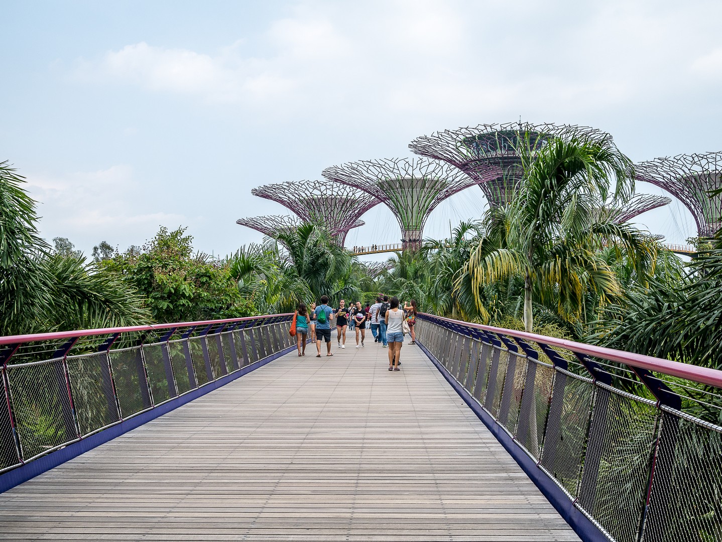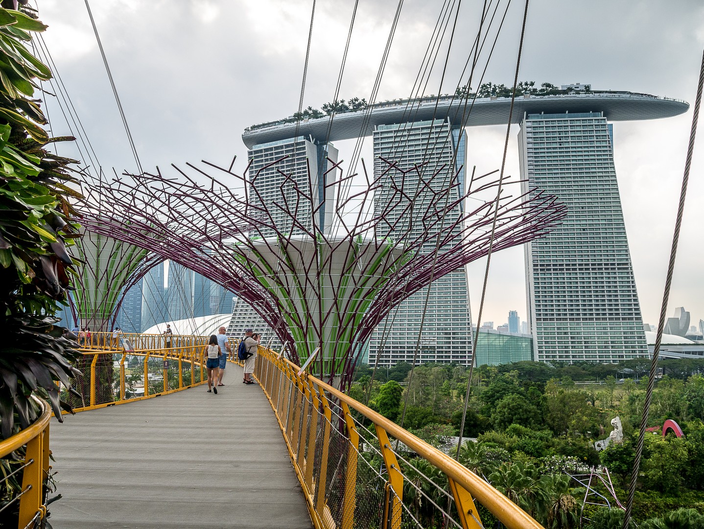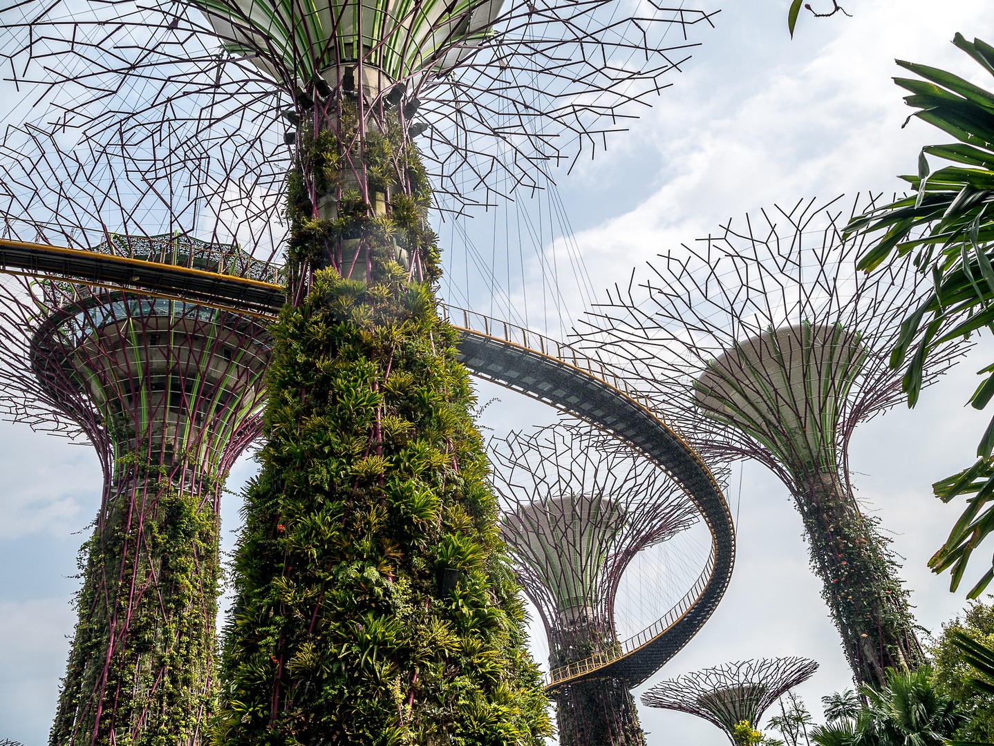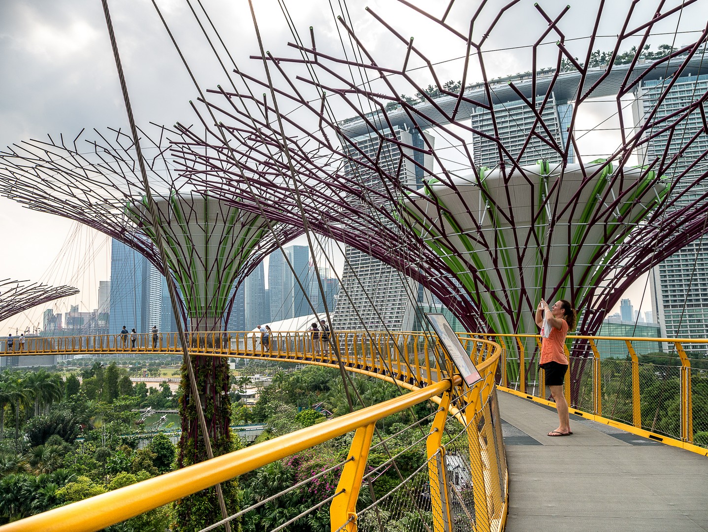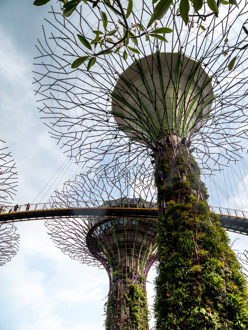 Lorsque j’ai constitué mon itinéraire de Tour du Monde. J’hésitais entre Hong-Kong et Singapour et c’est la perspective de voir les Supertrees en vrai qui a fait pencher la balance. Les Supertrees sont d’immenses arbres artificiels qui ressemblent un peu à des baobabs ou des arbres-dragons mais qui font entre 25 et 50 mètres de haut ! Supertree Grove est en quelques années devenue l’attraction-phare de Singapour et j’ai décidé d’aller les voir sous deux facettes : de jour comme de nuit. On peut les admirer gratuitement depuis le plancher des vaches mais si tu peux, Lectrice, Lecteur, offre-toi la promenade sur les passerelles entre les arbres. C’est tout simplement merveilleux ! Entre ces drôles de construction de métal et de fibres, je me dis que les architectes ont dû lire beaucoup de romans de science-fiction, j’ai l’impression d’être dans un roman de science-fiction qui parlerait d’une Terre vouée à l’optimisme et à l’écologie : les arbres eux-mêmes sont recouvert de vraies plantes et 11 des 16 sont équipés de cellules voltaïques pour générer leur propre énergie et le soir, ils vont en avoir besoin ! Mais pour le moment, c’est un ciel mi-figue, mi-raisin, typique de ces chaudes journées d’Asie du Sud-Est, que j’aperçois depuis les passerelles… à l’ombre des larges canopées de ce drôles d’arbres. On peut voir de là tout le complexe de Gardens by the Bay, la Marina, le théâtre… Et à cette heure-ci, je suis quasi seule là-haut, ne croisant qu’une poignée de visiteurs.