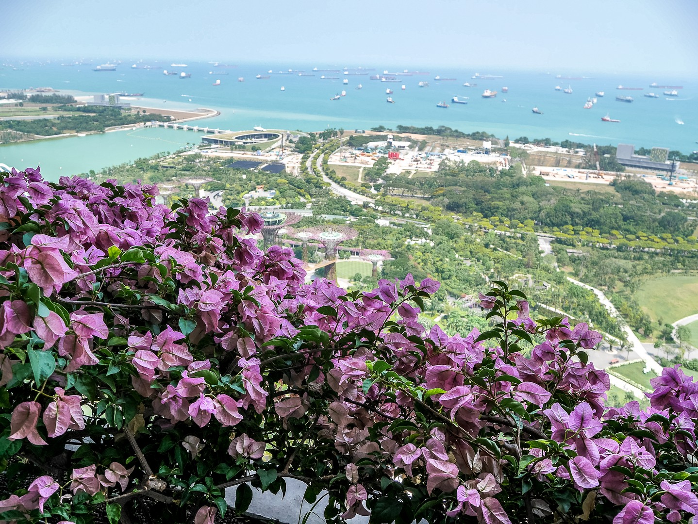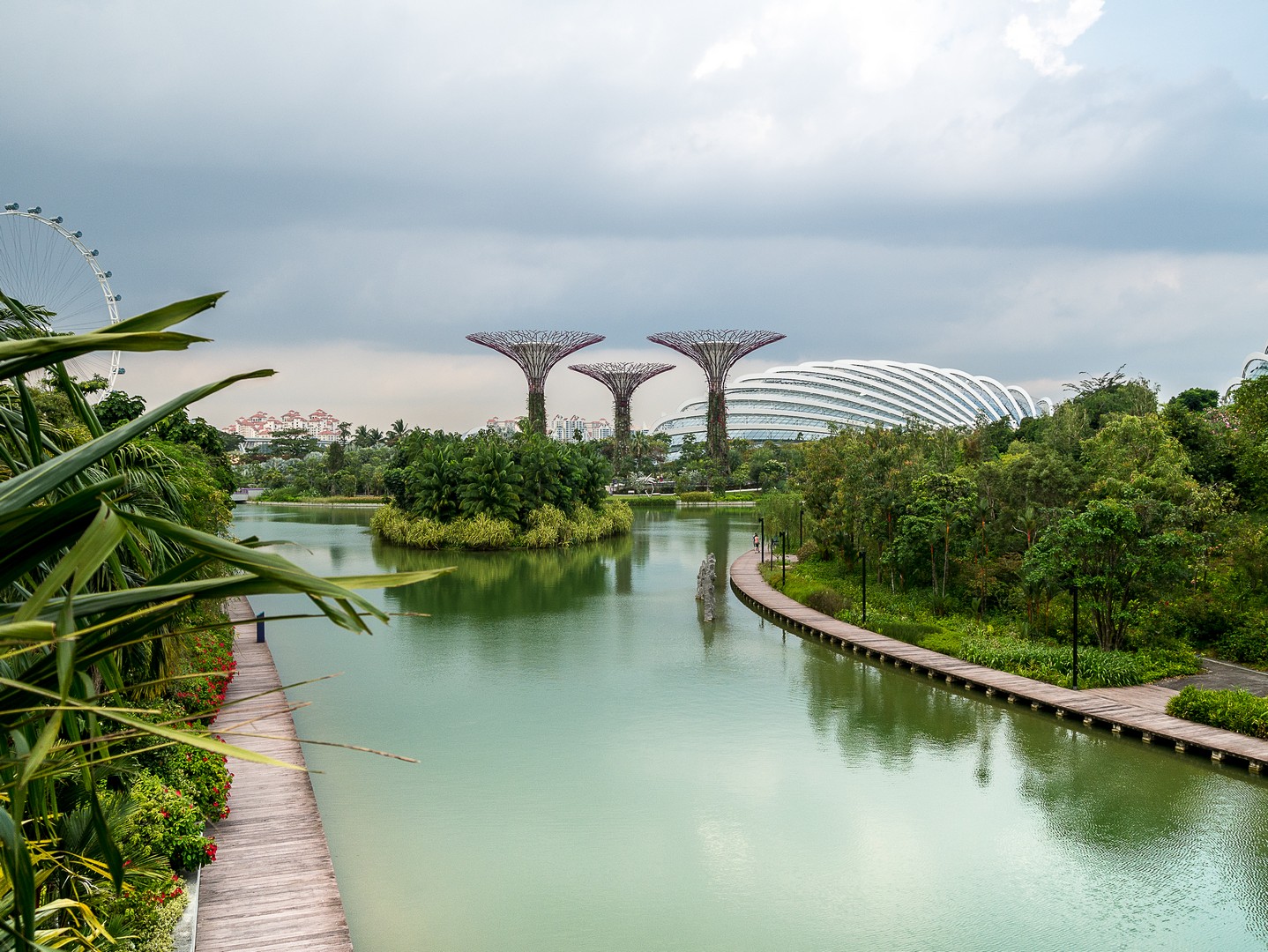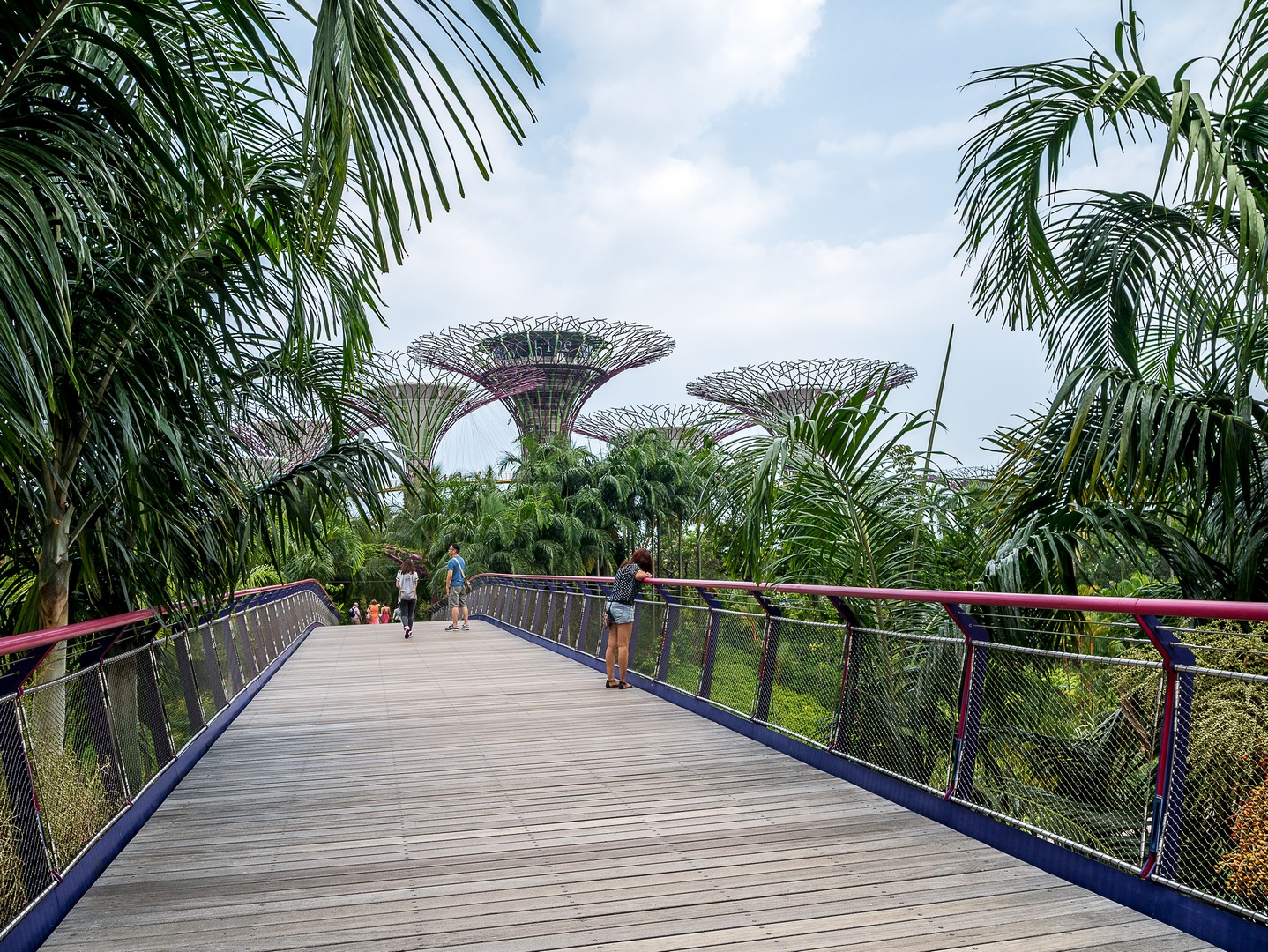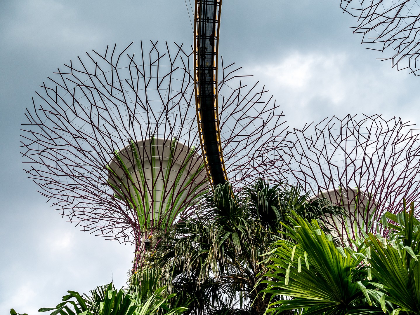 Lorsque j’ai constitué mon itinéraire de Tour du Monde. J’hésitais entre Hong-Kong et Singapour et c’est la perspective de voir les Supertrees en vrai qui a fait pencher la balance. Les Supertrees sont d’immenses arbres artificiels qui ressemblent un peu à des baobabs ou des arbres-dragons mais qui font entre 25 et 50 mètres de haut ! Supertree Grove est en quelques années devenue l’attraction-phare de Singapour et j’ai décidé d’aller les voir sous deux facettes : de jour comme de nuit. On peut les admirer gratuitement depuis le plancher des vaches mais si tu peux, Lectrice, Lecteur, offre-toi la promenade sur les passerelles entre les arbres. C’est tout simplement merveilleux ! Entre ces drôles de construction de métal et de fibres, je me dis que les architectes ont dû lire beaucoup de romans de science-fiction, j’ai l’impression d’être dans un roman de science-fiction qui parlerait d’une Terre vouée à l’optimisme et à l’écologie : les arbres eux-mêmes sont recouvert de vraies plantes et 11 des 16 sont équipés de cellules voltaïques pour générer leur propre énergie et le soir, ils vont en avoir besoin ! Mais pour le moment, c’est un ciel mi-figue, mi-raisin, typique de ces chaudes journées d’Asie du Sud-Est, que j’aperçois depuis les passerelles… à l’ombre des larges canopées de ce drôles d’arbres. On peut voir de là tout le complexe de Gardens by the Bay, la Marina, le théâtre… Et à cette heure-ci, je suis quasi seule là-haut, ne croisant qu’une poignée de visiteurs.