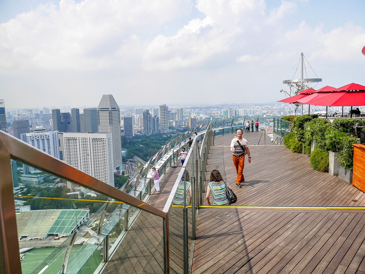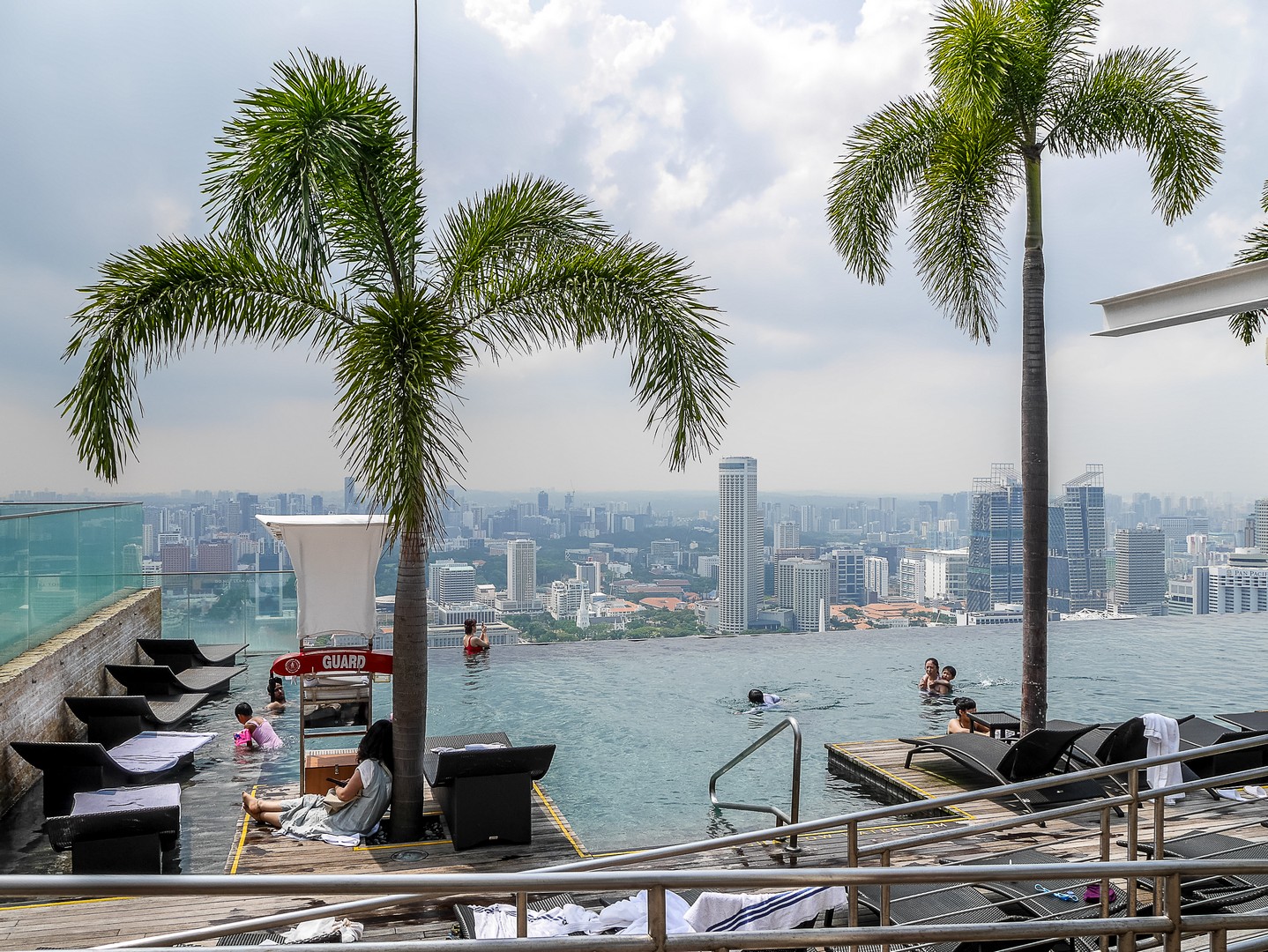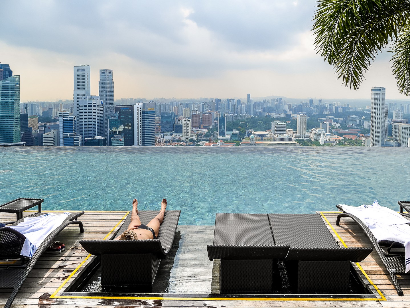 Après le tour de la suite, je suis emmenée vers ce que je voulais absolument voir : la fameuse piscine à débordement qui prend presque toute la longueur de structure en forme de bateau. Et comment vous dire… C’est tout simplement stupéfiant. Rien ne semble séparer les nageurs du vide mais surtout, du panorama de Singapour. L’espace elui-mêmeme est très bien réalisé avec les abords de la piscine tout en teck, delarges parasolss et même de vrais palmiers pour donner une touche « nature » à l’ensemble. Tous les clients de l’hôtel ont accès à la piscine (pas de chance pour ceux qui n’y logent pas) par contre, le rooftop bar lui, est ouvert au public et ce n’est pas tombée dans l’oreille d’une sourde !