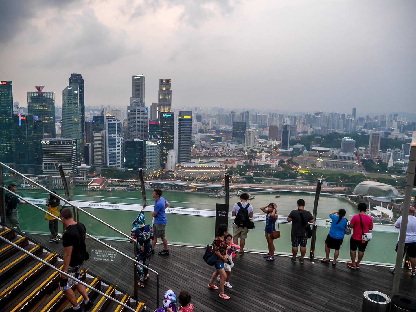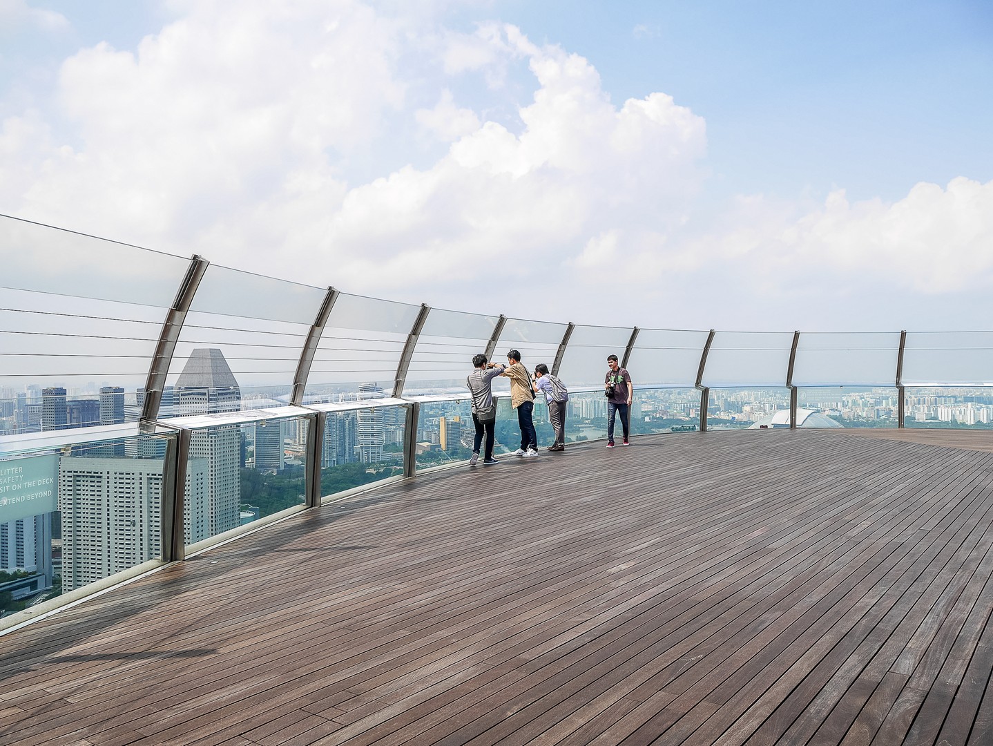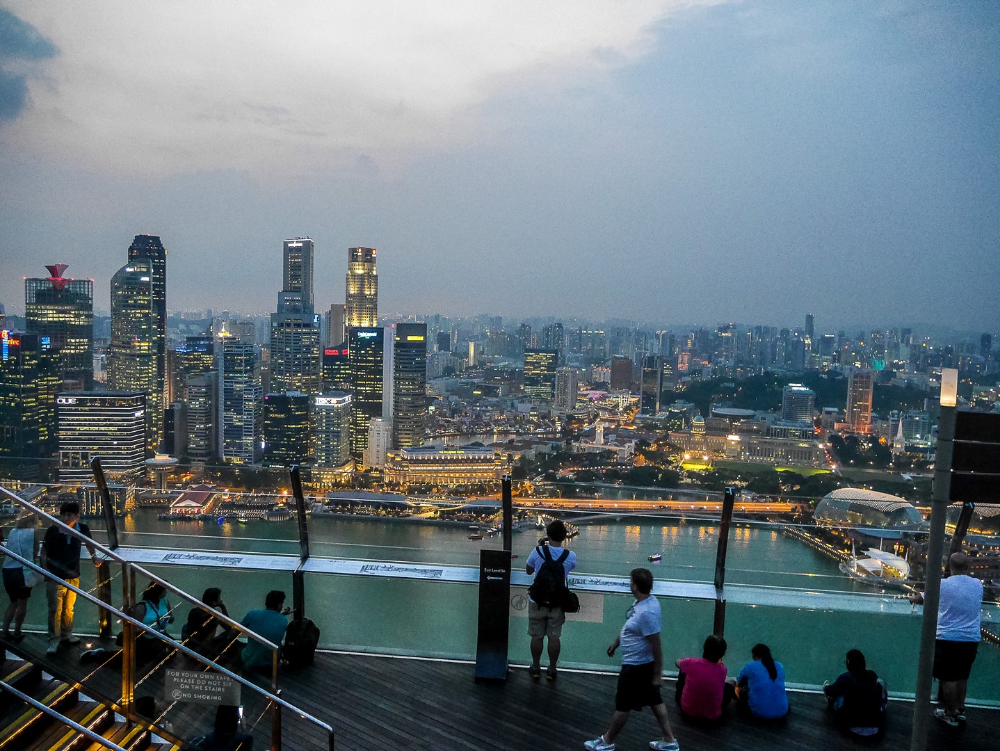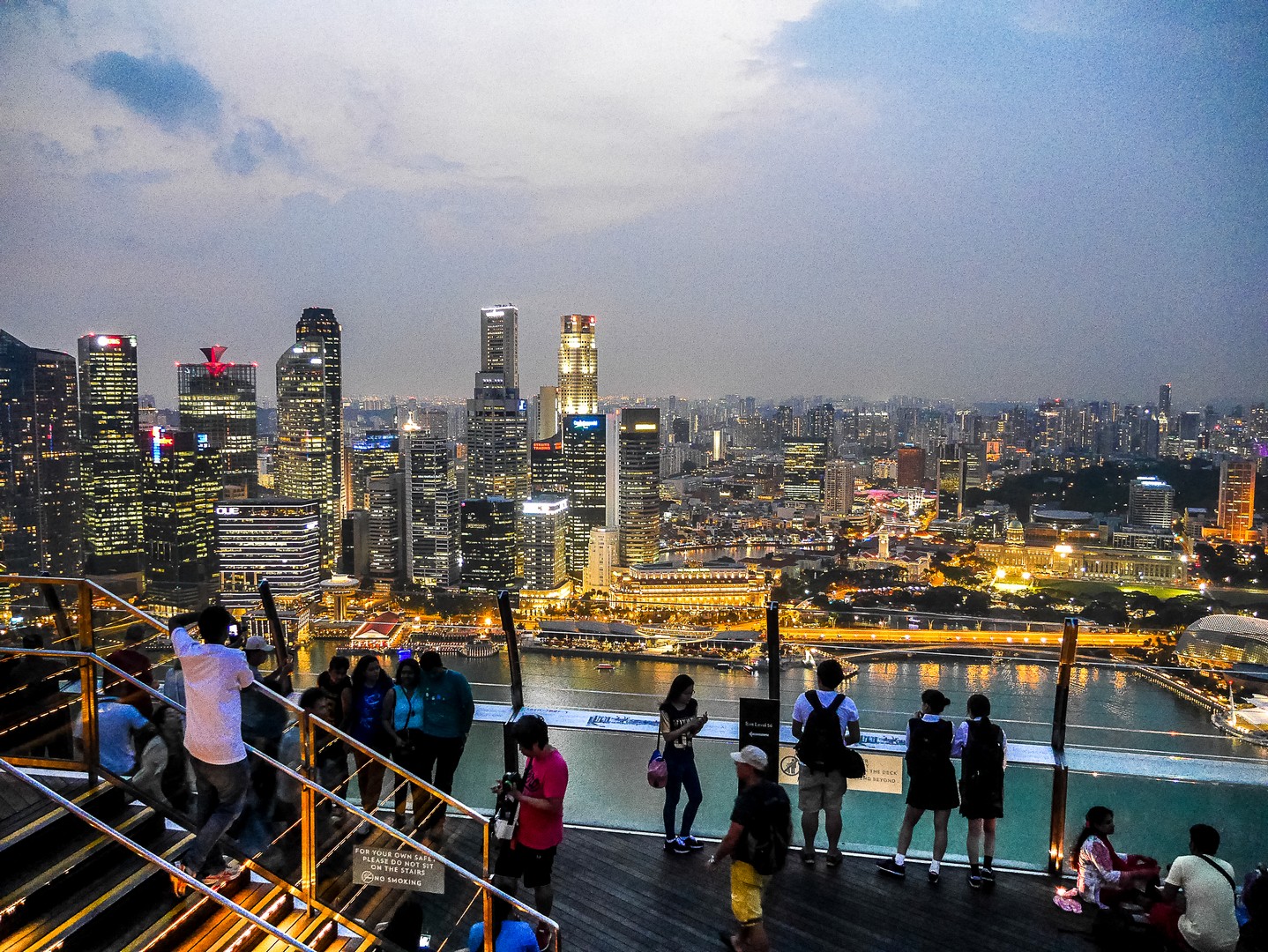 Après le tour de la suite, je suis emmenée vers ce que je voulais absolument voir : la fameuse piscine à débordement qui prend presque toute la longueur de structure en forme de bateau. Et comment vous dire… C’est tout simplement stupéfiant. Rien ne semble séparer les nageurs du vide mais surtout, du panorama de Singapour. L’espace elui-mêmeme est très bien réalisé avec les abords de la piscine tout en teck, delarges parasolss et même de vrais palmiers pour donner une touche « nature » à l’ensemble. Tous les clients de l’hôtel ont accès à la piscine (pas de chance pour ceux qui n’y logent pas) par contre, le rooftop bar lui, est ouvert au public et ce n’est pas tombée dans l’oreille d’une sourde !