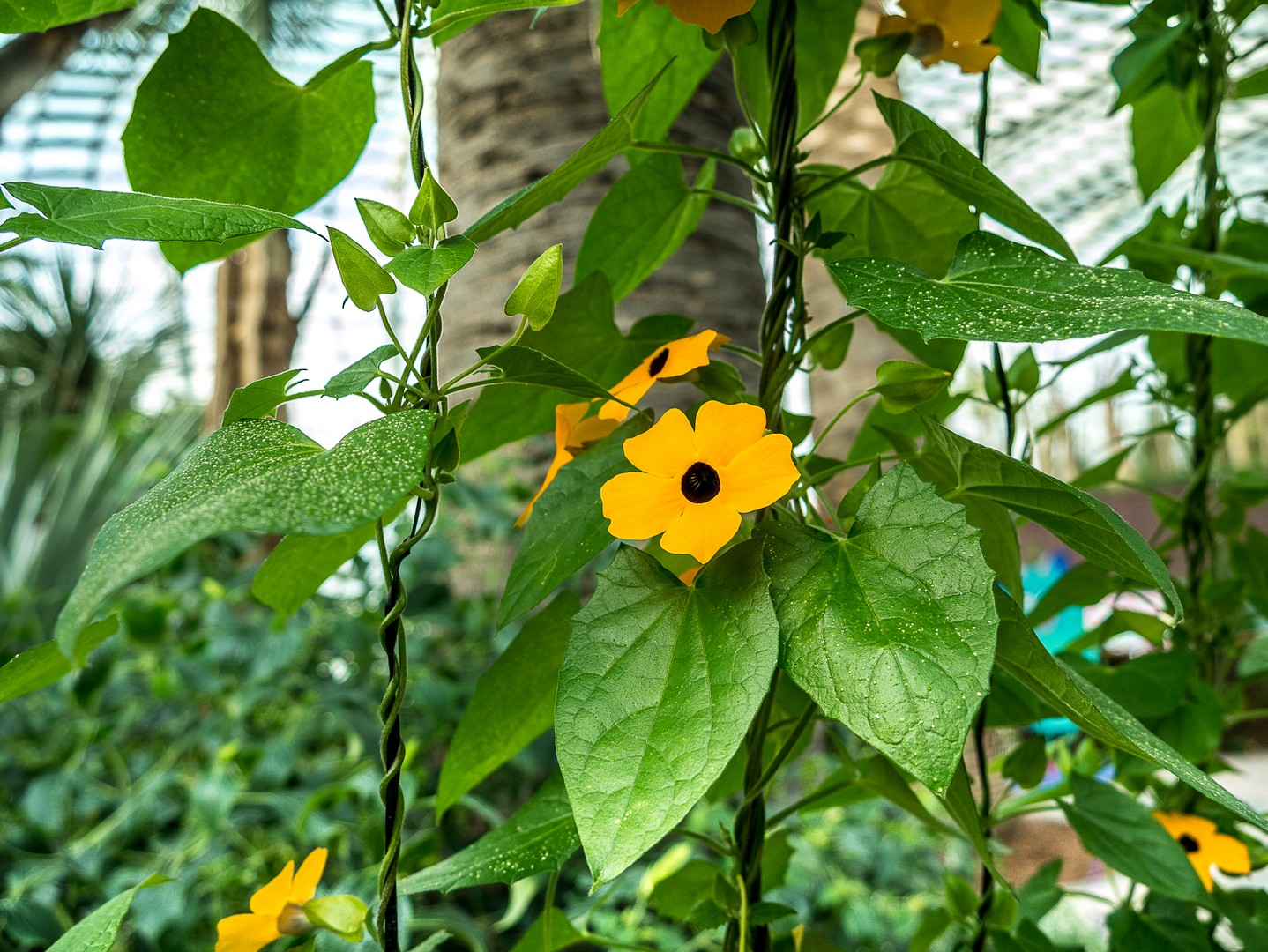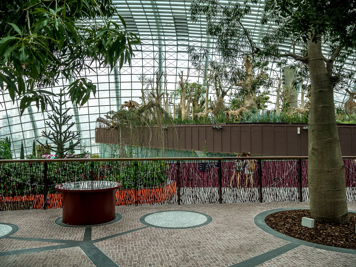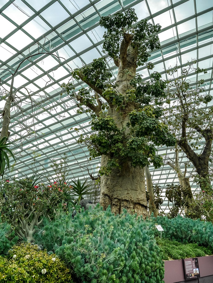 Je me balade de jardins en jardins, essayant de reconnaître des plantes que je connais, ne fut-ce que de vue ou m’émerveillant d’autres qui m’étaient inconnues Et partout sous le dôme, des jardiniers sont affairés, surveillant, bichonnant les plans. L’aspect naturel qu’on a voulu leur donner (sauf pour le champ de fleurs qui est clairement mis en scène) témoigne de toute la réflexion qu’il y a derrière la conception des bômes… Le clou du spectacle est la partie du dôme réservée aux baobabs et autres arbres. Une véritable forêt en miniature qui s’élève sous le dôme de verre.