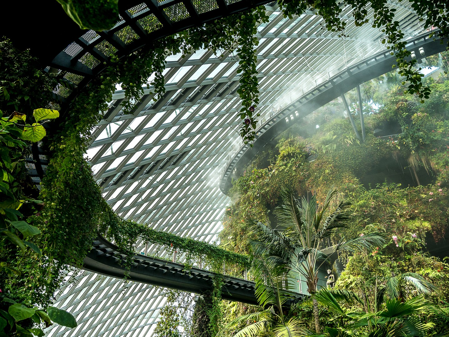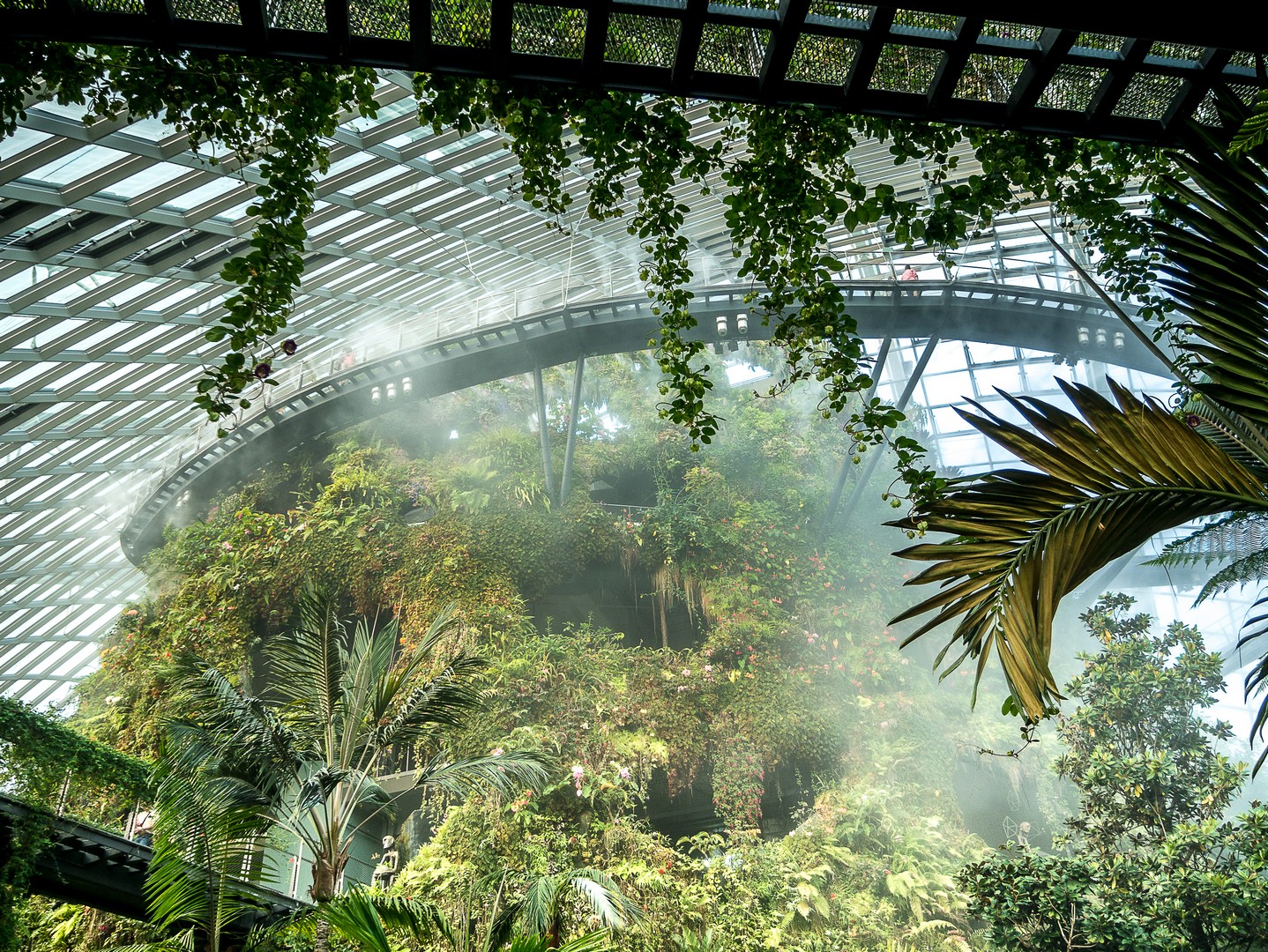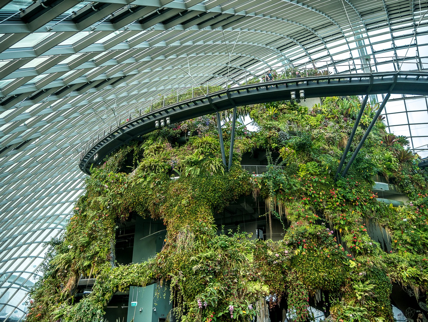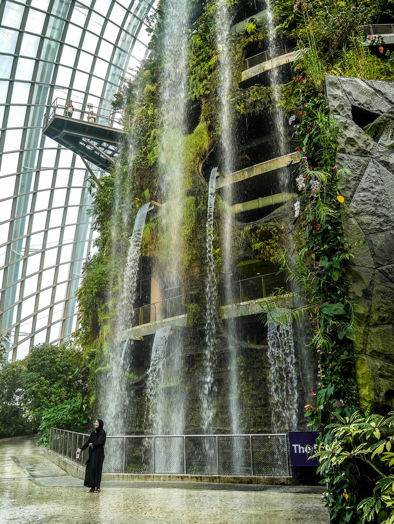 On rentre dans la « Cloudforest » via un tunnel qui relie les deux dômes et quand on en sort, Lectrice, Lecteur, les mâchoires m’en tombent : sous une cloche de verre se trouve… une montagne. Une véritable petite montagne couverte de plantes luxuriantes, agrémentées de chutes d’eau et dont le sommet se perd dans une brume d’eau. C’est le domaine d’une forêt tropicale humide qui a été recrée ici et à chaque niveau ses spécifiés. On y accède via l’intérieur de la montagne. En plus des plantes, l’importance du cycle de l’eau et de la géologie y sont expliquées. J’avoue avoir fait un peu l’impasse sur toutes ces explications scientifiques, si absorbées que j’étais par le spectacle que j’avais devant moi : j’avais l’impression d’être dans un monde à la croisée de Jurassic Park et d’Alice au Pays des Merveilles.