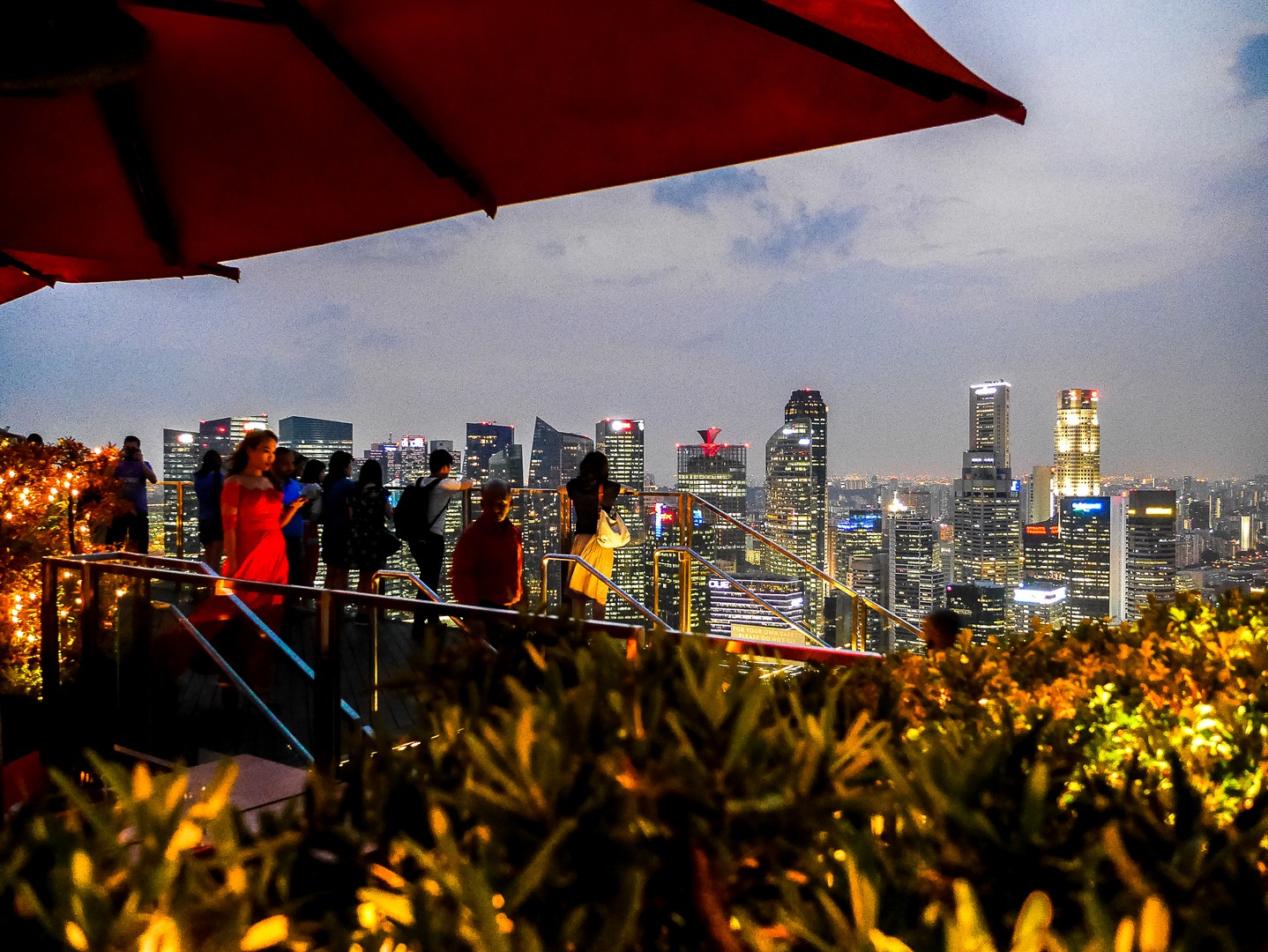 Le temps de retourner vers le Marina Bay Sands et de prendre l’ascenseur, celui-ci est déjà presque à raz de l’horizon quand j’arrive au Cé La Vie Restautant and Skybar. Le ciel se colore légèrement de rose poudré et de lavande, la musique, lounge évidemment, pulse, une foule, pas trop compacte, de gens chics en profite également. Beaucoup de groupes d’hommes entre autres. Singapour est une grosse destination d’affaire et de conférences et un verre au rooftop bar du Marina Bay Sands a de quoi épater la galerie ! Je commande mon cocktail : un breuvage agrémenter d’un piment vert qui me tire de la nostalgie qui était déjà en train de s’installer. Je vais m’accouder à une rambarde et regarder les lumières de la grande ville s’allumer une à une. Avec la ville à mes pieds, j’ai l’impression d’être un peu la maîtresse du monde, d’avoir soutiré le plus que je voulais d’une expérience que j’avais tant désiré depuis tellement d’année. En tout cas aujourd’hui. J’aimerai te dire, Lectrice, Lecteur, qu’un bel homme soit venu s’accouder à côté de moi, en souriant, et en me demandant : « What’s your poison ? » avant de m’offrir un verre… mais ça ne s’est pas passé comme çà. Finalement, bien peu de choses se sont passées exactement comme je les voulais pendant ces presque quatre mois. Une fois le soir complètement descendu, j’ai repris l’ascenseur pour aller à nouveau me promener dans la Supertree Grove.