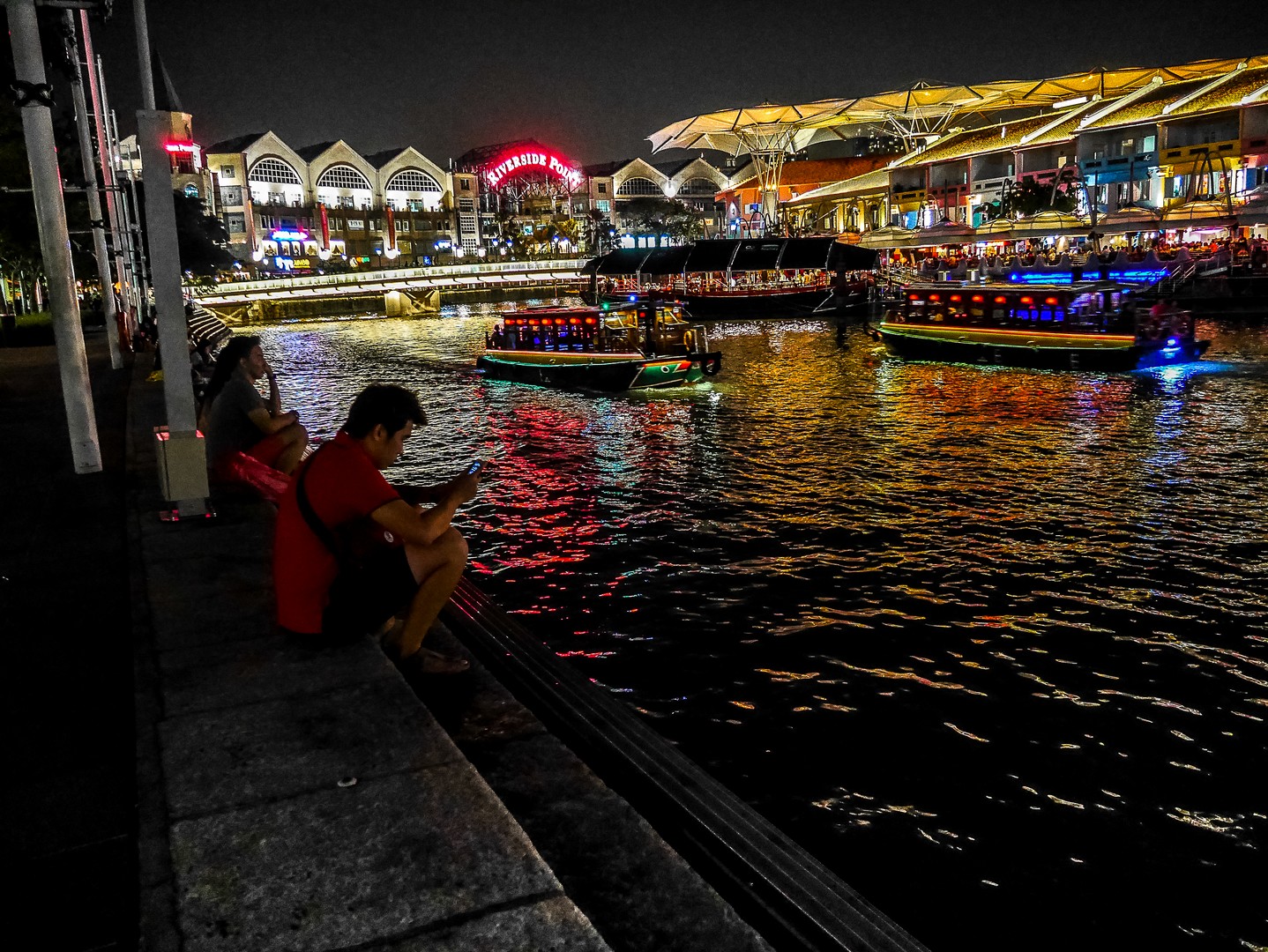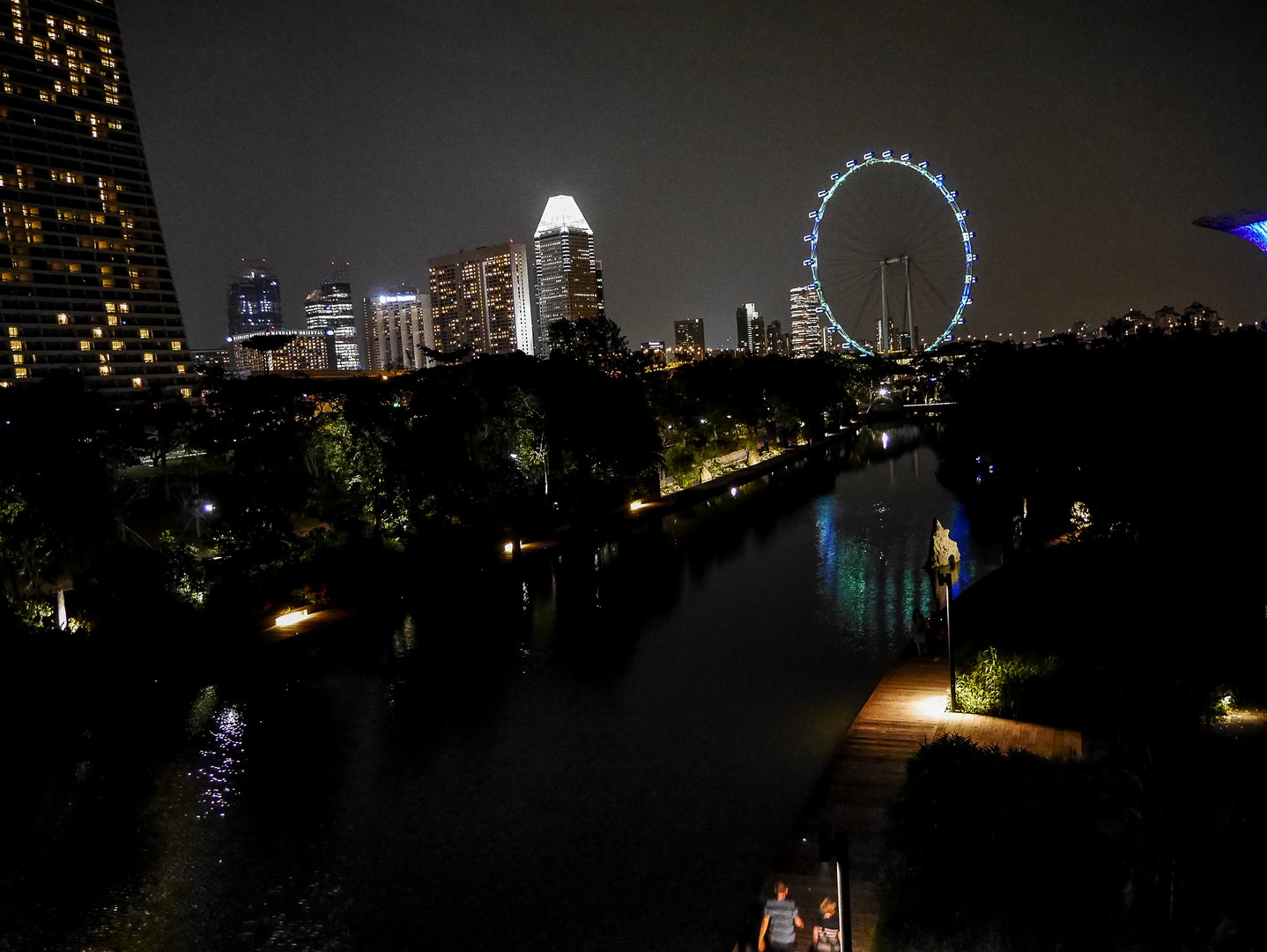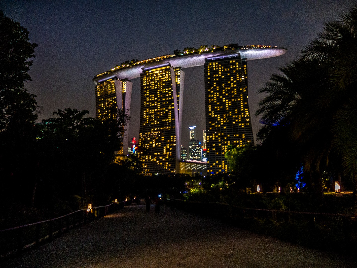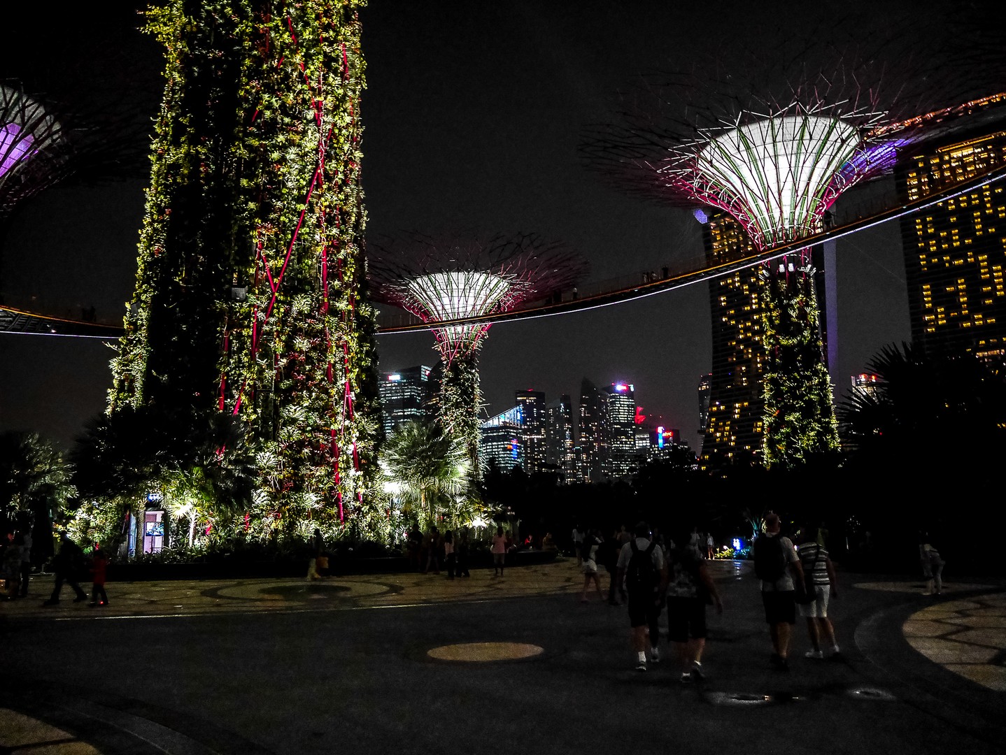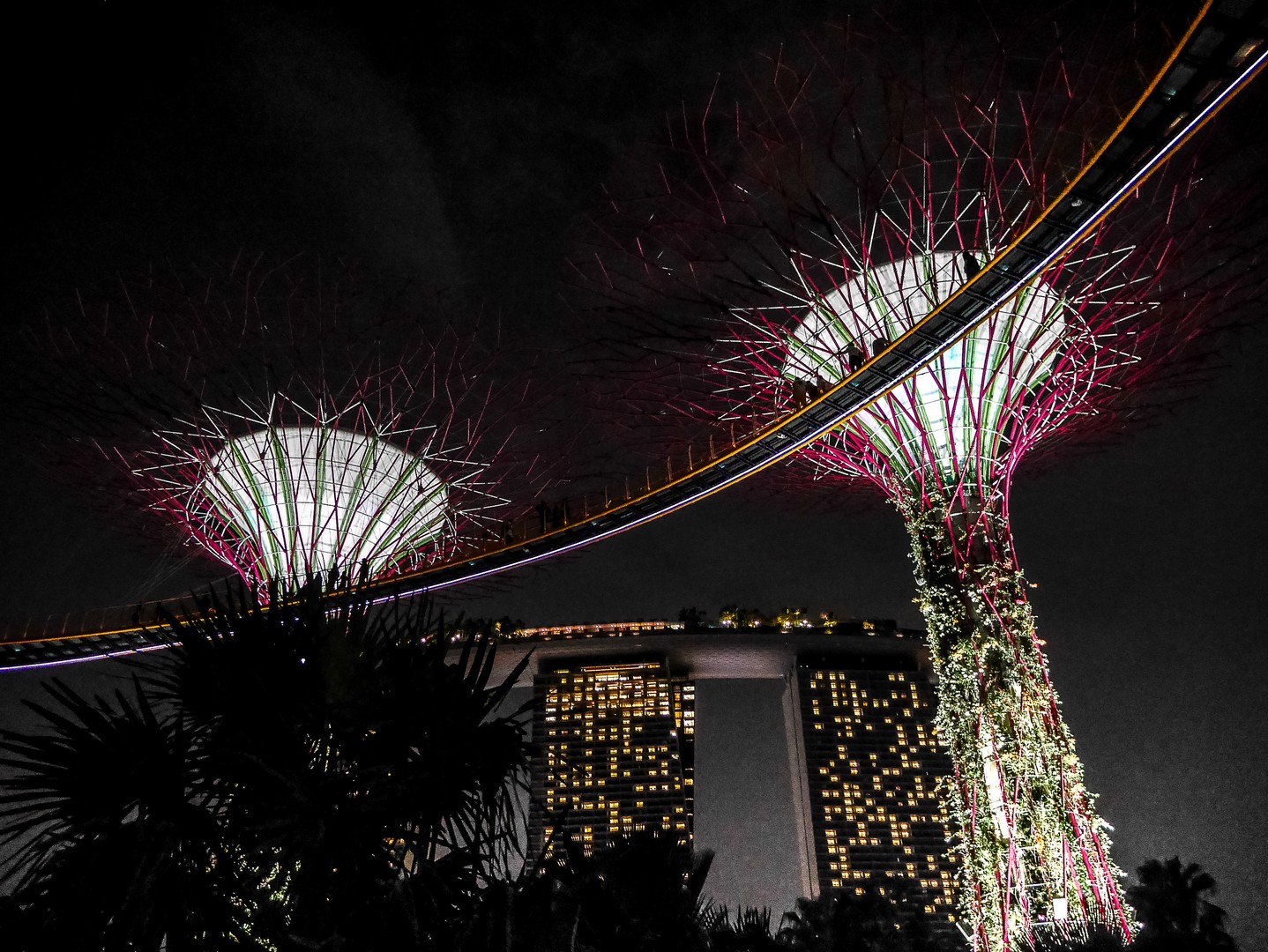 La nuit, les arbres s’illuminent, vivent, se parent de couleurs éclatantes et font le show toutes les demi-heures. C’est sans doute le moment où il y a le plus de visiteurs sur les passerelles… mais depuis le bas, c’est tout aussi spectaculaire. Les arbres se parent de bleu, de vert, de rose, de rose, de plusieurs couleurs à la fois. Un vrai délire psychédélique qui se déroule sur le fond noir et l’air chaud d’une nuit d’Asie. La dernière !
