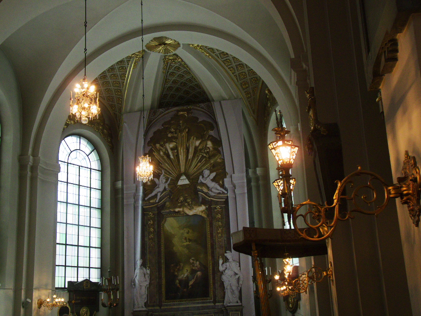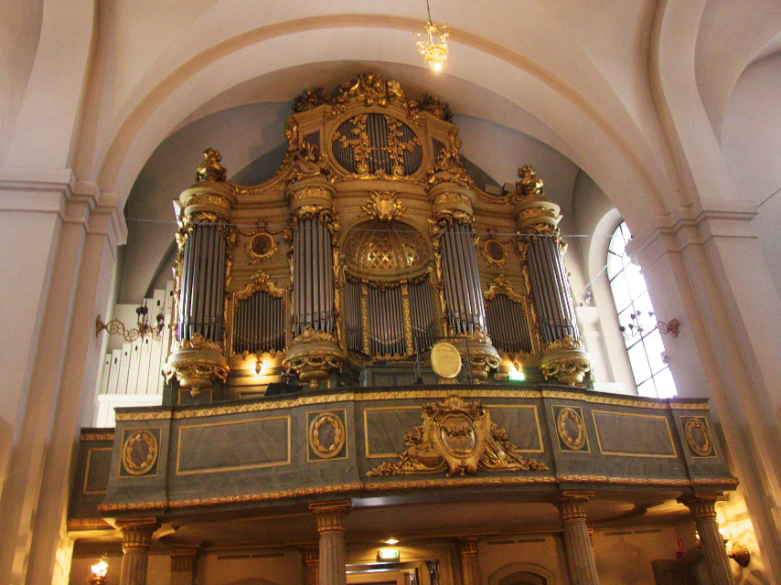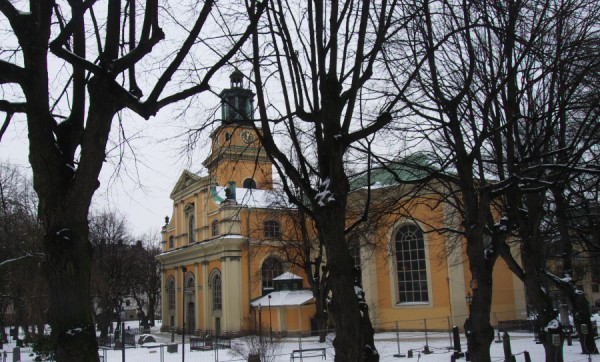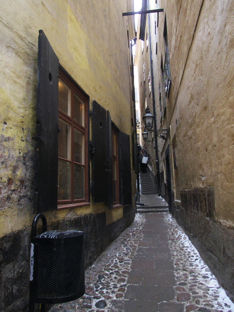 Les gens, nous les rencontrerons sur Götgatan, la grande artère commerciale qui traverse Söder du nord au sud et mène vers Gamla Stan et plus loin la City. Entre deux boutiques ou une librairie, on trouve un magasin de grande marque, un pub, une librairie ou un café… Söder a l’air d’être principalement composé de jeunes trentenaires, au vu de couples se baladant, avec ou sans poussettes mais tout celà reste relativement calme pour un samedi. Peut-être est-ce ce ciel blanc qui semble promettre de la neige? Même les couleurs jaunes et ocres des maisons sont délavées par la météo. Sur le chemin de Slussen, nous faisons un petit détour vers la Maria-Magdalena Kyrka, une jolie église baroque assez ornée pour être protestante! En sortant du cimetière qui entoure l’église, nous empruntons Bellmansgatan, probablement la plus jolie rue de Söder et surtout, lieu de résidence du célèbre journaliste de « Millenium »: Mikael Blomqvist ! Après ce petit hommage (c’est plutôt moi qui suis fan de la triologie de Stieg Larsson, nous rejoignons la rue perpendiculaire de Bastugatan pour emprunter Monteliusvägen, un petit chemin perché sur la falaise de Södermalm et qui offre une vue imprenable sur Gamla Stan, Riddarholmen, l’hôtel de ville et le port… Une superbe promenade qui mène plus loin vers Zinkensdamm, un quartier résidentiel avec un très joli parc où les habitants possèdent des petites cabanes en bois colorées, petit havre de paix en pleine ville! Malheureusement, le temps nous est compté et nous traversons le chaos de Slussen pour être transporté 5 siècles en arrière, dans les rues et ruelles Renaissance de Gamla Stan.