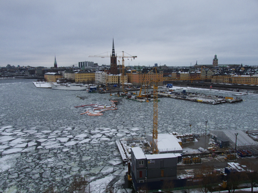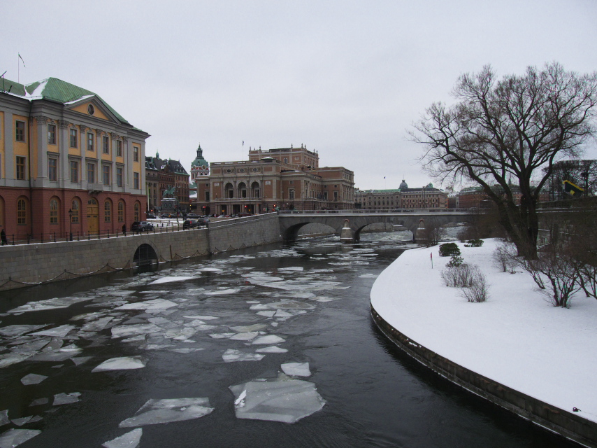 Tout y a des allures de conte de fées : les jolies bâtisses à pignons, les impasses, les cours intérieures, les cafés à lambris, le Palais Royal… C’est aussi le lieu le plus touristique de la ville: suffit de parcourir Vastergatan pour s’en rendre compte: les casques de vikings, Fifi Brindaciers en peluche, chevaux de Dalécarlie en bois et autres trolls se disputent la place dans une boutique sur deux. Comme je suis d’humeur plutôt jouette, j’ai choisi une charmante carte postale du plus beau kitsch représentant le couple princier, Victoria et Daniel, sur fond bleu et or. Elle, en habituée des shootings, sourit de manière très pro et un peu figée, lui, encore gauche et l’air embarrassé, n’a pas encore bien appris le métier puisque loin d’être bien né, il fut le prof de gym de son Altesse avant d’en devenir une lui-même. C’est comme çà sur de nombreuses photos, que ce soit en couple ou en portrait de famille. J’en viens même à plaindre un peu ce pauvre garçon… Cette merveille partira à destination d’un ami adepte de la carte postale. Après avoir mangé le lunch le plus petit et le plus cher de ma vie (32 Euros pour deux cafés, une part de quiche et un panino), nous quittons Gamla Stan et en 50 mètre, on fait une transition de 4-5 siècles à nouveau! Le parlement, situé sur la petite île de Helgeandsholmen date de 1905 et la plupart des bâtiment de la City datent du XIXe-XXe siècle! Sous le pont, l’eau circule rapidement et les blocs de glace viennent se briser en craquements sonores sous les piliers… Poétique à souhait, jusqu’à ce qu’un petit vent piquant vienne nous pousser à avancer.