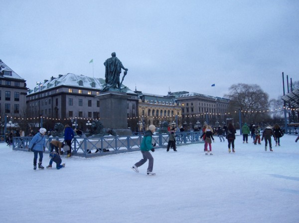 D’ailleurs, nous y voilà, sur Hötorget, où justement le marché commence à plier bagages pendant que les derniers clients se dépêchent de faire leurs achats. Immédiatement, on ne peut manquer l’imposant bâtiment bleu qui fait quasi tout le côté droit de la place: le Konserthuset, qui a l’air un peu sévère malgré sa statue d’Orphée posée devant lui, toute couverte de pigeons.  Lui faisant face, c’est le grand magasin PUB où une certaine Greta Lovisa Gustafsson y fut employée avant de devenir Greta Garbo. Juste le temps de faire un petit détour par Sveavägen, pour saluer les imposantes « Kungstornen », deux tours quasi identiques qui se dressent comme des monolithes dans le ciel de Stockholm et nous réalisons que le soir commence déjà à tomber. Il est temps de prendre l’apéritif! J’emmène donc Sad vers Kungsträdgården. Cet ancien potager royal est une gigantesque esplanade bordée à une extrémité par des cafés, des deux côtés par de belles demeures de style classique et à l’autre bout, par une scène vide. Elle est utilisée à la belle saison mais en attendant c’est une patinoire qui occupe l’espace! Nous restons un bon moment à regarder des patineurs de tous âges, glisser plus ou moins élégamment sur la glace! Force est de constater que la plupart se débrouille très, très bien (on se demande bien pourquoi!)!