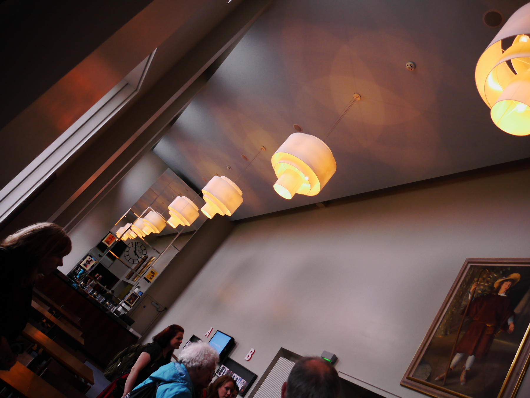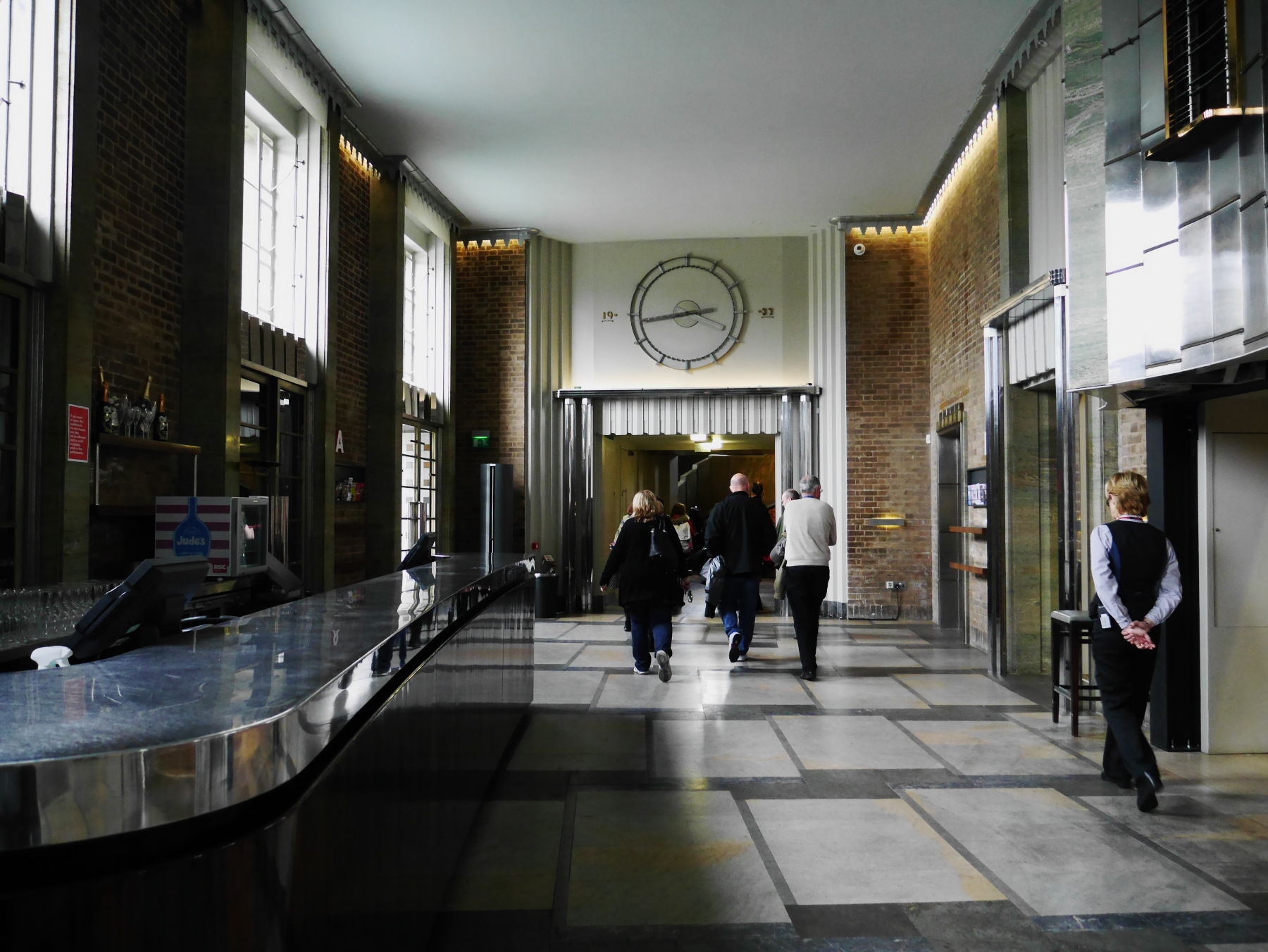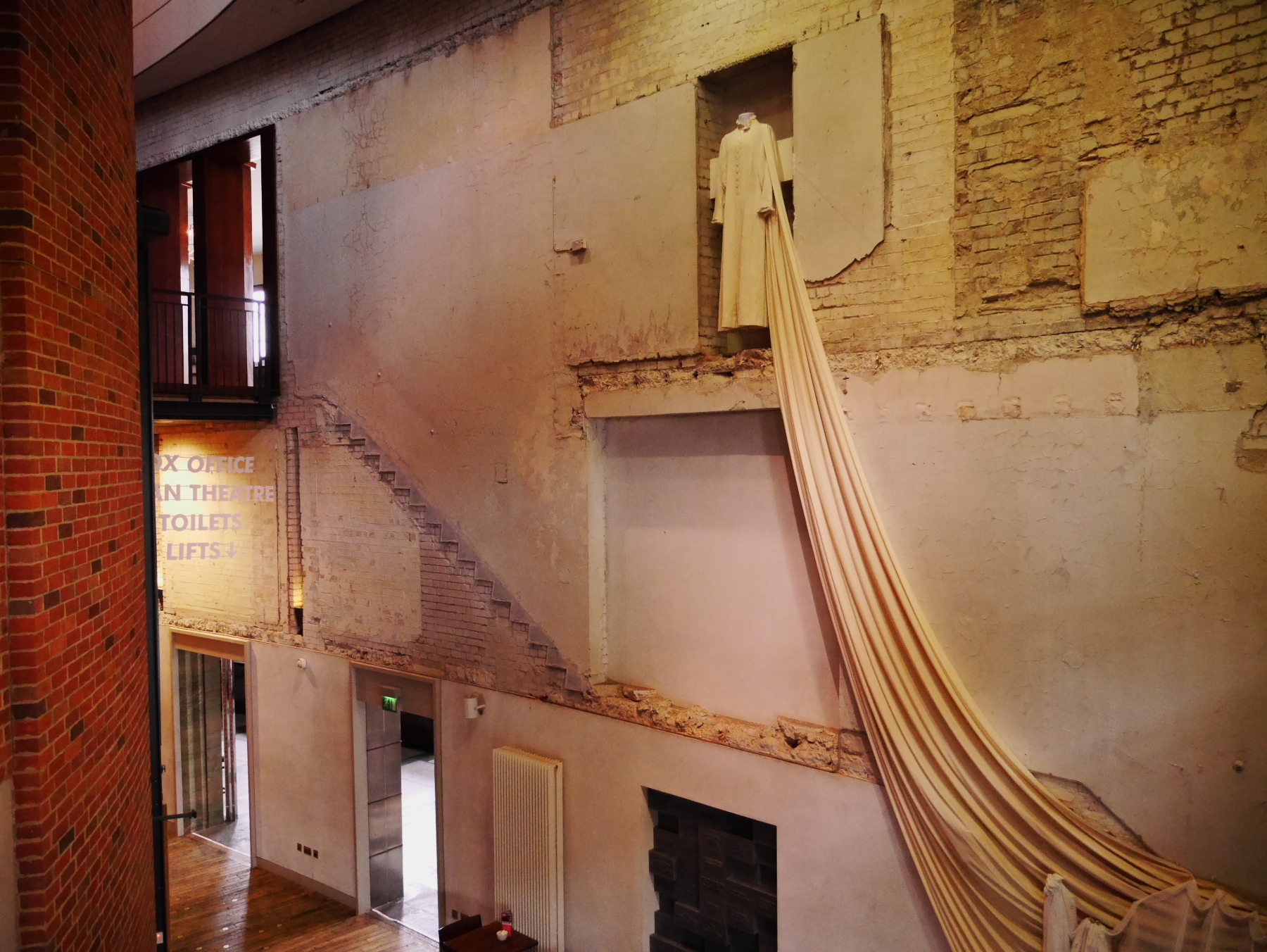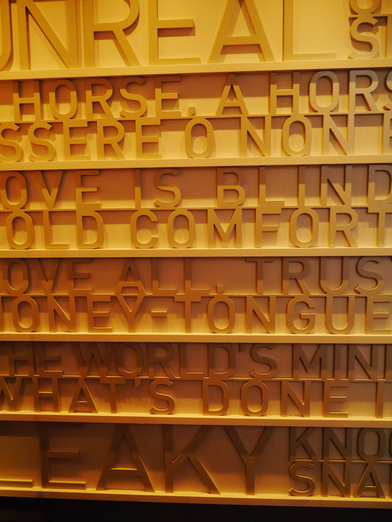 Maintenant que nous avons appris à connaître l’homme, nous allons voir le lieu où son culte lui est rendu: la théâtre. Et pas n’importe lequel: celui de la Royal Shakespeare Company. Judicieusement établi en dehors du centre-ville (c’est un bâtiment assez énorme, il paraîtrait complètement incongru ailleurs), il fut construit en plusieurs étapes. En 1875, un théâtre y fut déjà construit, théâtre qui fut détruit par le feu en 1926. Il est à présent reconstruit, tout à côté du Royal Shakespeare Theatre, sous le nom de Swan Theatre. Suite à cet incendie, un nouveau théâtre fut commissionné en 1932, l’œuvre d’Elizabeth Scott ouvrit au public. Ce fut des premiers grands édifices publics réalisé par une femme architecte. Le théâtre fut complètement reconstruit entre 2007 et 2010 mais l’entrée de 1932 et son décor art-déco ont été gardés. Ils servent maintenant de café. Cette déco élaborée héritée du passé est en fort contraste avec le côté « brut de décoffrage » du reste du théâtre. Les proportions sont immenses, les murs de briques sont à nus et souvent décorés de costume ayant écrit les belles de la Royal Shakespeare Company. Parmi des noms de sociétaires illustres: Richard Burton, Ian McKellen, Patrick Stewart, Judi Dench… que la crème de la crème des acteurs britanniques ! Nous pénétrons dans le théâtre (à nouveau, comme au Royal National Theatre, les photos sont interdites).