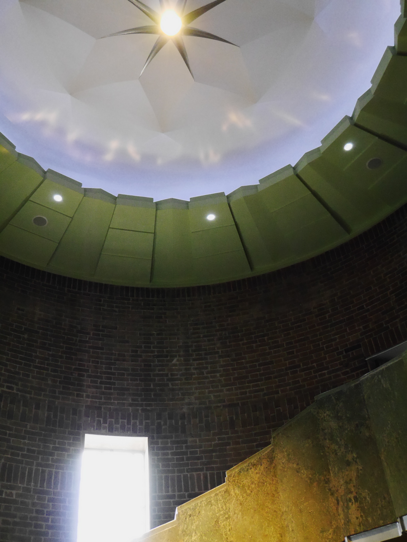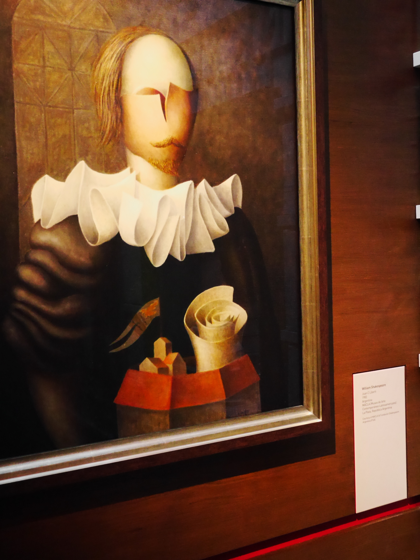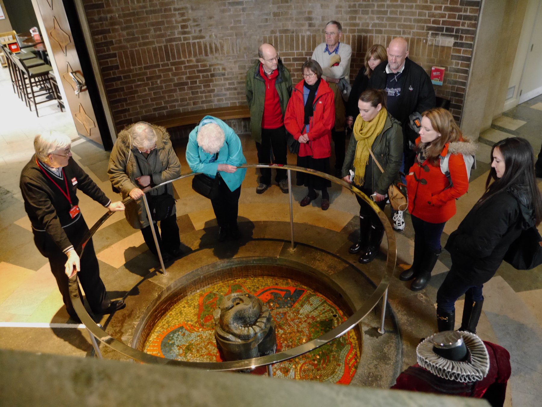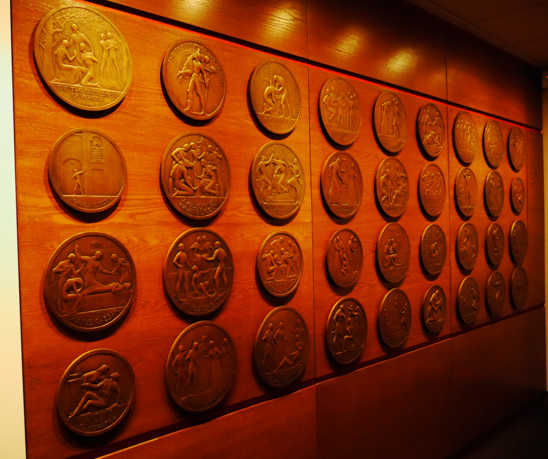 Maintenant que nous avons appris à connaître l’homme, nous allons voir le lieu où son culte lui est rendu: la théâtre. Et pas n’importe lequel: celui de la Royal Shakespeare Company. Judicieusement établi en dehors du centre-ville (c’est un bâtiment assez énorme, il paraîtrait complètement incongru ailleurs), il fut construit en plusieurs étapes. En 1875, un théâtre y fut déjà construit, théâtre qui fut détruit par le feu en 1926. Il est à présent reconstruit, tout à côté du Royal Shakespeare Theatre, sous le nom de Swan Theatre. Suite à cet incendie, un nouveau théâtre fut commissionné en 1932, l’œuvre d’Elizabeth Scott ouvrit au public. Ce fut des premiers grands édifices publics réalisé par une femme architecte. Le théâtre fut complètement reconstruit entre 2007 et 2010 mais l’entrée de 1932 et son décor art-déco ont été gardés. Ils servent maintenant de café. Cette déco élaborée héritée du passé est en fort contraste avec le côté « brut de décoffrage » du reste du théâtre. Les proportions sont immenses, les murs de briques sont à nus et souvent décorés de costume ayant écrit les belles de la Royal Shakespeare Company. Parmi des noms de sociétaires illustres: Richard Burton, Ian McKellen, Patrick Stewart, Judi Dench… que la crème de la crème des acteurs britanniques ! Nous pénétrons dans le théâtre (à nouveau, comme au Royal National Theatre, les photos sont interdites).