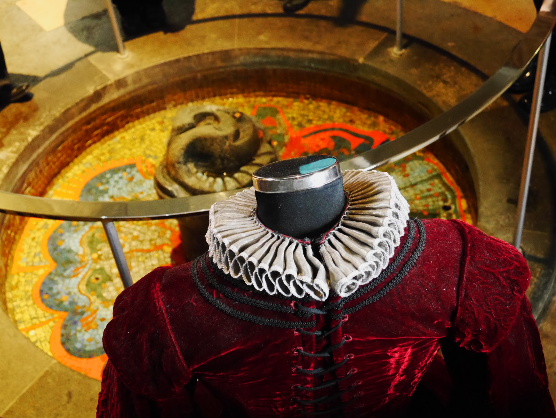 Plus de 1000 personnes peuvent prendre place dans la salle, un espace assez simple, sans fioritures, mais confortable, qui a été pensé comme les théâtres à l’époque élisabéthaine. Un théâtre qui était très proche de son public (au point que l’on pouvait mettre les coudes sur la scène) avec des entrées en scène multiples. Les acteurs font leurs entrées depuis les coulisses, comme d’habitude mais il y a deux plate-formes qui permettent aux acteurs d’arriver depuis les couloirs… On aurait adoré voir une représentation de Romeo et Juliette ou du Songe d’une nuit d’été, mais pas de chance! Par contre, on nous laissez jouer avec quelques costumes à disposition des spectateurs. Je m’emparer d’un gilet à passementerie et d’un bonnet (très « Gentilshommes de Vérone« )… dommage qu’il n’y ait pas eu le costume noir d’Hamlet, ni son crâne: je me sentais d’humeur à monologuer ! 😉