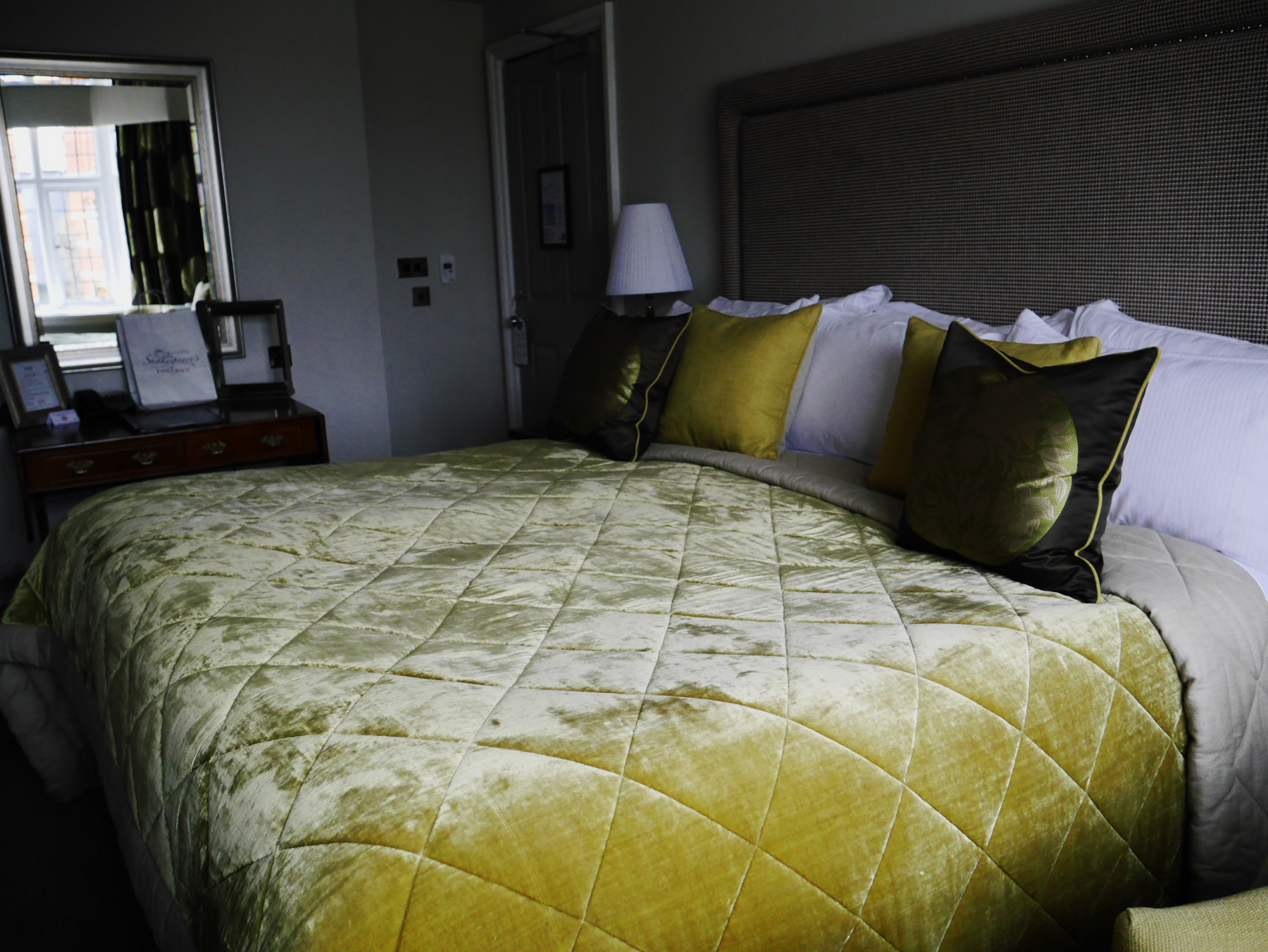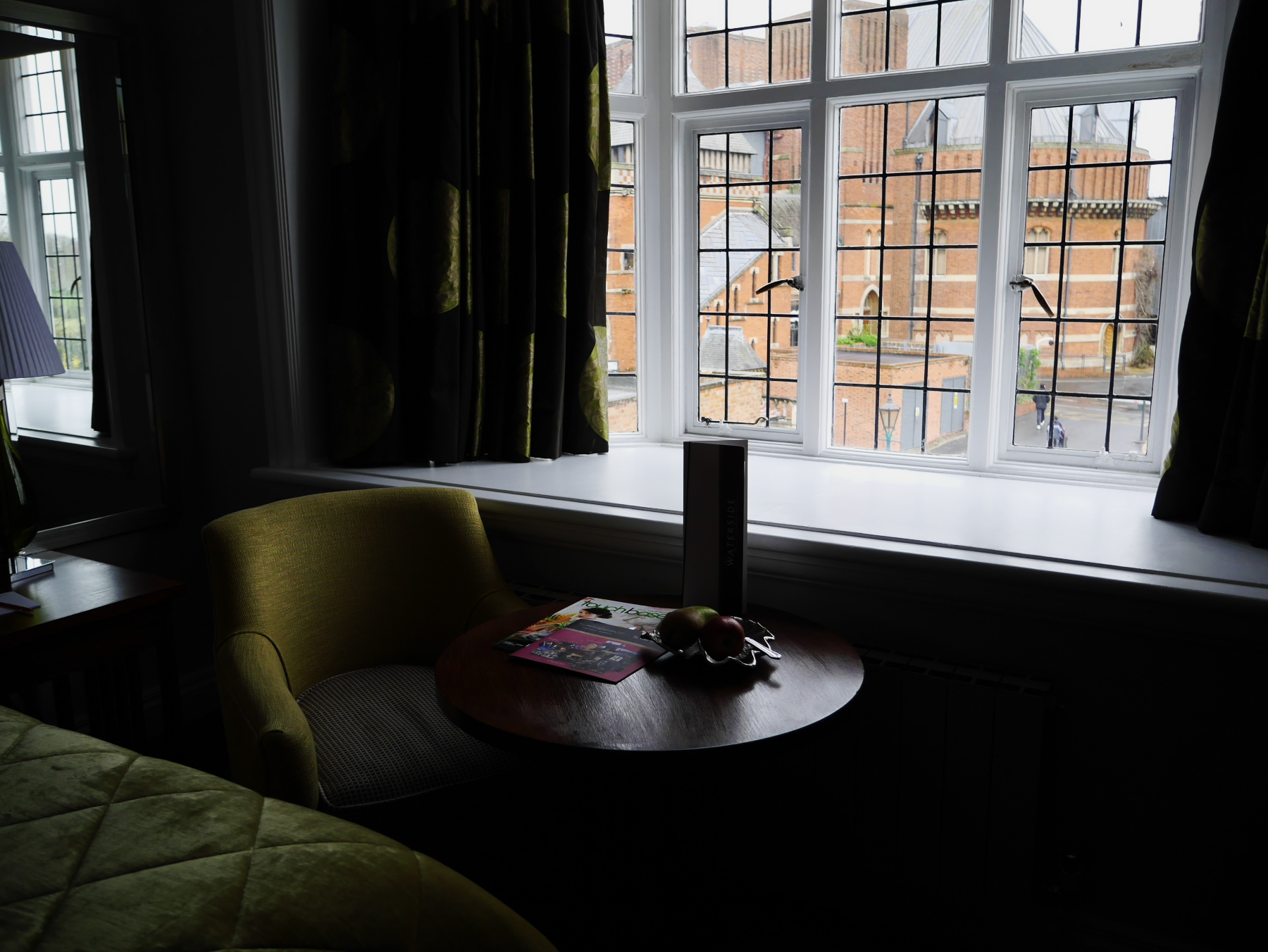 Bien sûr il y a des hôtels de chaînes comme le Mercure mentionné plus haut ou le Travellodge, plus doux pour ton budget, Lectrice, Lecteur mais il y a aussi de chouettes boutiques hotels comme The Arden, Plutôt qu’un hôtel, on a l’impression d’entrer dans la maison de campagne d’une riche famille, avec son plancher et ses cheminées. Sa proximité en font un peu l’hôtel « officiel » du théâtre. Toutes les chambres ont des noms d’arbres et les trouver relève un peu du jeu de piste (j’ai bien erré dix minutes dans les nombreux couloirs pour trouver la mienne, mais une fois votre chambre trouvée, et la porte refermée, on y trouve un havre de paix: ma chambre st un peu petite, surtout pour ce grand lit mais est toute fraîche avec ses couleurs vertes, grises et blanches mais surtout, j’ai un chouette petit fauteuil près de l’une fenêtre qui donne sur le Swan Theatre et le reste du complexe de la RSC. Une bien jolie vue pour bloguer!