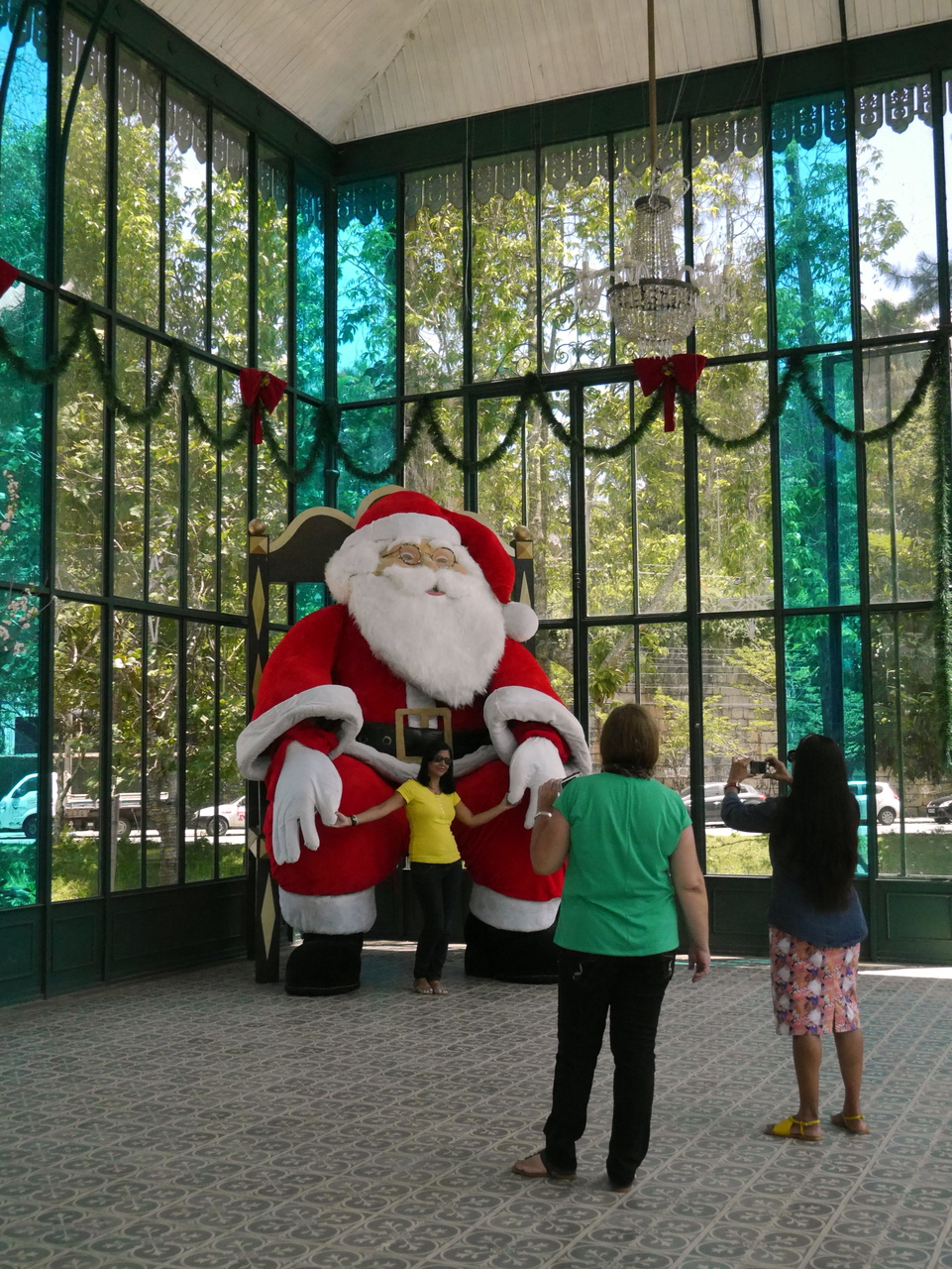 MM : Oui, oui, oui... nous allons à Petrópolis qui est à deux / deux heures et demie dans les montagnes près de Rio et c'est en fait l'ancienne capitale impériale d'été du Brésil. Elle a eu des architectes allemands, à mon avis, ça a aussi un peu influencé et il y a un très joli petit marché de Noël mais évidemment, c'est en plein été où il fait 40 degrés. Donc à Petrópolis, on trouve le Palais de Cristal qui est magnifique et c'est là que se trouve le marché de Noël. Il est très mignon avec un Père Noël géant, une cheminée... donc, c'est assez comique de voir les Brésiliens qui vont faire des photos devant la cheminée alors qu'il fait 35-40 degrés dehors, même en montagne.