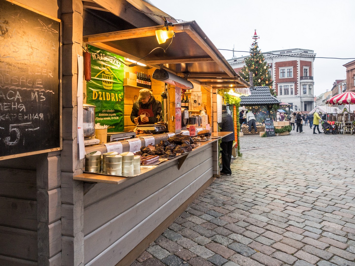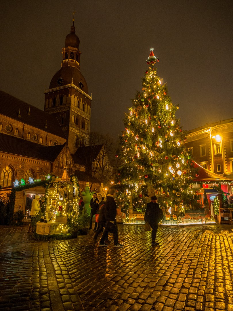 MM : Voilà, en bord de Baltique. Riga a un petit marché de Noël, il y en a même deux,mais le principal est sur la place du Dôme où il y a la cathédrale et ce qui fait tout son charme, c'est l'architecture de Riga. On est dans le centre-ville qui est un centre médiéval avec sa cathédrale et son clocher en cuivre, c'est très particuliers et il y aussi le fait que les Lettons apparemment adorent la viande fumée donc, tout est fumé : le poulet, le porc, le poisson... Et donc c'est bizarre de voir un poulet complètement sans peau, qui est lisse comme des fesses de bébé est complètement noir !
