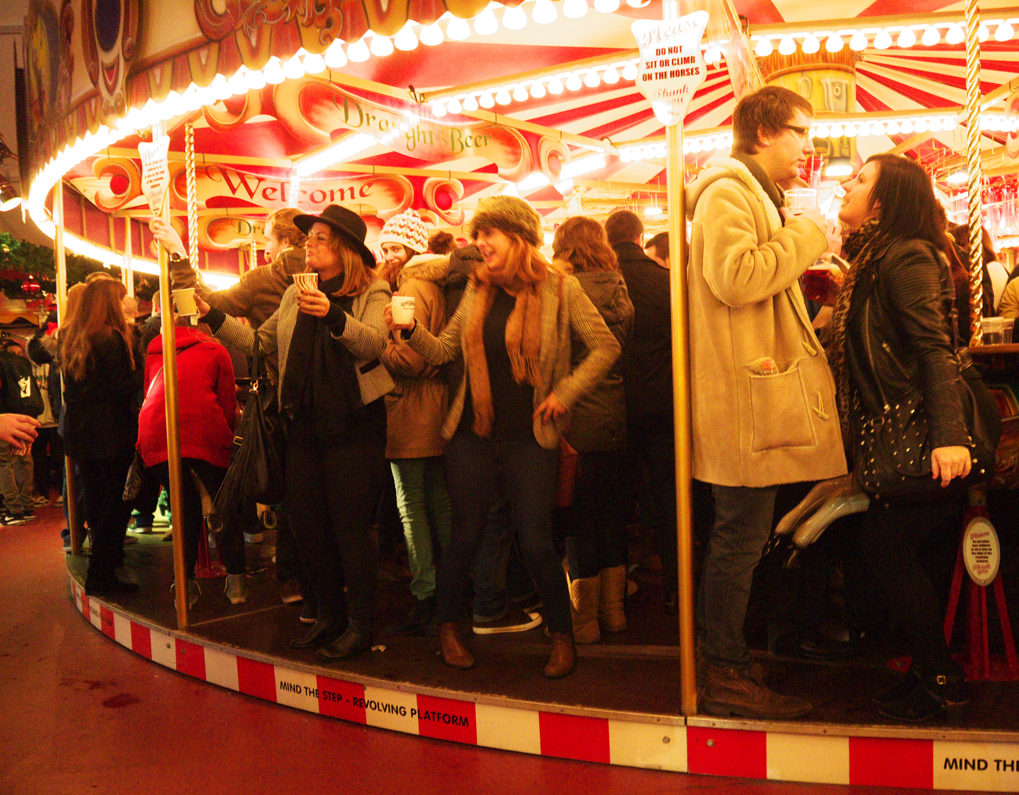 MM : Winter Wonderland qui est situé à Hyde Park et là c'est vraiment le grand show : il y a des attractions comme dans un parc avec une espèce de tour où on monte et on vous faite redescendre à grande vitesse, il y a un théâtre, des représentations de spectacles sur glace, patinoire... évidemment, il y a les chalets traditionnels et puis il a aussi une espèce de manège qui tourne où tout le monde est debout et tout le monde boit.