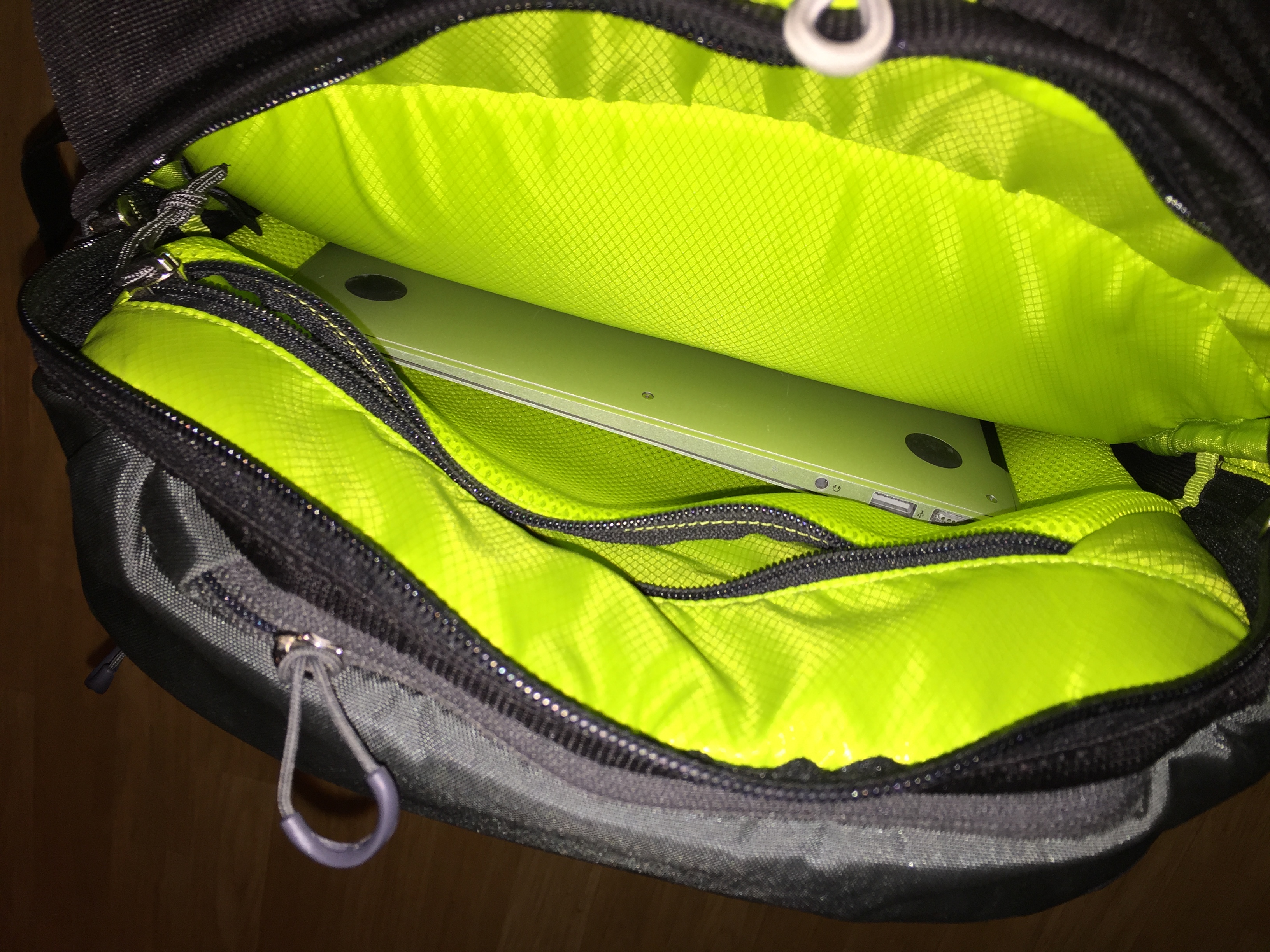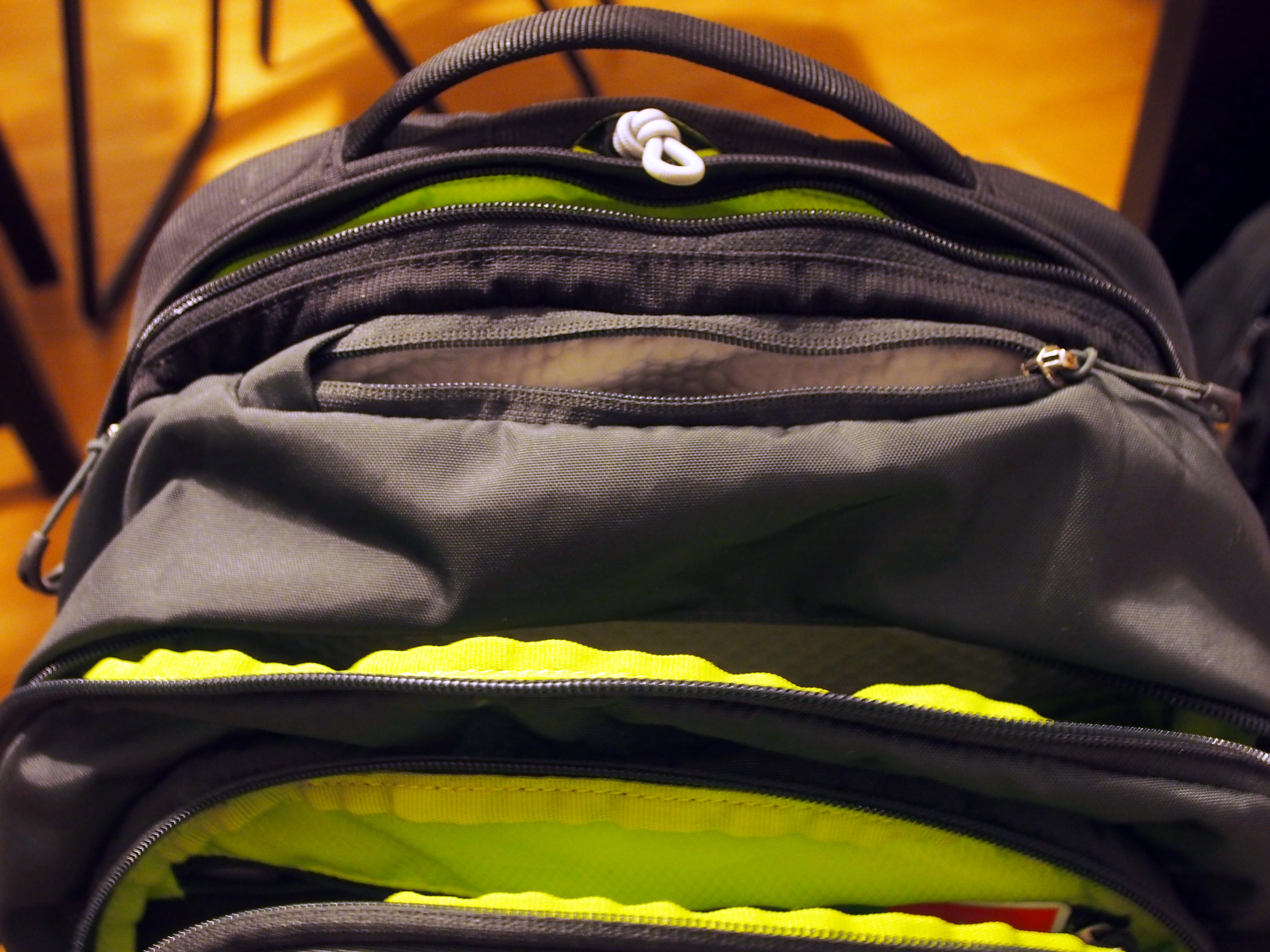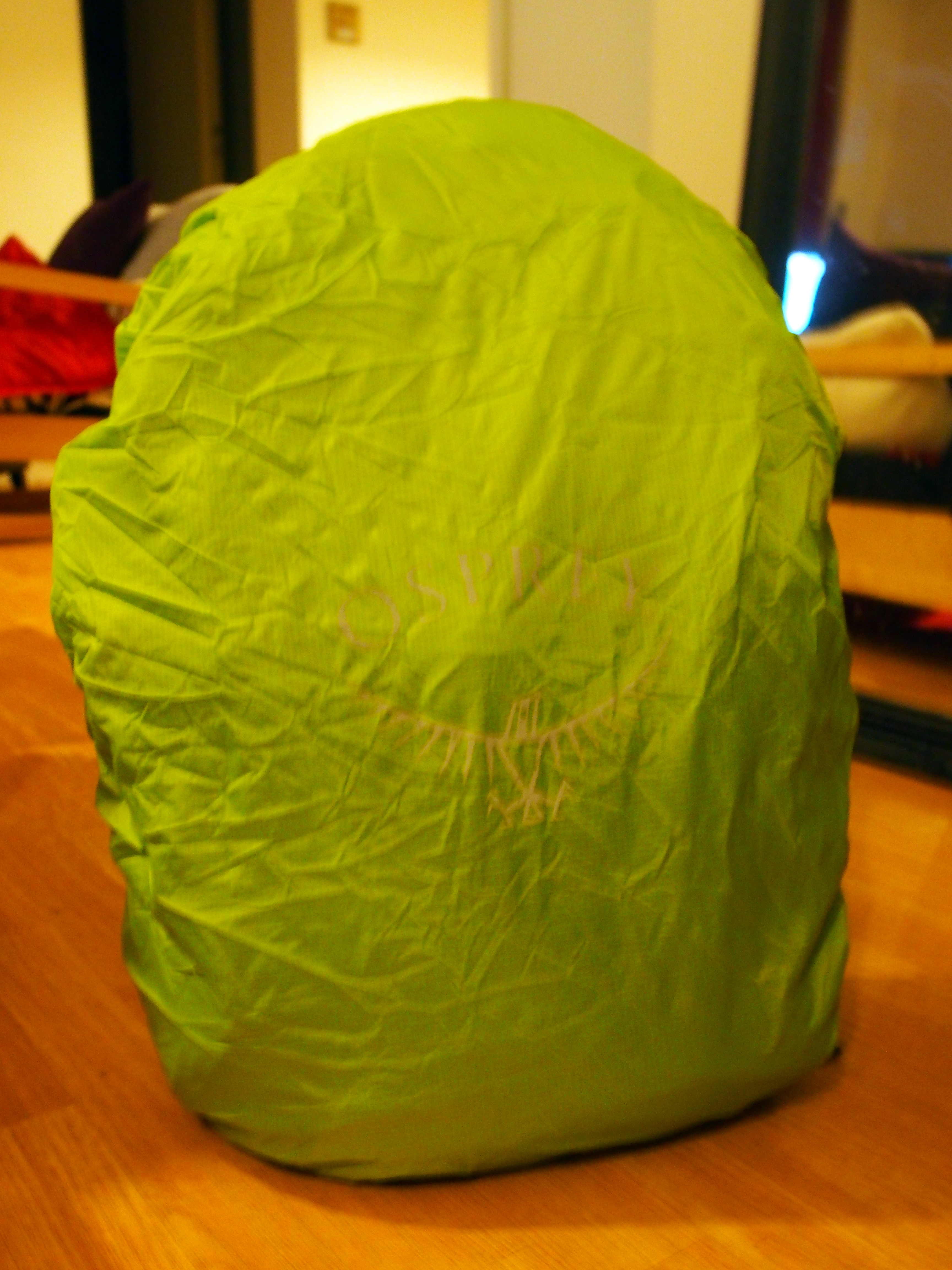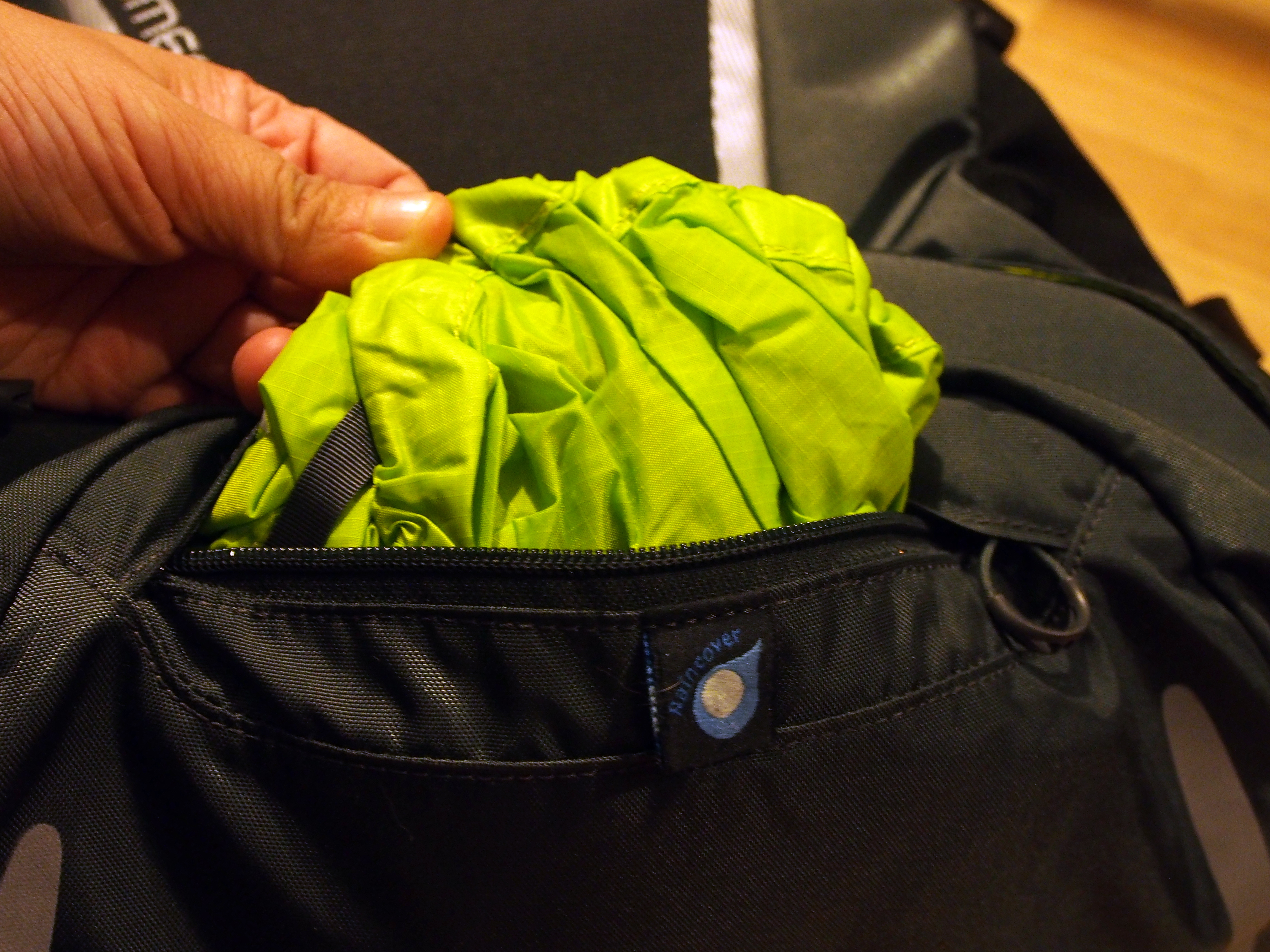 Et juste en dessous, presque bien caché, se trouve le compartiment de la housse de protection du sac. Et là, j’ai jubilé ! C’est un énorme plus ! Si vous circulez dans la pluie ou dans un environnement boueux, c’est une vraie bénédiction ! De couleur verte presque fluo pour être bien visible quand il fait sombre, la housse doit être bien ajustée autour du sac pour qu’elle soit efficace. Testée en catastrophe sous un déluge en Indonésie, je ne l’ai sans doute pas serrée comme il le fallait et la pluie a réussi à passer à certains endroits. Néanmoins, le fait qu’elle soit comprise dedans fait vraiment la différence !