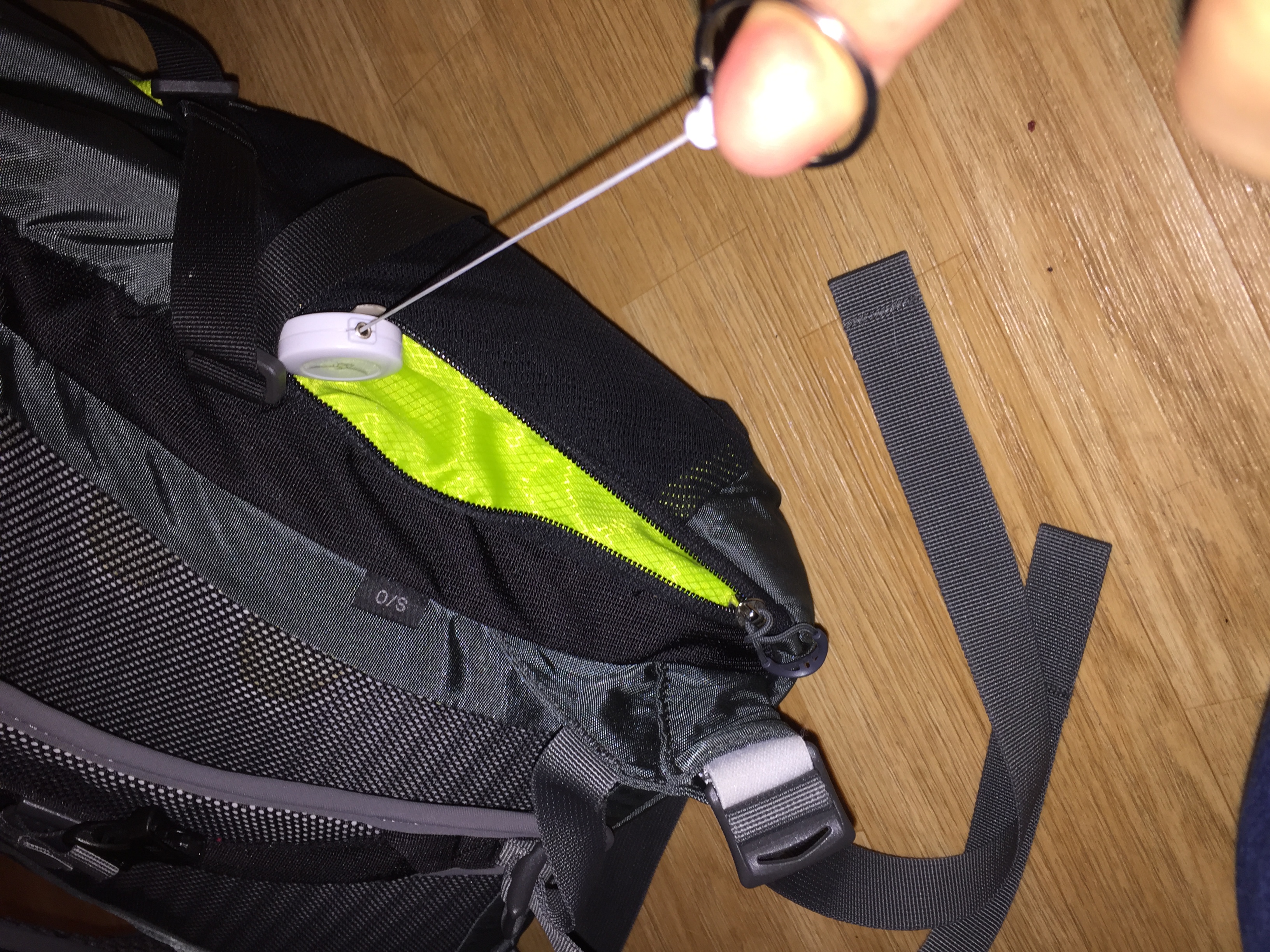 Encore plus caché, sur le côté gauche en bas du sac, on trouve un petit compartiment zippé avec un porte clé où l’on peut stocker de petits objets x (comme un porte-monnaie ou un couteau-suisse). Pas besoin d’ôter le sac de son dos, ce compartiment est fait pour être accédé facilement avec une main libre.