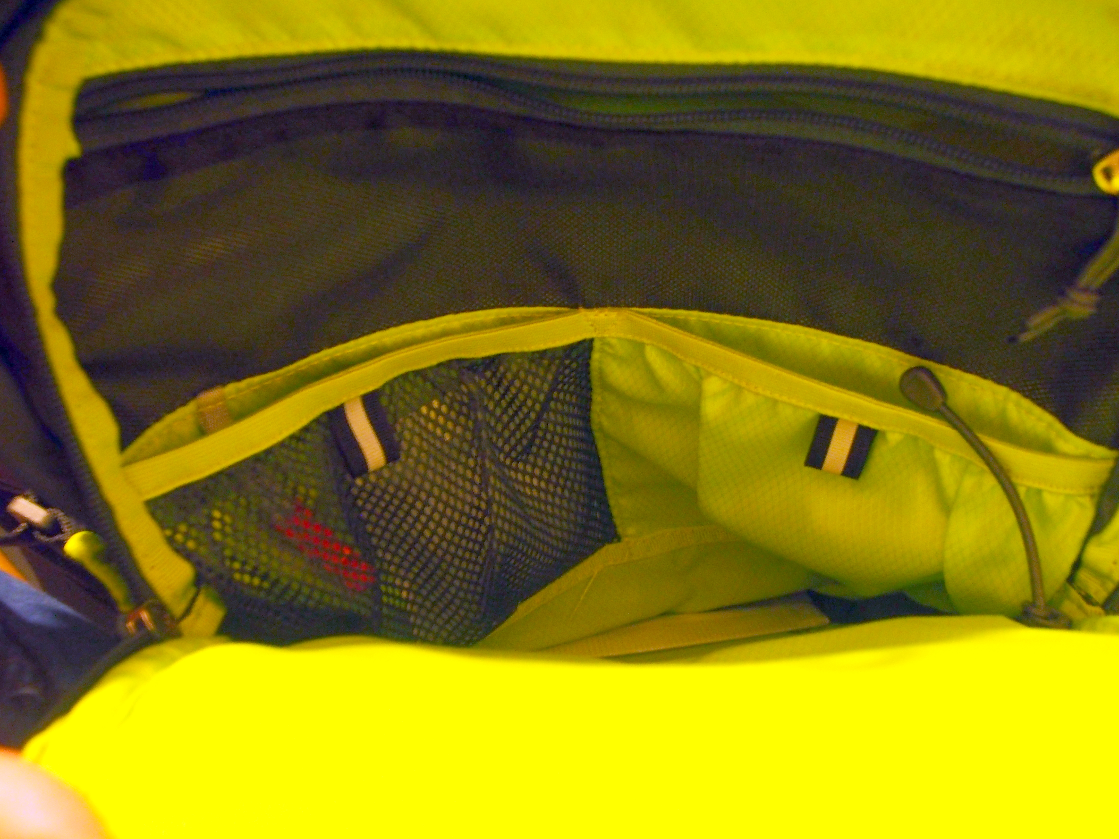 La première chose que j’ai remarqué par rapport à mon sac « Quasar », c’est le nouveau panneau dorsal parsemé d’arrêtes avec un filet par dessus appelé « AirScape ». C’est censé permettre une meilleure ventilation du dos et en effet, je confirme après utilisation en randonnée en plein soleil, mon dos n’a pas ruisselé comme ce pouvait être le cas avec le Quasar 28 (un de mes griefs lors de ma critique du sac). Pour compléter cette aération, l’encolure est complètement différente : au lieu de partir directement du sac, le harnais est relié au sac par des sangles parallèles en stretch au niveau des épaules. Résultat ; plus de confort et plus de ventilation. Ces élastiques se prolongent sur le haut du sac et peuvent être ajustées à votre morphologie.