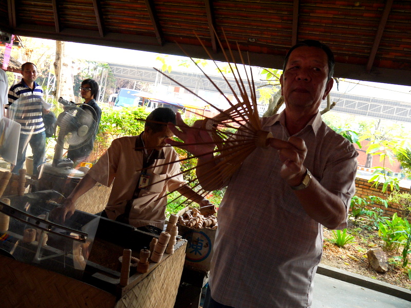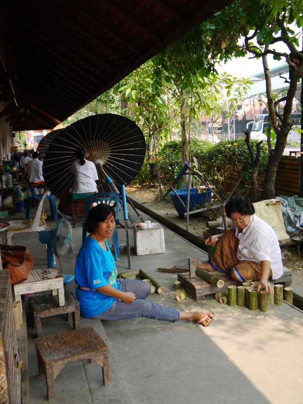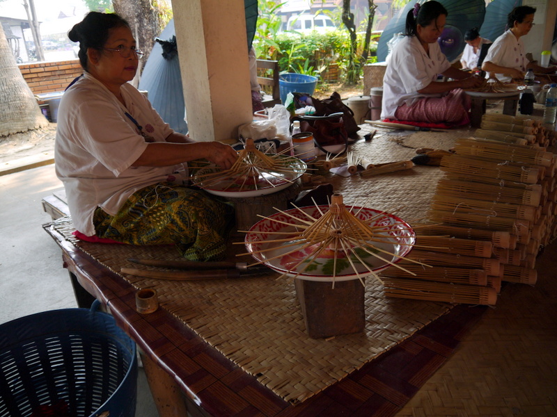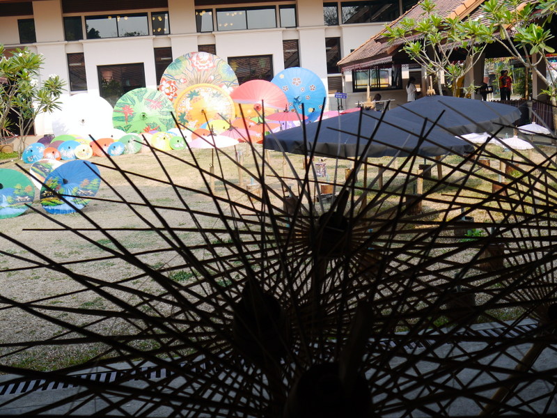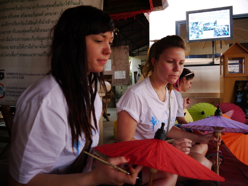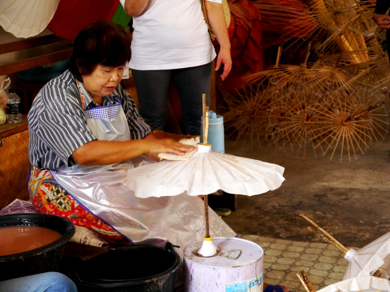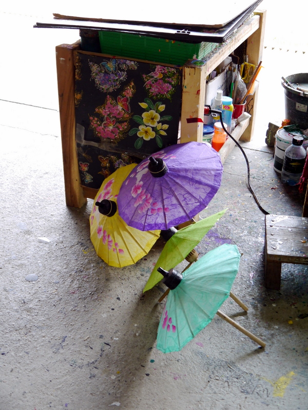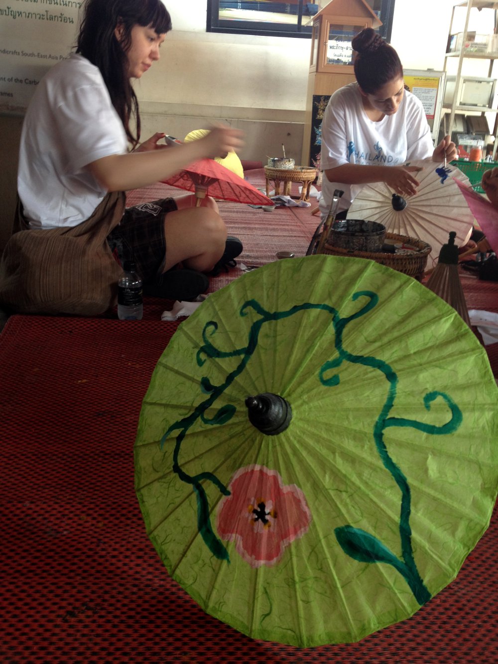 Au cas où nous ne l’aurions pas remarqués les éléphants sont une partie importante de la culture thaïlandaise Il suffit de voir le nombre de fois où les bête à trompes sont représentées sur les ombrelles que l’on vend à l’Umbrella Making Center de Bo Sang. La région de Chiang Mai est connue pour la fabrication d’ombrelles et de parasols en papier de bois de mûrier. Depuis la fabrication du papier en passant par toutes les étapes de l’élaboration des ombrelles, nous saurons TOUT sur le sujet. En prime, ce sera à nous de customiser nos propres ombrelles vierges de tout ornement. On nous mets de pots de gouaches de couleurs primaires, du blanc, du noir, quelques modèles et voilà… laisse exprimer ta créativité! Je prends possession d’une ombrelle verte et m’applique à dessiner quelque chose qui vient complètement de moi! Donc, voici le résultat (disons que je dois travailler les nuances et la finition):