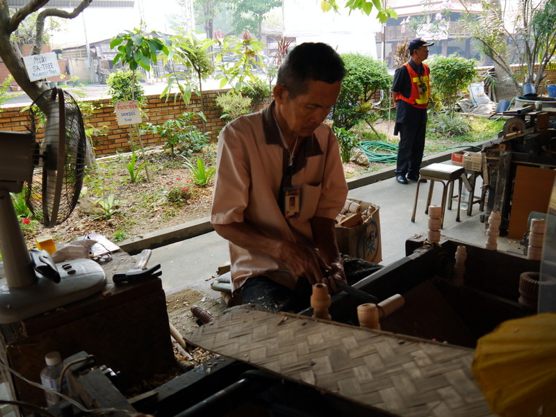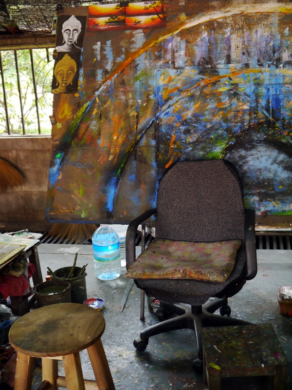 Premièrement, nous assistons à show démontrant ce que savent faire les éléphants: obéissance, habilité, équilibre (malgré leur taille, les éléphant sont assez agiles et ont le pied sûr), force, petits tours comiques avec les mahouts (les gardiens d’éléphants), peinture… tout cela me semble un peu forcé à première vue mais le public à l’air ravi! Après ce petit show, nous sommes invités à faire une ballade en nacelle sur le dos d’un éléphant. Une grande première pour moi ! Je partage ma nacelle avec Emma… et nous voilà parties, sous un ardent soleil, au rythme du pas lourd de l’éléphant. En fendant la forêt de haut, je me rêve princesse de Siam, il ne manque que la tenue et un tigre apprivoisé marchant à nos côtés. Malgré mon émerveillement, je me demande ce que çà fait à notre superbe mâle que de supporter trois humains sur le dos, même si Emma, le mahout et moi sommes de petits formats. Un doute m’assaille… Et si je participais à un système honteux d’exploitation d’animaux ? Tout d’un coup, je me sens mal à l’aise… Le ballade se termine. On nous emmène à la fabrique de papier car tenez-vous bien, on peut fabriquer du papier à partir de déjection d’éléphants! Un processus en plusieurs étapes afin d’éliminer les impuretés et qui transforme les crottes en pâte jaune sans aucune odeur. Le résultat: un papier épais, fibreux, d’une couleur orange et qui semble être une bonne base pour l’aquarelle! Celui-ci peut aussi être blanchi et devient un cadeau dont les touristes raffolent.