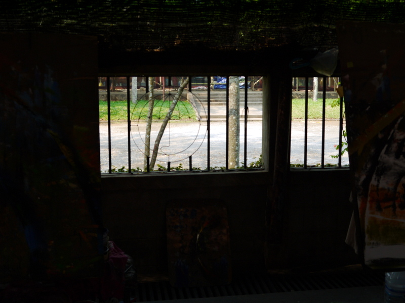 Bon… au début j’avais l’idée de dessiner un paquet de frites fumant en volutes japonisantes… mais çà n’allait pas avec le vert. Dommage (ou pas)! Pendant que les autres finissent de peindre et que nos ombrelles sèchent au soleil, Laure et moi faisons un petit tour dans la boutique. De toutes les tailles, de toutes les couleurs, peintes ou imprimées, abstraites ou figuratives… il y en a de toutes les couleurs et pour tous les goûts (un petit plus pour le kit mini-ombrelle, gouaches et pinceaux pour ramener à des petites filles). Alors que nous nous dirigions vers la sortie, le Monsieur qui nous a servi de guide à travers le centre vient faire un brin de causette puis me demande à brûle pourpoint ma date de naissance. Je le lui dis, il se tait un moment, me regarde attentivement, me met une main sur l’épaule et me dit: « Ne pas lire de roman triste ou regarder de films tristes. Pas pour le moment. Ce n’est pas le moment de tomber amoureuse, ni de se rendre triste. Concentrez-vous sur votre travail. Le reste, ça viendra plus tard. Tes années de chances sont… » Et là, ma mémoire me fait défaut (alors que c’est là que j’aurai du prêter le plus d’attention). Je reste paf. C’est la première fois qu’on me lit spontanément mon avenir, spécialement par un vendeur d’ombrelle. Et crois-moi, lectrice, lecteur, çà fait bizarre. Il se tourne vers Laure qui prend un petit air craintif mais obtempère. Je garde secrète une prédiction qui lui appartient mais ce petit moment surréaliste dans ce qui était une visite bien cadrée nous a fait à la fois frissonner et sourire. Pour se remettre, on jette un oeil à des tableaux contemporains qui sont juste disposés en arrière fonds dans l’atelier, comme une arrière pensée, alors que ceux-ci sont magnifiques!