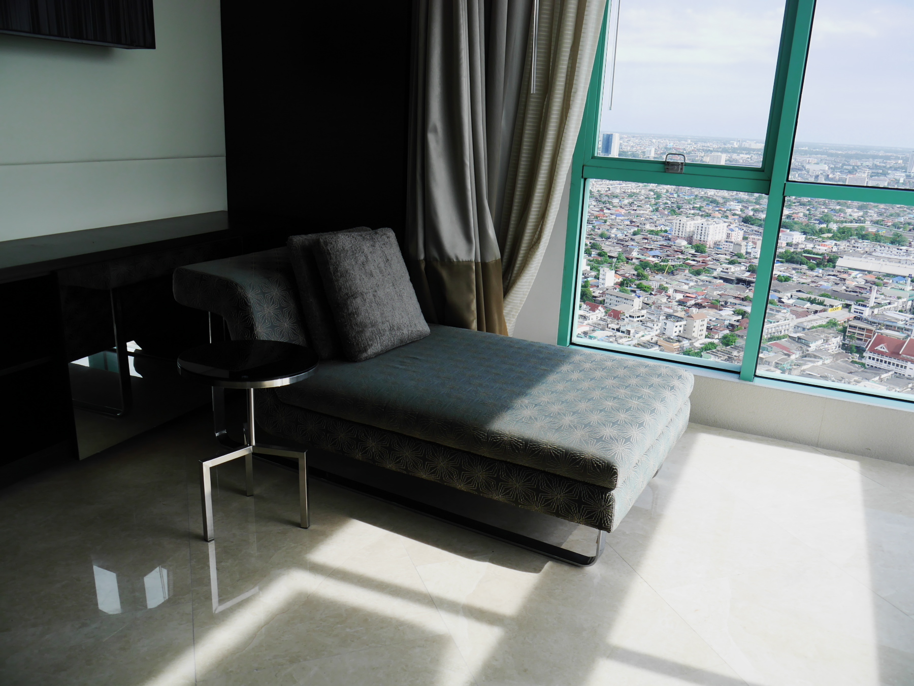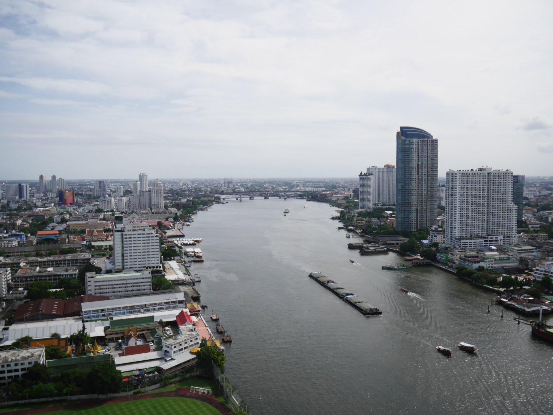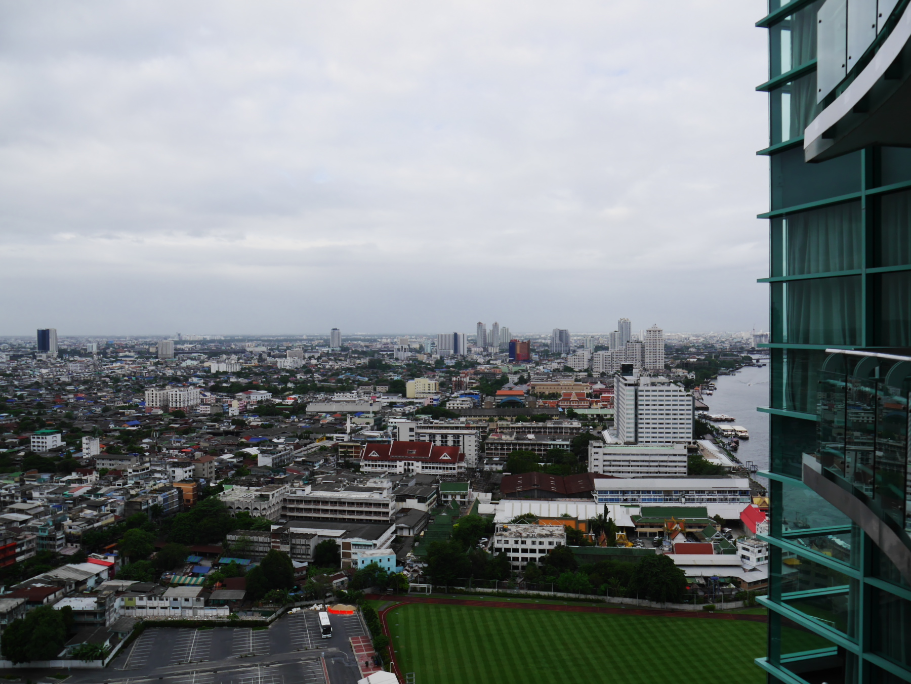 Arrivé à 6 heures du matin, notre petit groupe belgo-belge n’a pas pris beaucoup de temps pour rejoindre le Chatrium Hotel Riverside, un hôtel assez récent situé au bords du fleuve Chao Phraya. Depuis ma terrasse, je contemple la mégapole, embrumée par le manque de sommeil et le décalage horaire, malgré la liaison directe depuis Bruxelles (merci Thai Airways). Nos hôtes nous ont clairement gâté, j’hérite d’une suite immense, dans les tons blancs, crèmes, noirs et verts… Cuisine, coin salon, salle de bain gigantesque, le plus difficile des résidents ne trouvera rien à redire sur les équipement et la superficie des chambres (les chambres « simples » font 60m2, la taille de mon appartement).