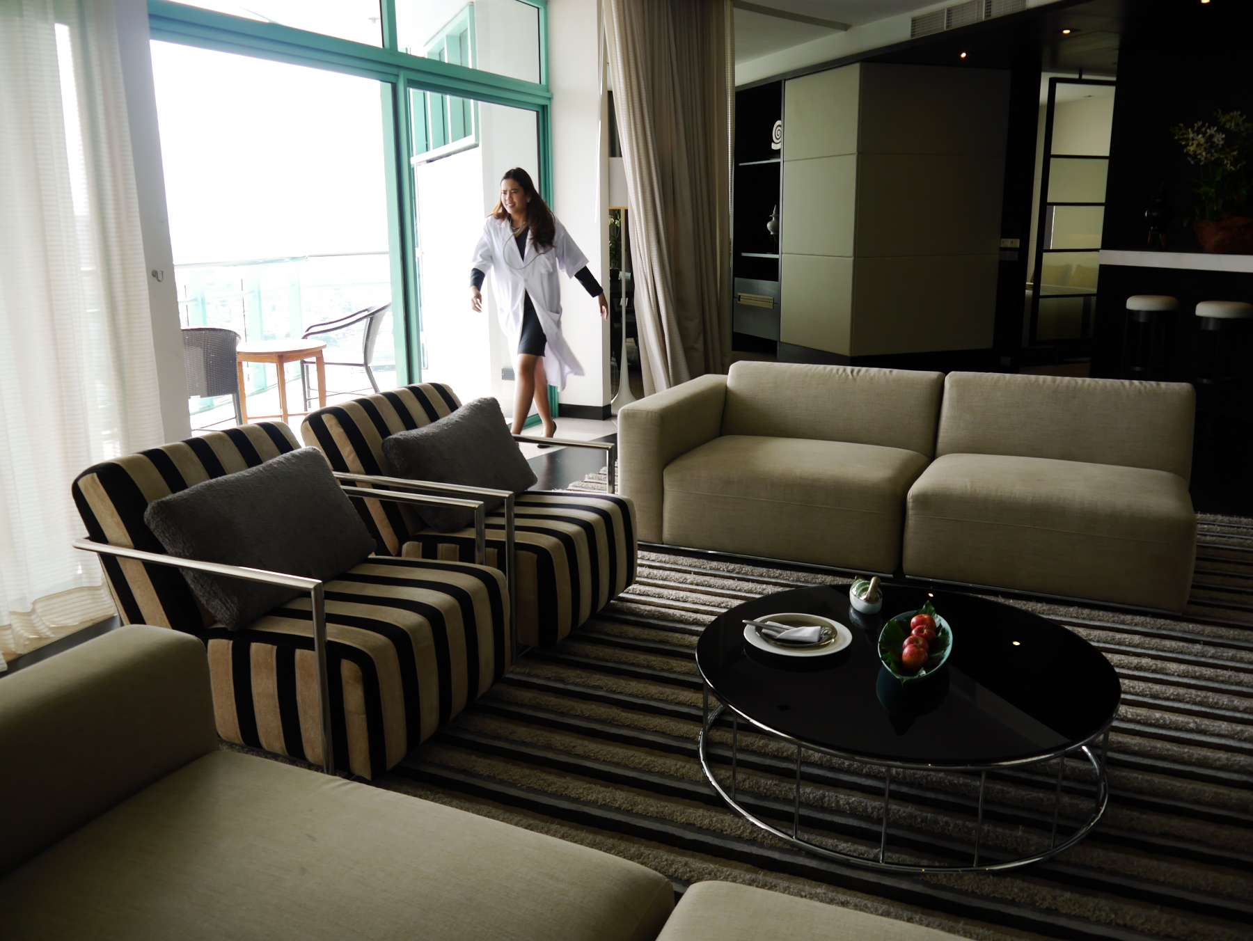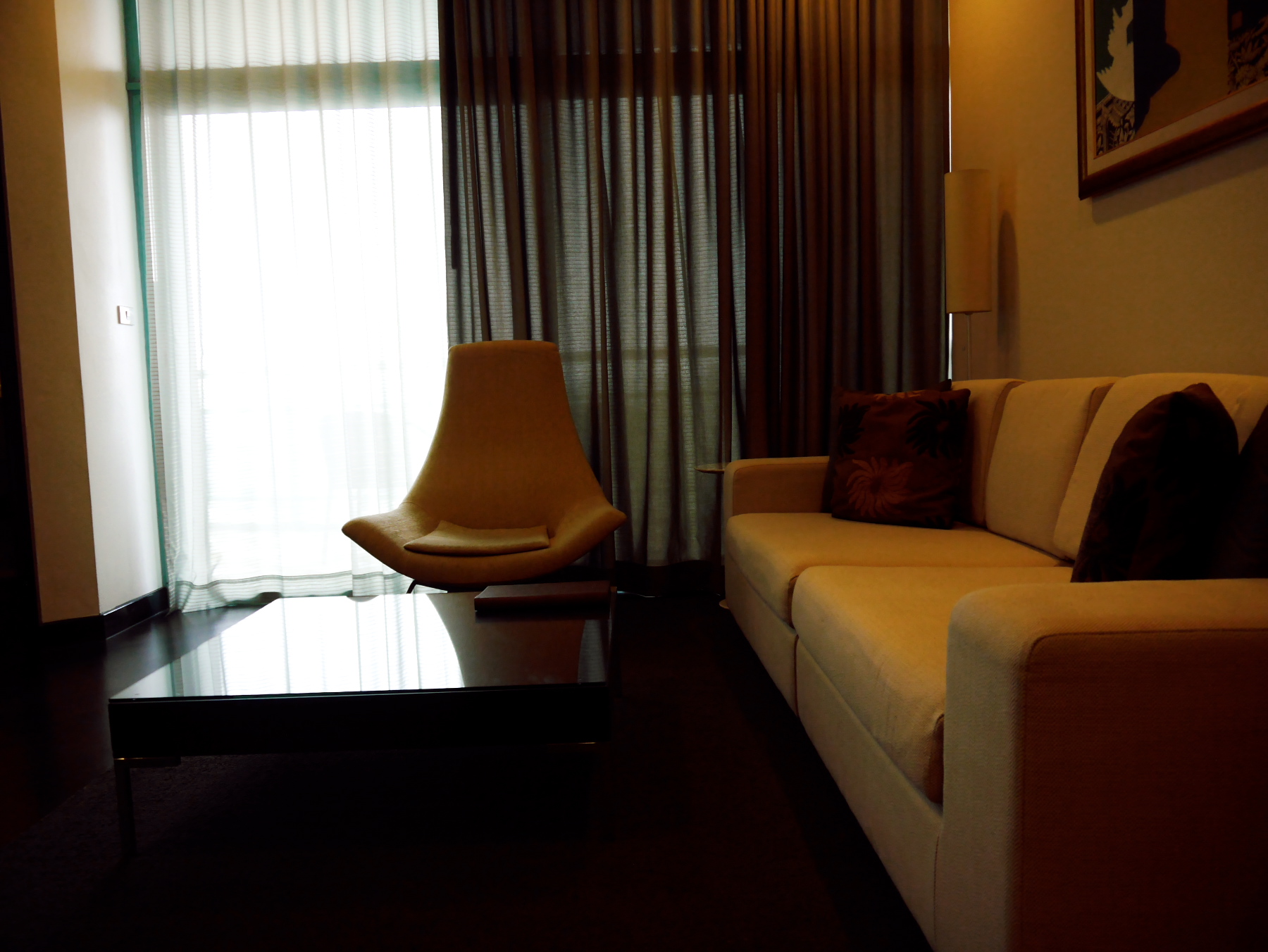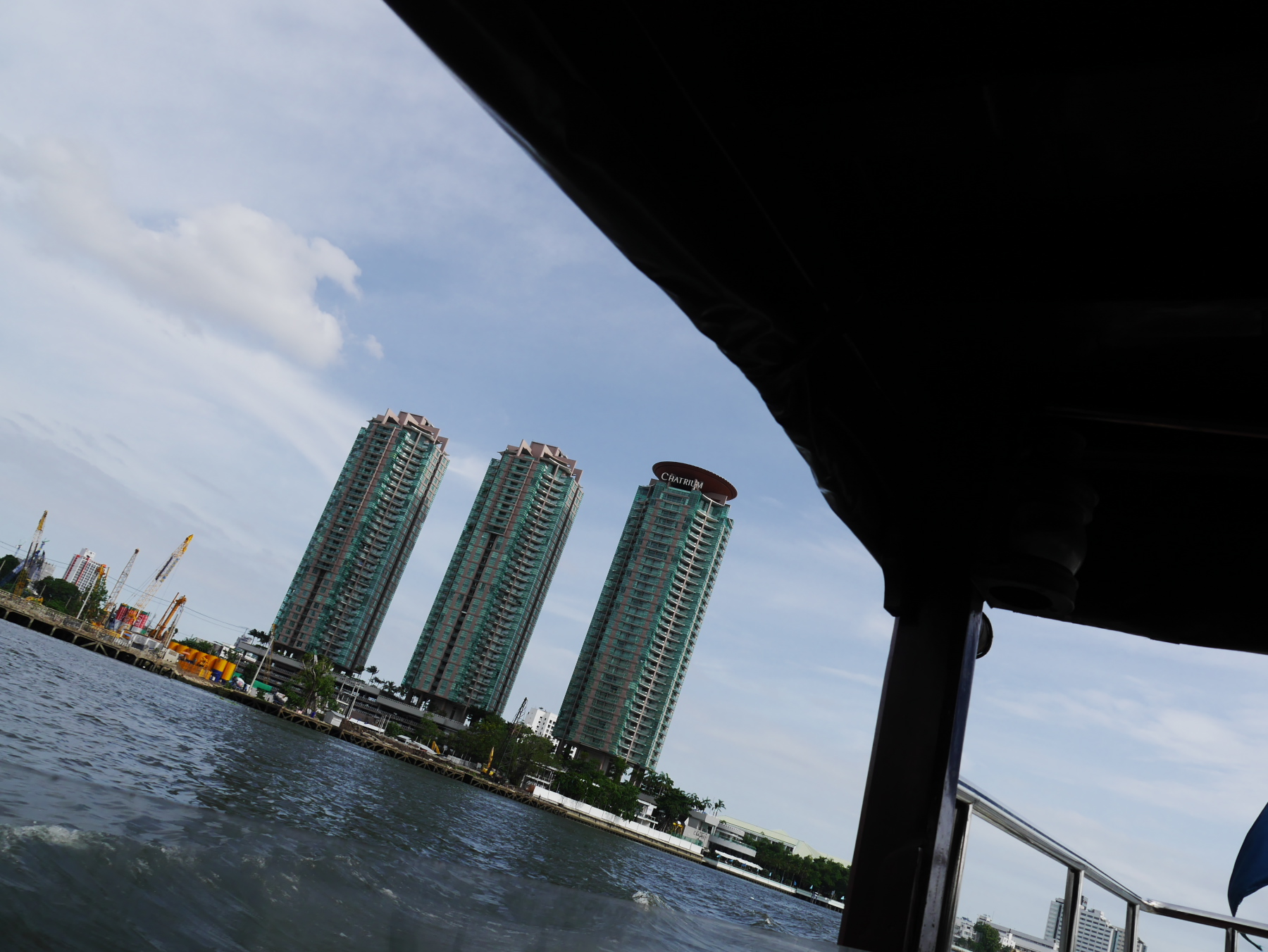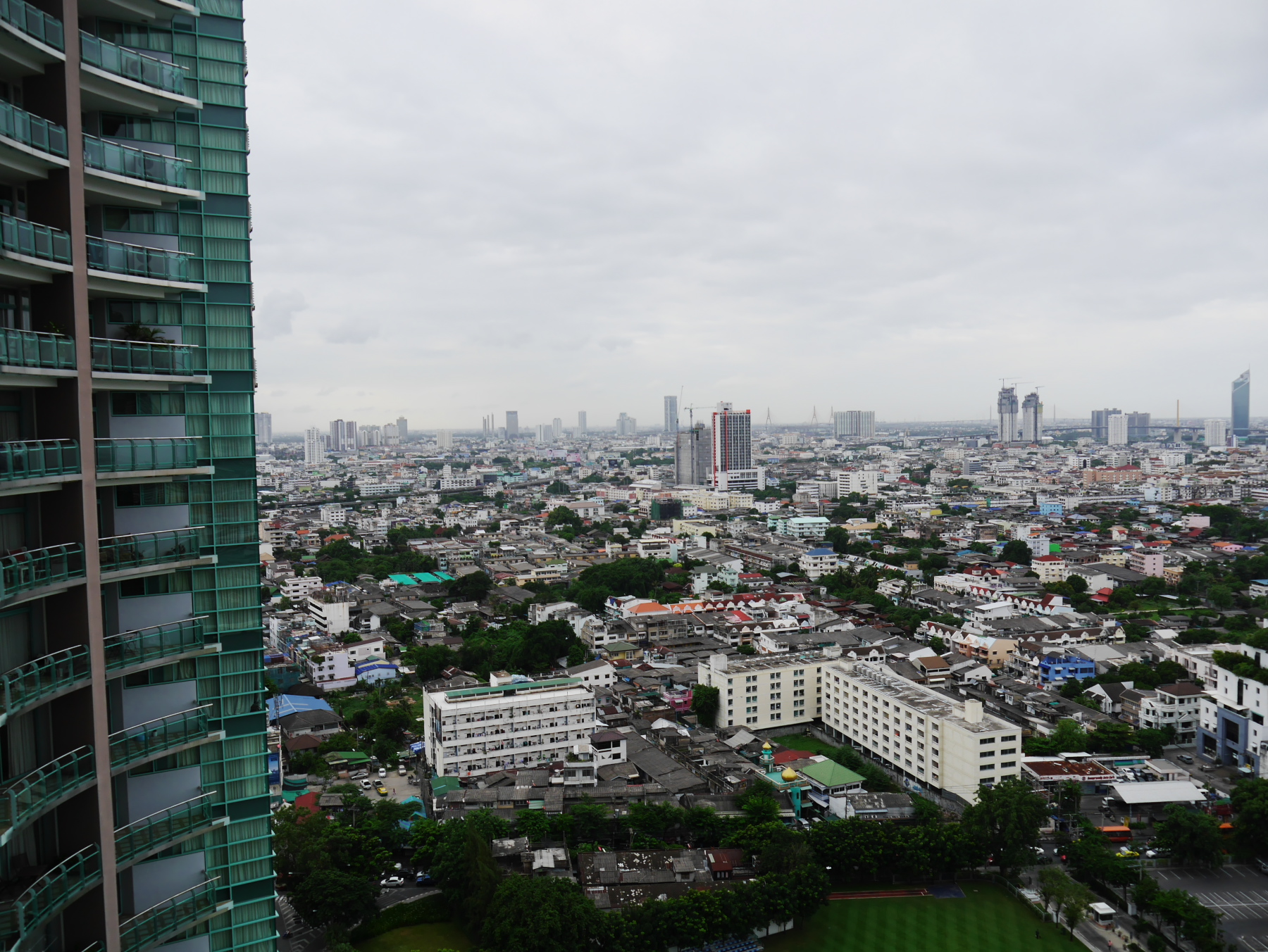 Arrivé à 6 heures du matin, notre petit groupe belgo-belge n’a pas pris beaucoup de temps pour rejoindre le Chatrium Hotel Riverside, un hôtel assez récent situé au bords du fleuve Chao Phraya. Depuis ma terrasse, je contemple la mégapole, embrumée par le manque de sommeil et le décalage horaire, malgré la liaison directe depuis Bruxelles (merci Thai Airways). Nos hôtes nous ont clairement gâté, j’hérite d’une suite immense, dans les tons blancs, crèmes, noirs et verts… Cuisine, coin salon, salle de bain gigantesque, le plus difficile des résidents ne trouvera rien à redire sur les équipement et la superficie des chambres (les chambres « simples » font 60m2, la taille de mon appartement).