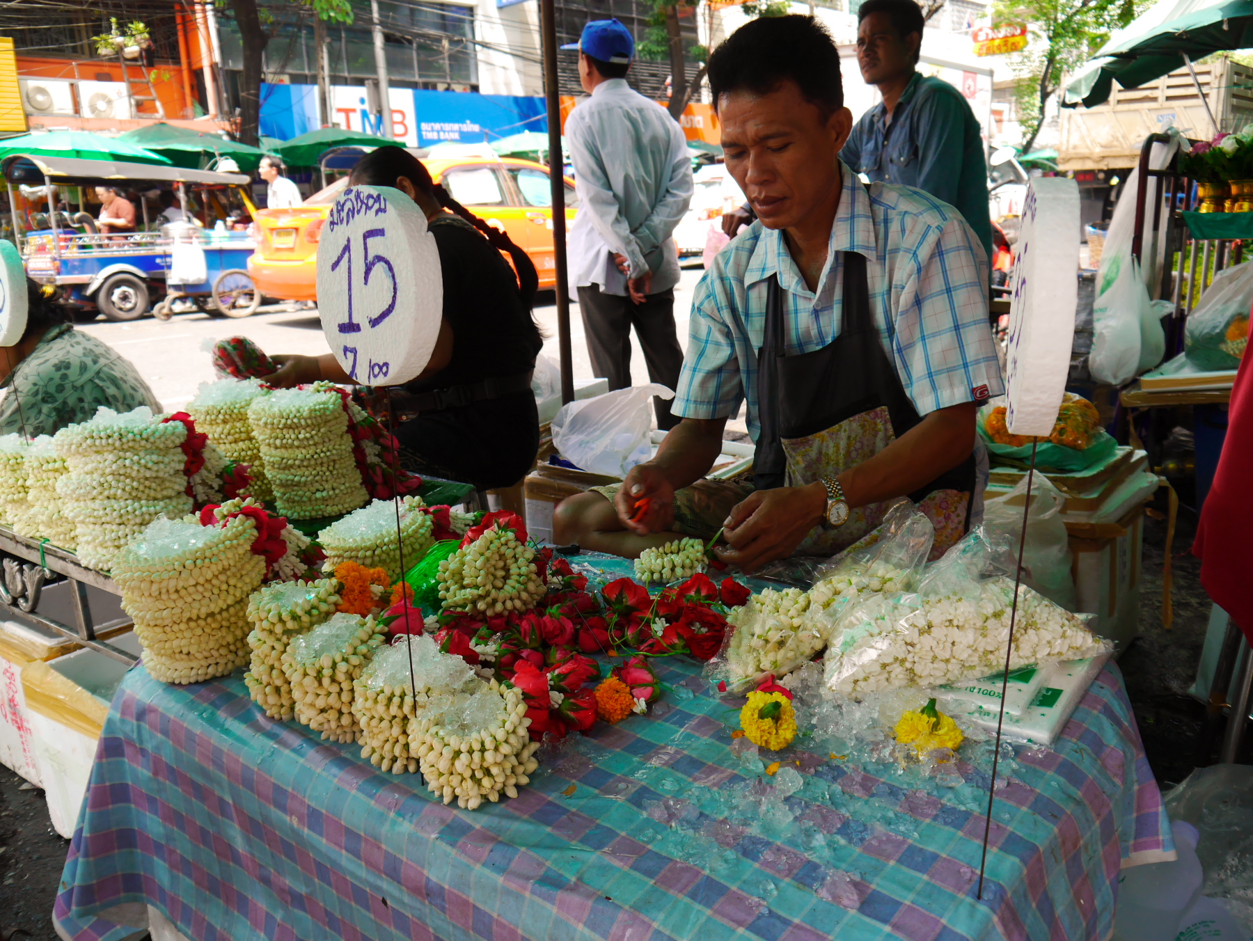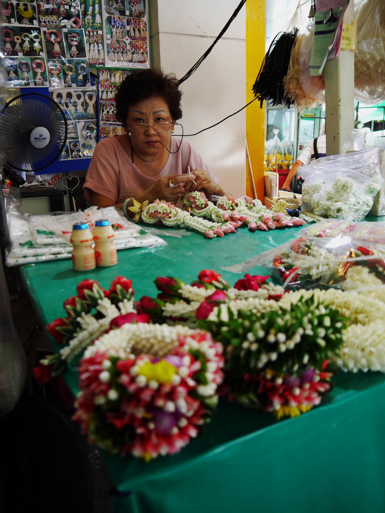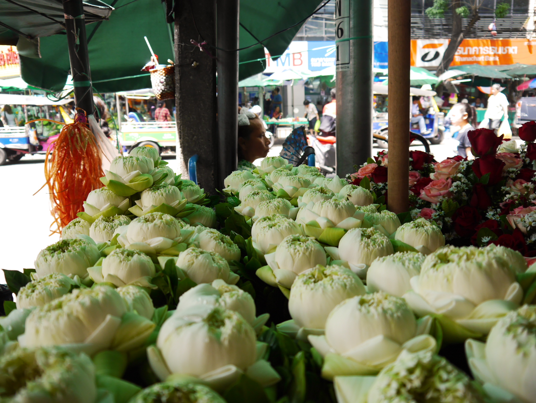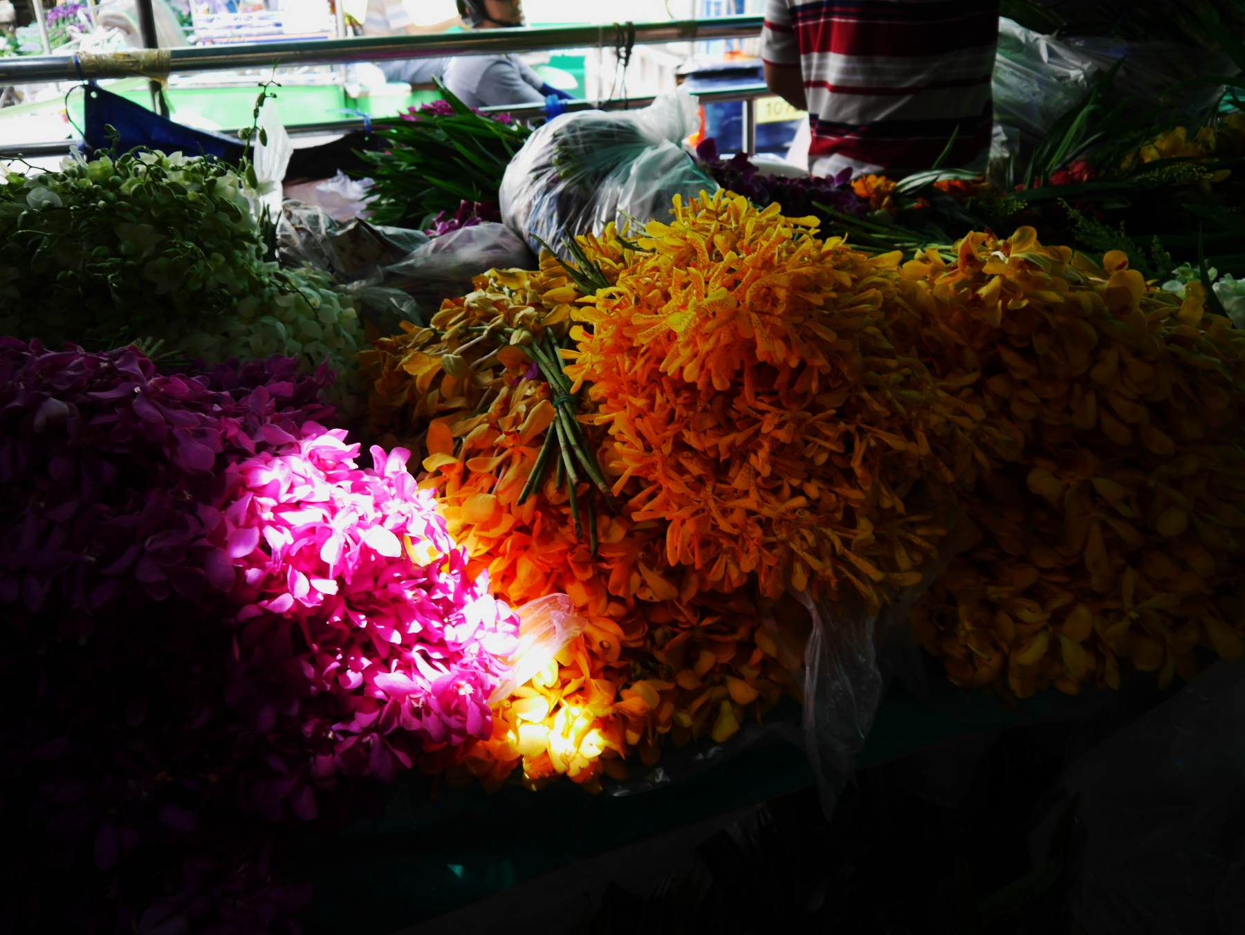 Sous les auvents des marchands, où l’on circule à l’ombre, c’est une explosion de formes étranges et de couleurs plus chatoyantes les unes que les autres : à côté des familières roses (qui sont loin d’être la reine des fleurs ici), on trouve des fleurs de lotus, des chrysanthèmes mais surtout, des orchidées. Des tas et des tas d’orchidées, de toutes tailles et de toutes nuances. Leurs fraîcheurs et leurs variétés sont un régal pour les yeux et font du Marché aux fleurs, un des lieux les plus photogéniques de Bangkok. A côté des petits cadeaux que l’on offre à ceux que l’on aime, les fleurs ont aussi une fonction religieuse puisqu’elles servent d’offrande (particulièrement les lotus et les soucis) ou de porte-bonheur (jasmin associé avec d’autres fleurs). Et c’est avec un bracelet de rose et de jasmin que les filles du groupe quitterons le marché.