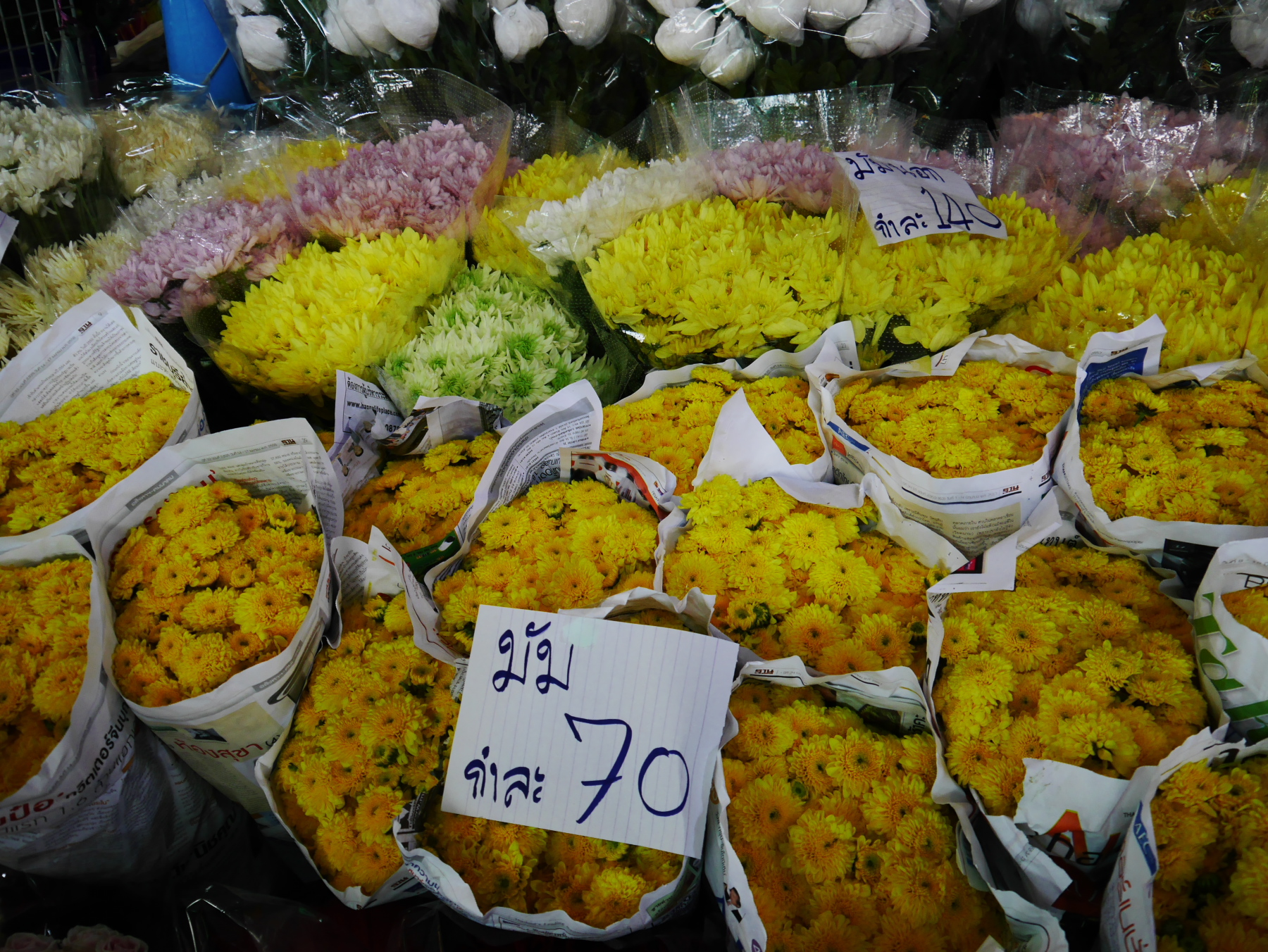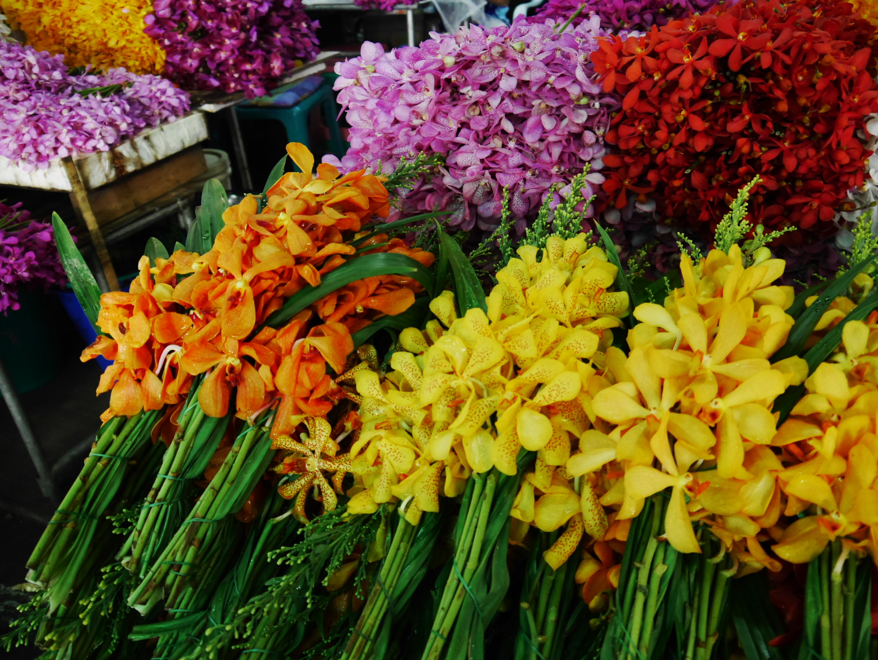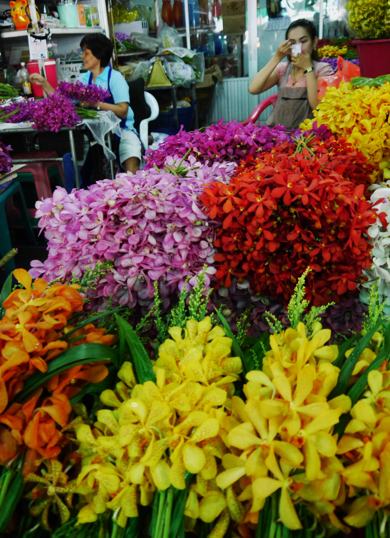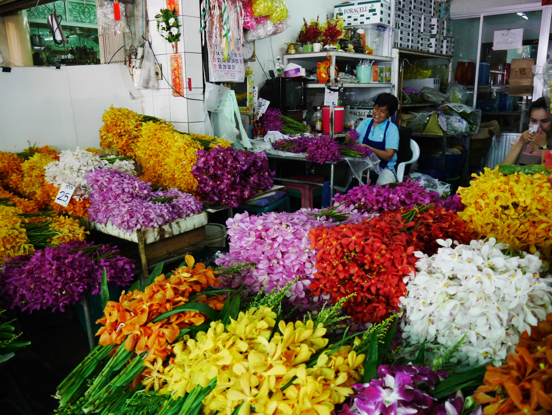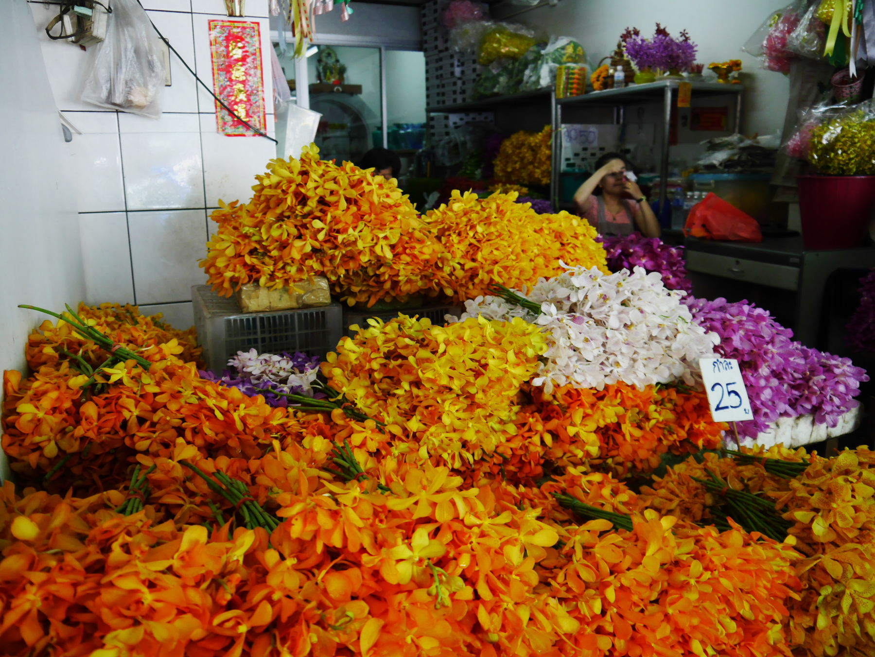 Sous les auvents des marchands, où l’on circule à l’ombre, c’est une explosion de formes étranges et de couleurs plus chatoyantes les unes que les autres : à côté des familières roses (qui sont loin d’être la reine des fleurs ici), on trouve des fleurs de lotus, des chrysanthèmes mais surtout, des orchidées. Des tas et des tas d’orchidées, de toutes tailles et de toutes nuances. Leurs fraîcheurs et leurs variétés sont un régal pour les yeux et font du Marché aux fleurs, un des lieux les plus photogéniques de Bangkok. A côté des petits cadeaux que l’on offre à ceux que l’on aime, les fleurs ont aussi une fonction religieuse puisqu’elles servent d’offrande (particulièrement les lotus et les soucis) ou de porte-bonheur (jasmin associé avec d’autres fleurs). Et c’est avec un bracelet de rose et de jasmin que les filles du groupe quitterons le marché.