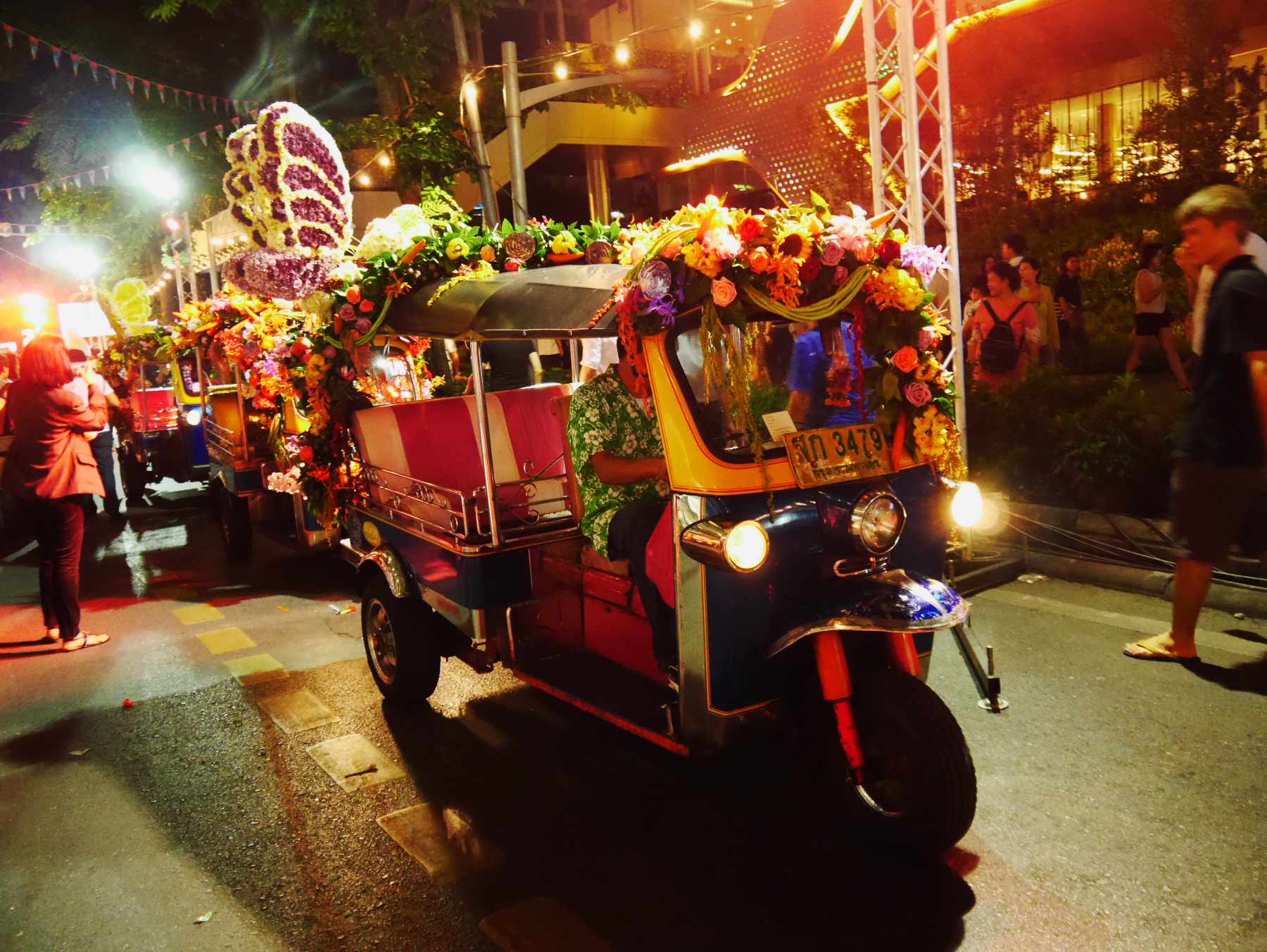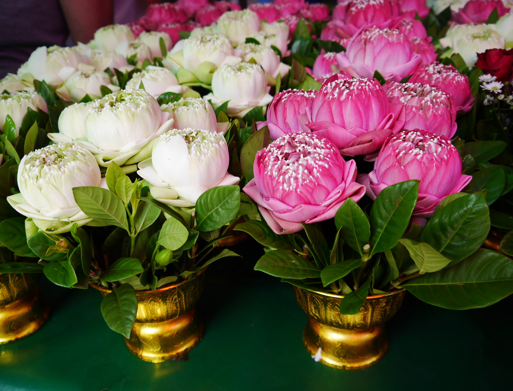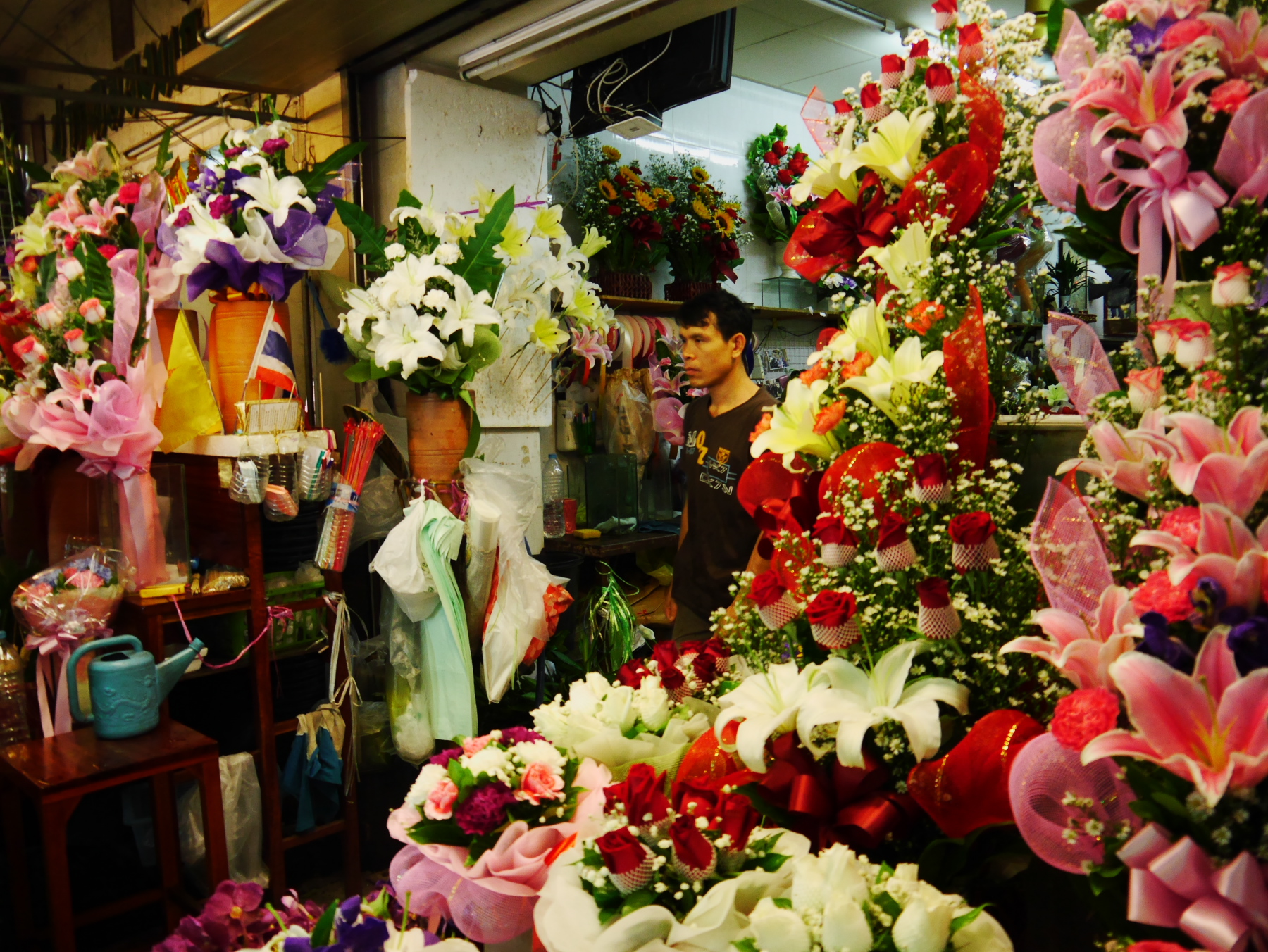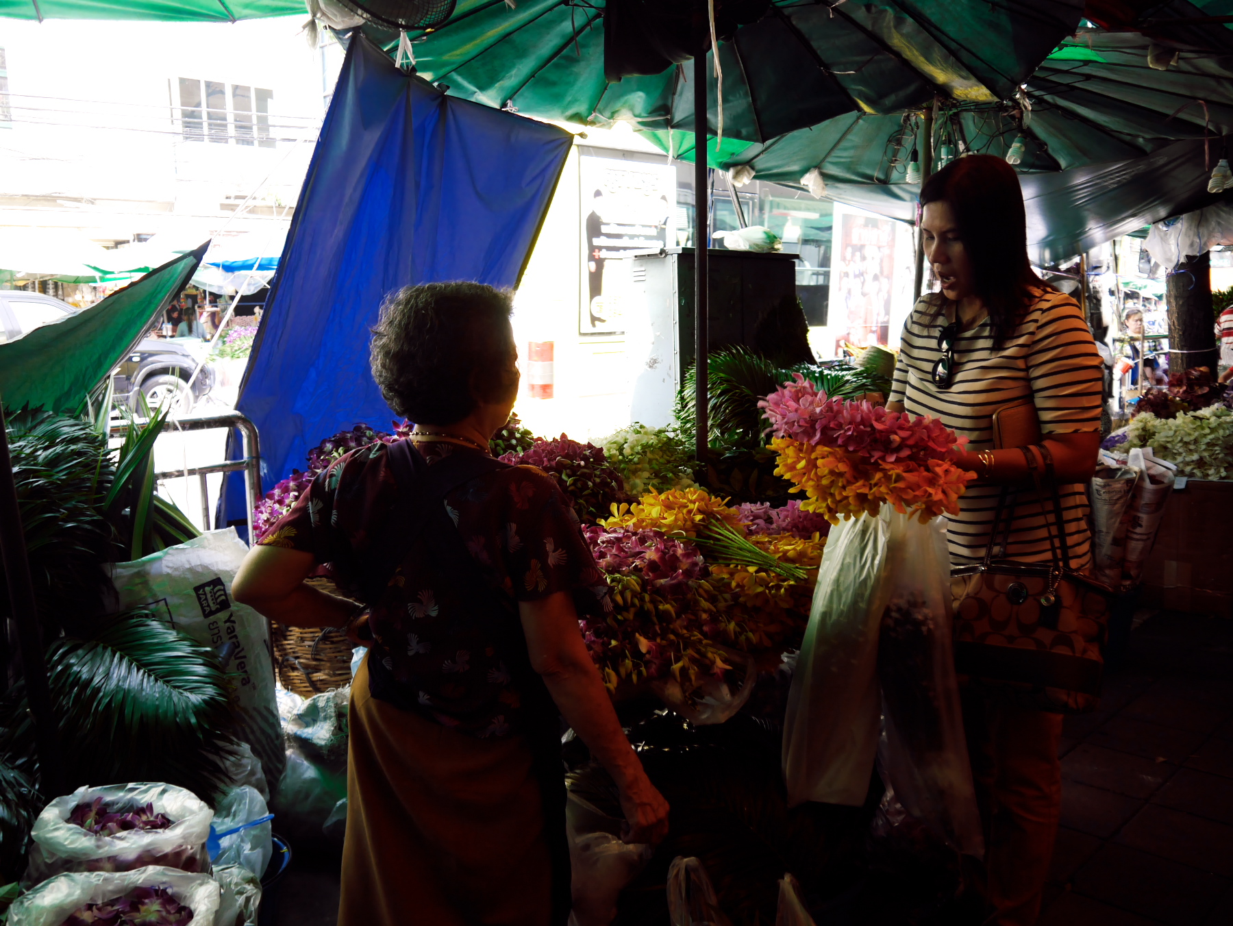 Sous les auvents des marchands, où l’on circule à l’ombre, c’est une explosion de formes étranges et de couleurs plus chatoyantes les unes que les autres : à côté des familières roses (qui sont loin d’être la reine des fleurs ici), on trouve des fleurs de lotus, des chrysanthèmes mais surtout, des orchidées. Des tas et des tas d’orchidées, de toutes tailles et de toutes nuances. Leurs fraîcheurs et leurs variétés sont un régal pour les yeux et font du Marché aux fleurs, un des lieux les plus photogéniques de Bangkok. A côté des petits cadeaux que l’on offre à ceux que l’on aime, les fleurs ont aussi une fonction religieuse puisqu’elles servent d’offrande (particulièrement les lotus et les soucis) ou de porte-bonheur (jasmin associé avec d’autres fleurs). Et c’est avec un bracelet de rose et de jasmin que les filles du groupe quitterons le marché.