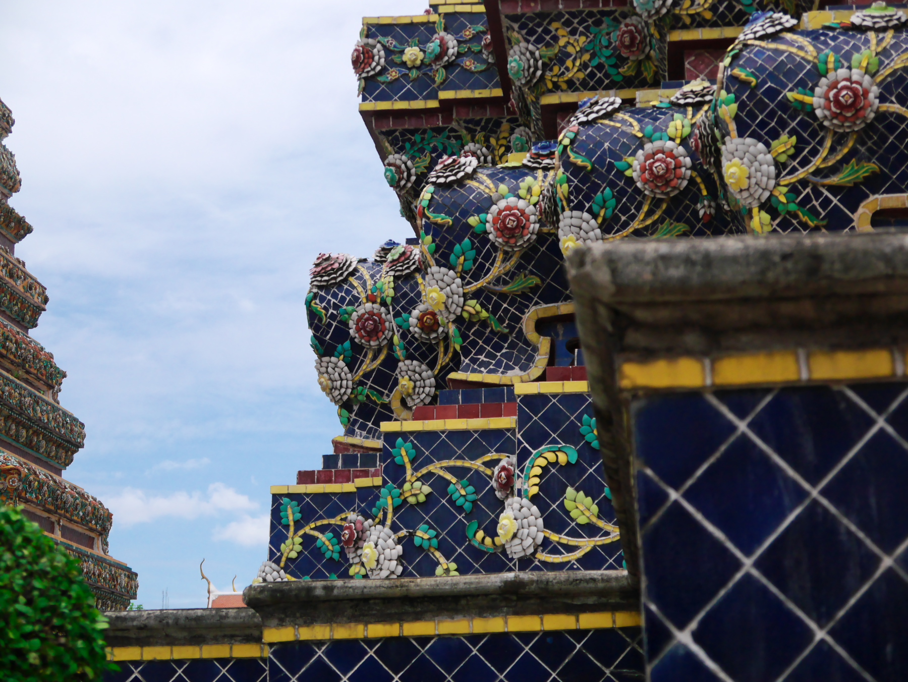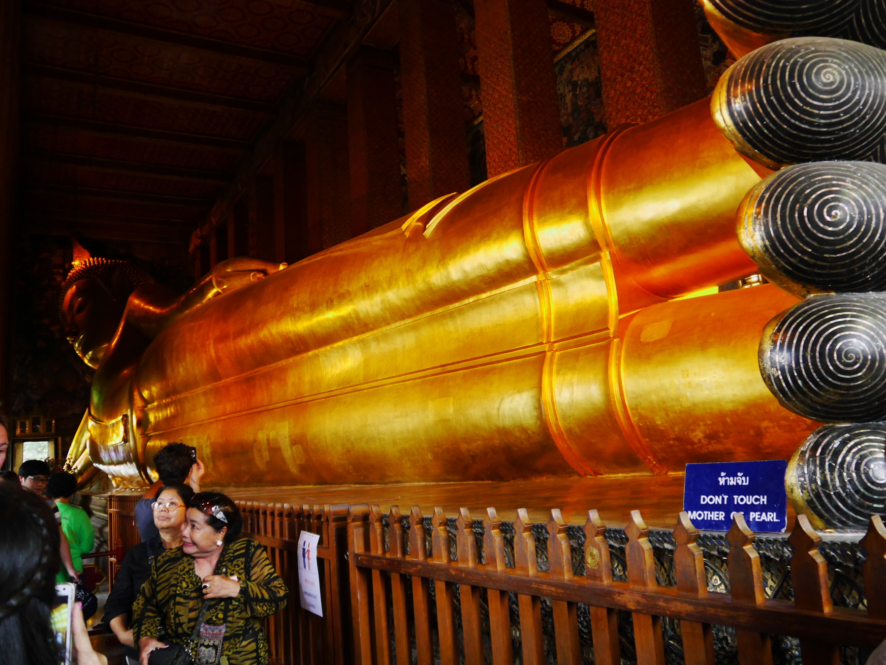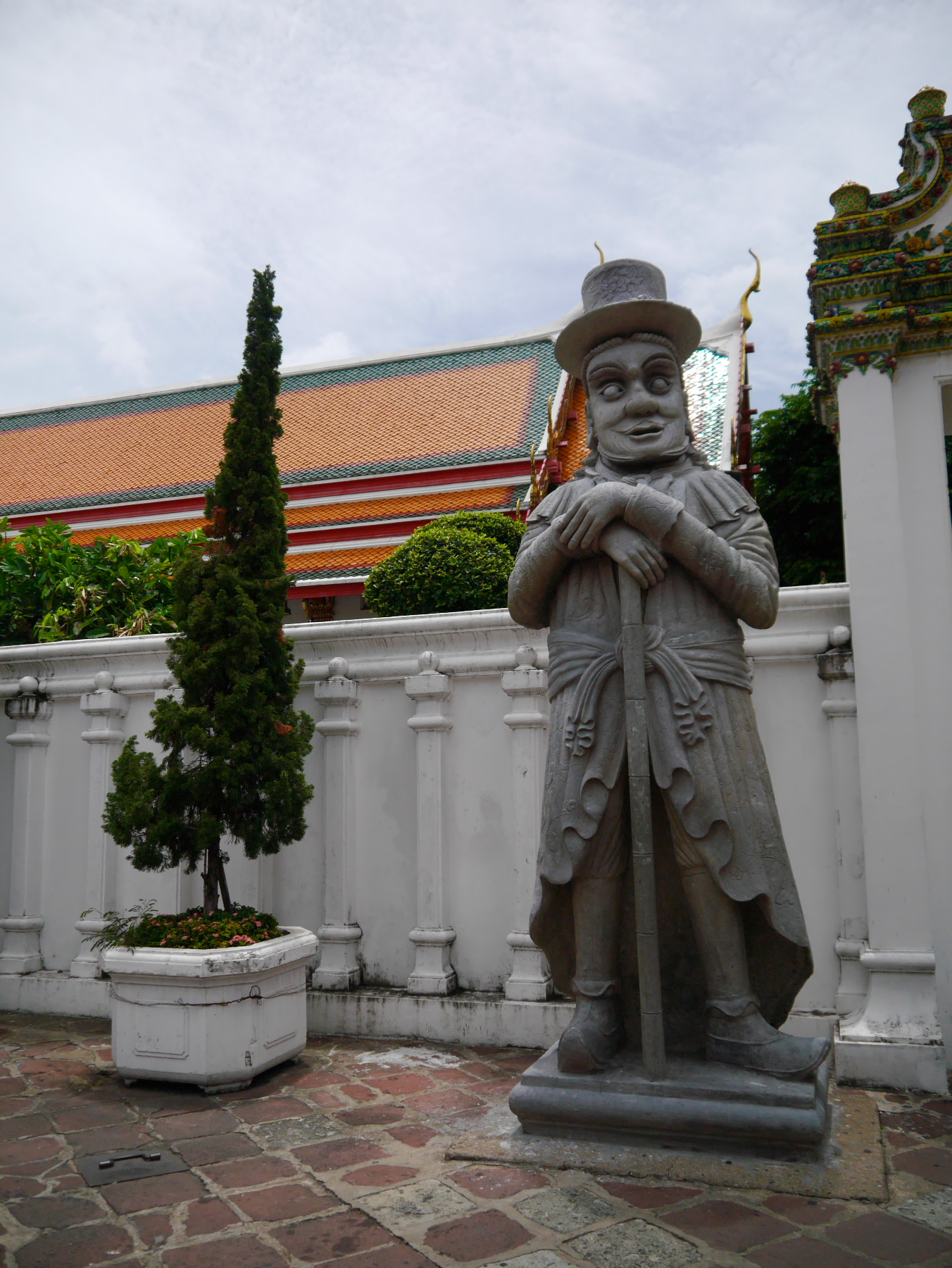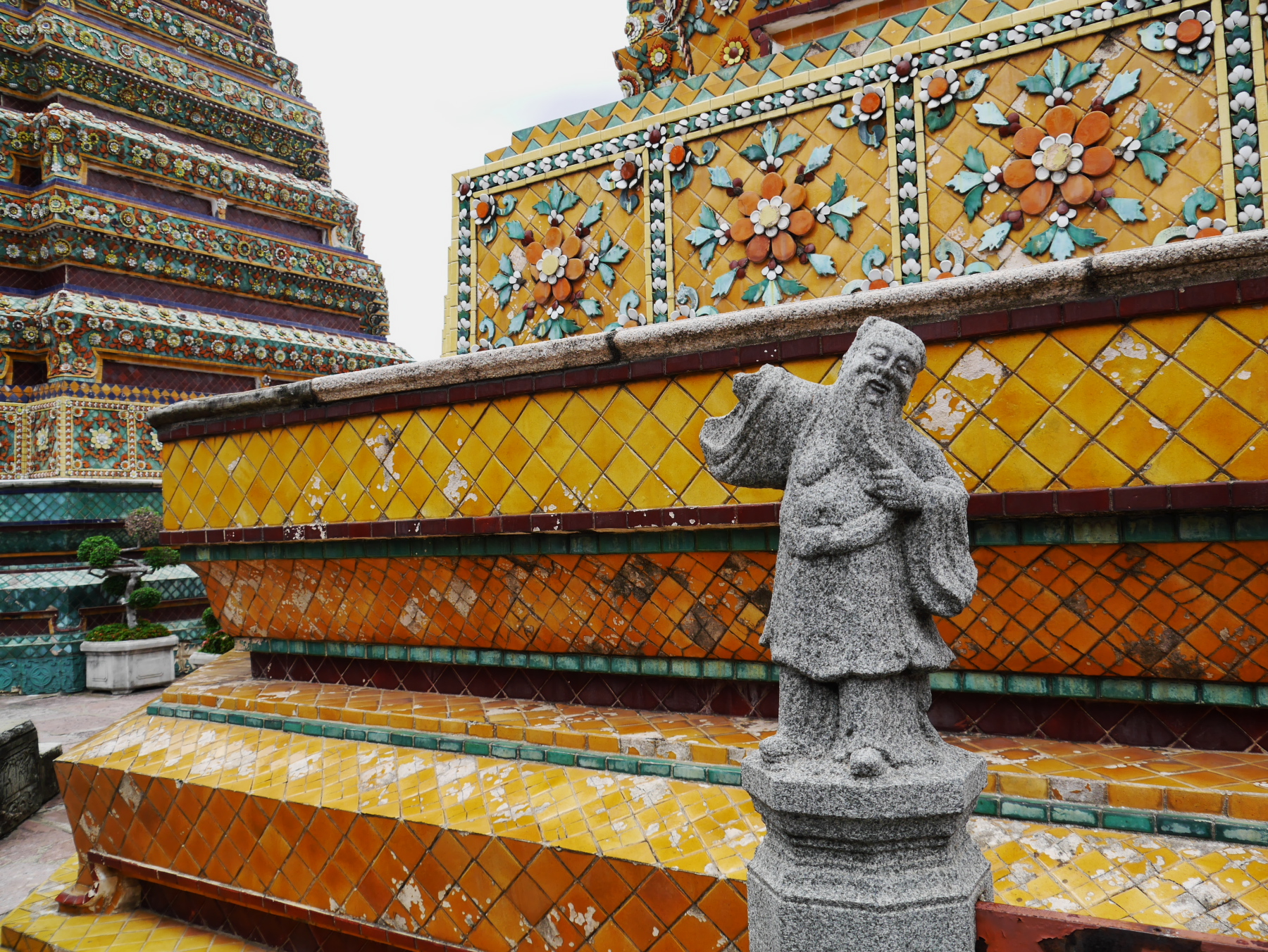 C’est avec plaisir que je retrouve une vieille connaissance : le grand Bouddha couché du Temple de Wat Pho, le plus important des temples de Bangkok. La grande statue dorée à l’or fin d’un Bouddha mourant m’impressionne tout autant que la première fois! On y vient pour admirer le travail des artistes qui ont contribué à la beauté du site, pour un prier dans le Grand Temple Central, et méditer à l’ombre des pagodes des 4 premiers souverains Chakri. En se baladant à travers ses allées, on croisera des statues détonnant plutôt avec l’architecture et les sculptures typiquement thaïlandaises. Ces lions et autres messieurs aux longues moustaches auraient plutôt leur place à Pékin qu’à Bangkok! Il s’agit en fait de ballast. Vestige du temps où les navires apportaient à la Chine le riz et entre denrées dont elles avaient bien besoin. Au retour, on y amenait de la porcelaine, mais aussi des statues pour servir de ballast. A présent, ces figures de mandarins et ces animaux fantastiques gardent le Bouddha et la mémoire des rois de Siam.