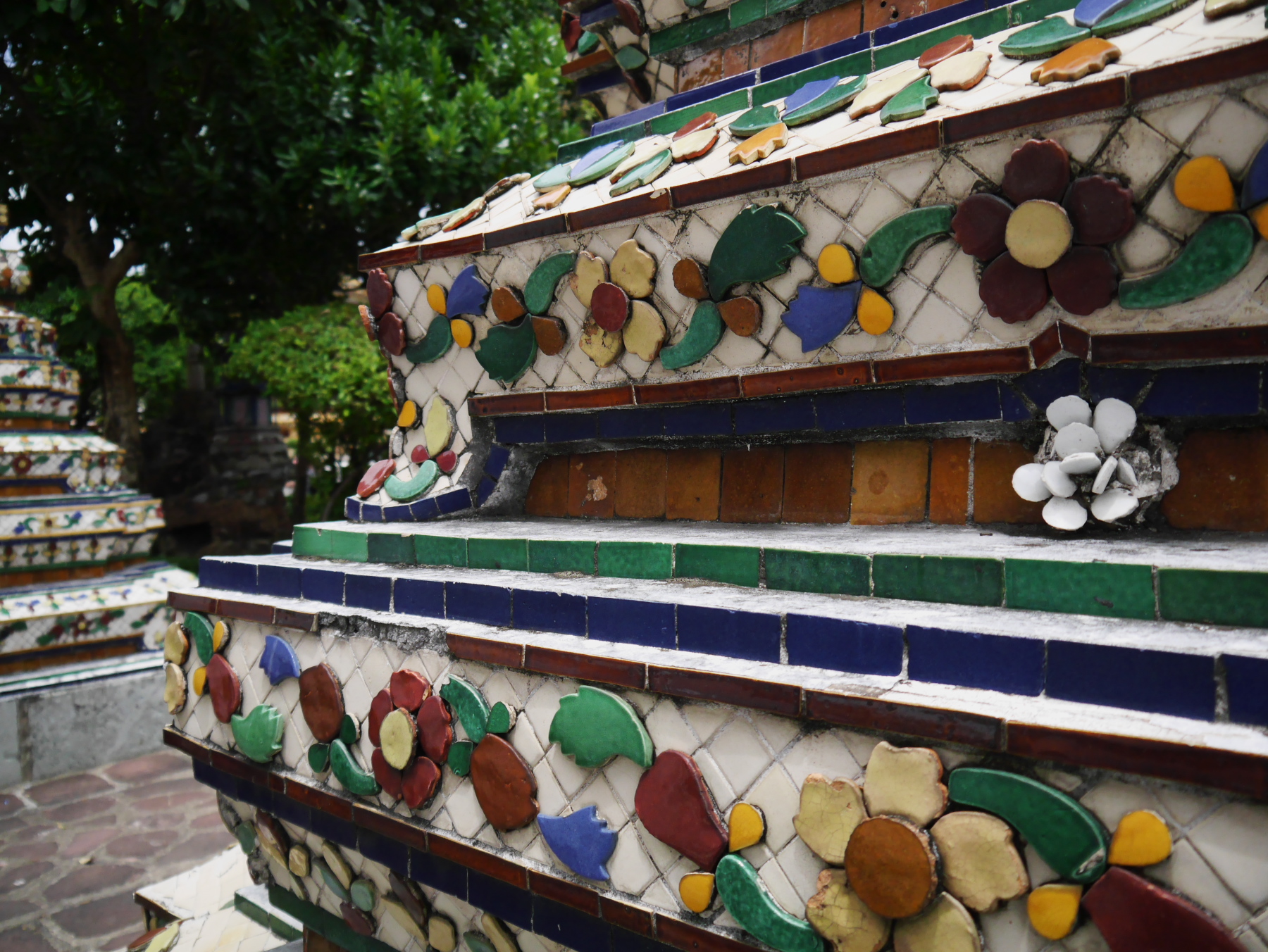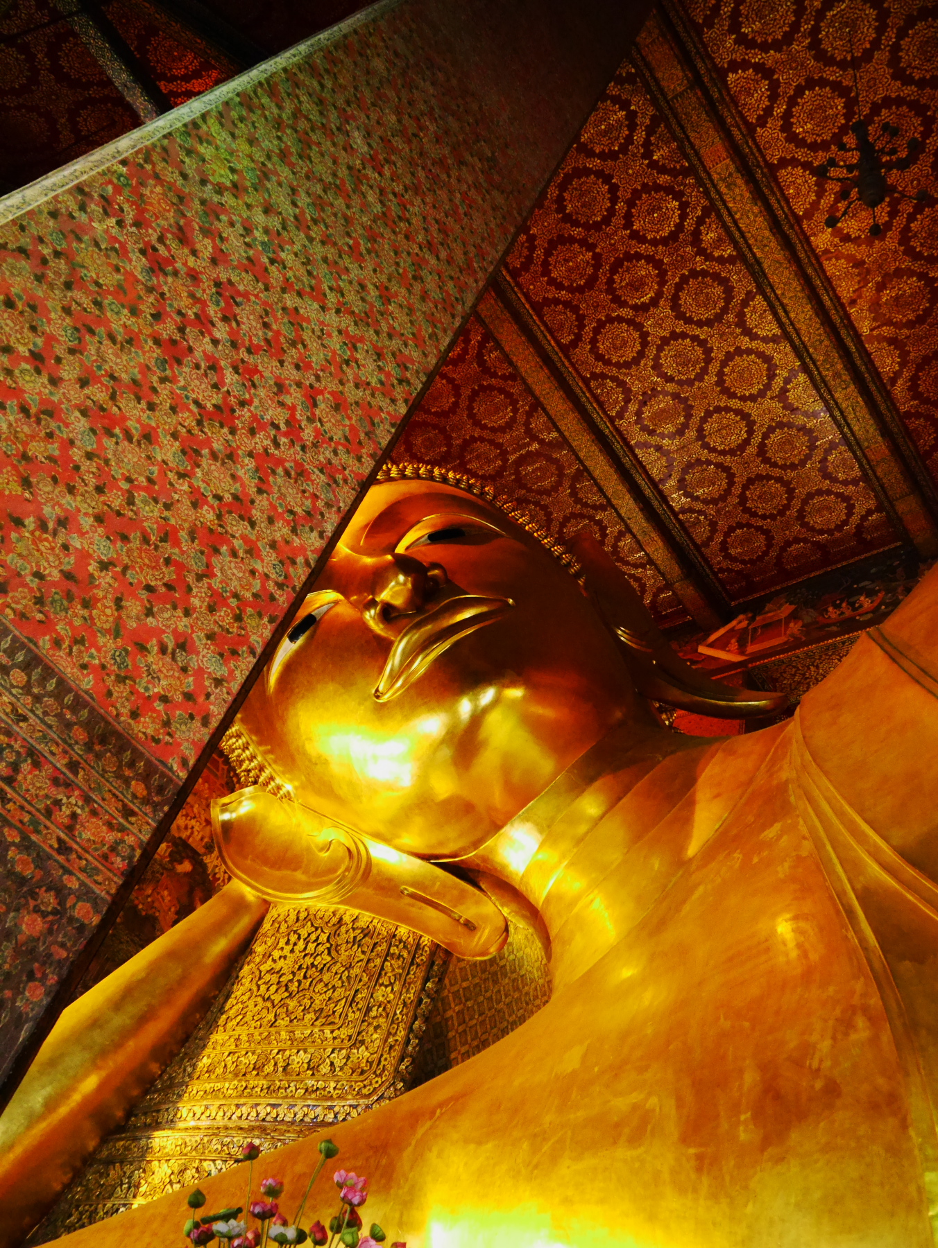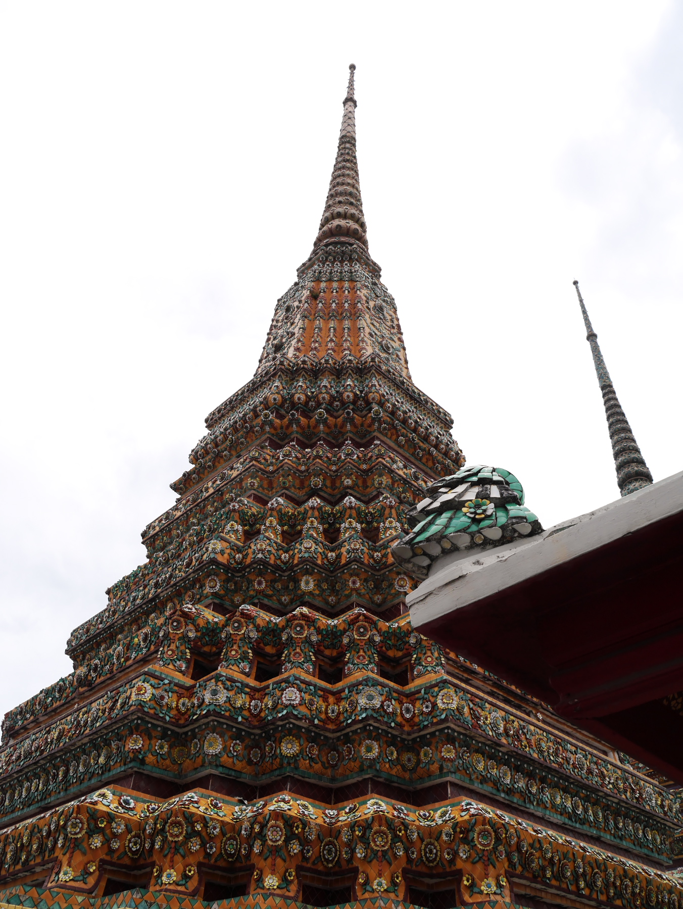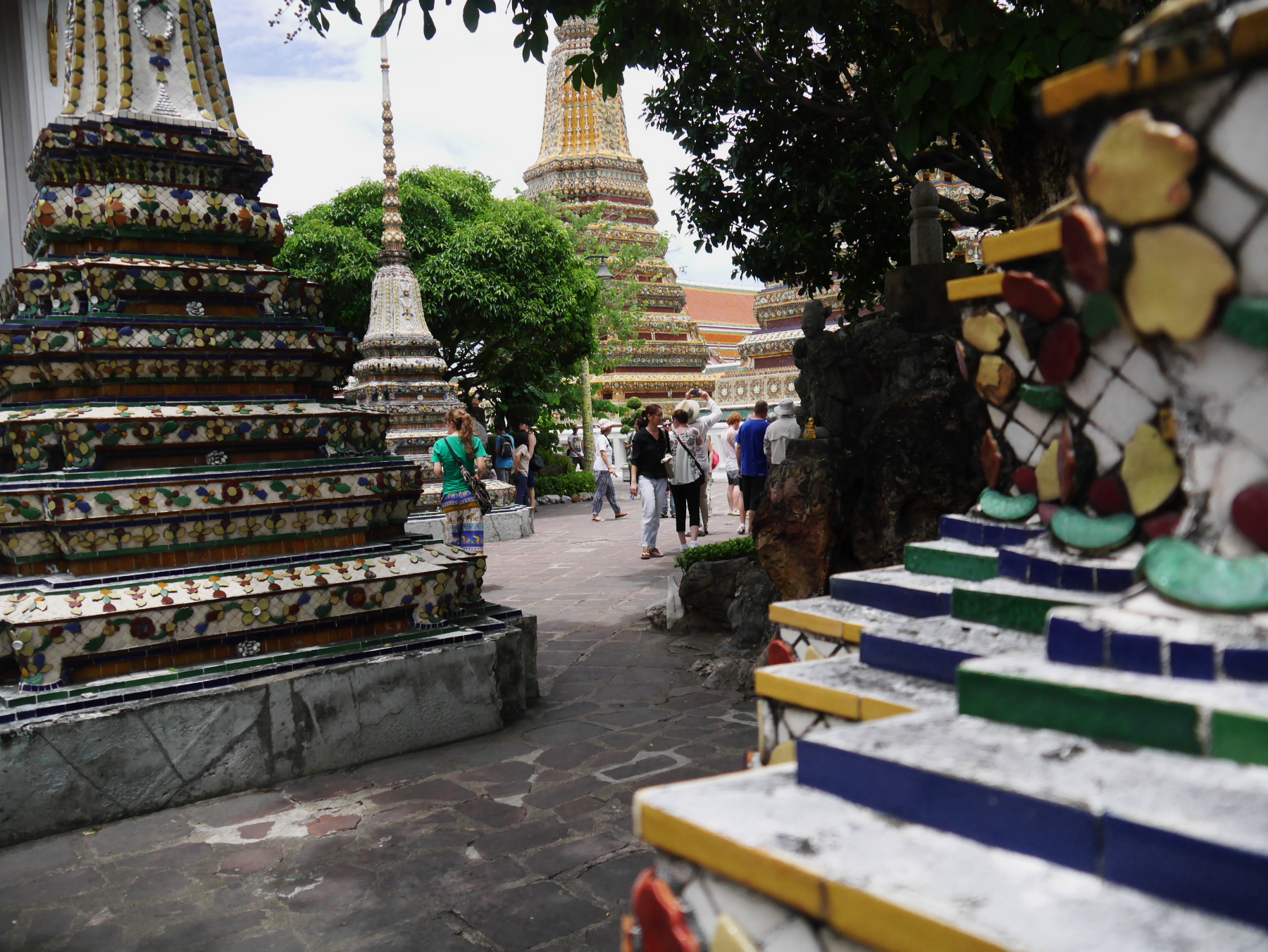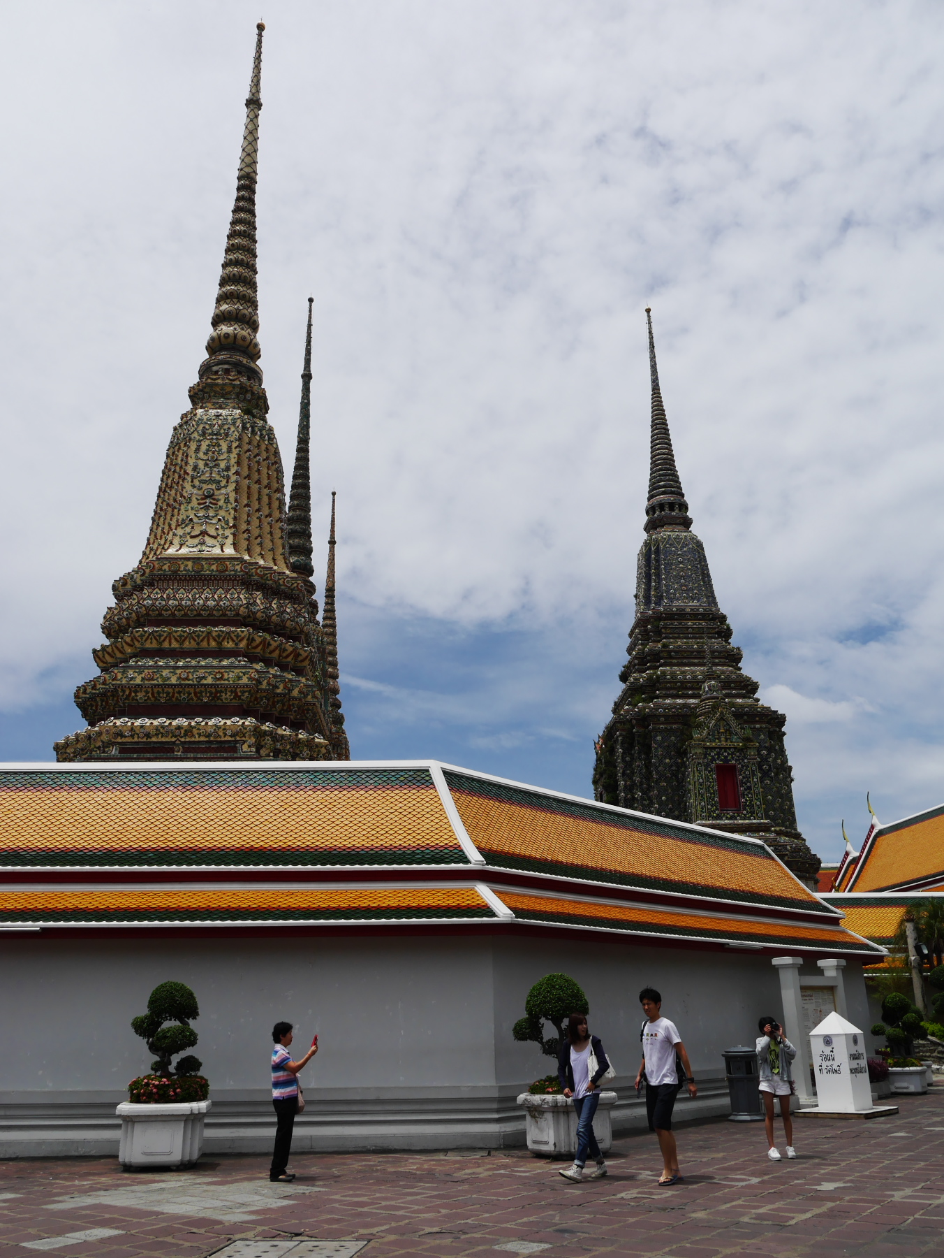 C’est avec plaisir que je retrouve une vieille connaissance : le grand Bouddha couché du Temple de Wat Pho, le plus important des temples de Bangkok. La grande statue dorée à l’or fin d’un Bouddha mourant m’impressionne tout autant que la première fois! On y vient pour admirer le travail des artistes qui ont contribué à la beauté du site, pour un prier dans le Grand Temple Central, et méditer à l’ombre des pagodes des 4 premiers souverains Chakri. En se baladant à travers ses allées, on croisera des statues détonnant plutôt avec l’architecture et les sculptures typiquement thaïlandaises. Ces lions et autres messieurs aux longues moustaches auraient plutôt leur place à Pékin qu’à Bangkok! Il s’agit en fait de ballast. Vestige du temps où les navires apportaient à la Chine le riz et entre denrées dont elles avaient bien besoin. Au retour, on y amenait de la porcelaine, mais aussi des statues pour servir de ballast. A présent, ces figures de mandarins et ces animaux fantastiques gardent le Bouddha et la mémoire des rois de Siam.