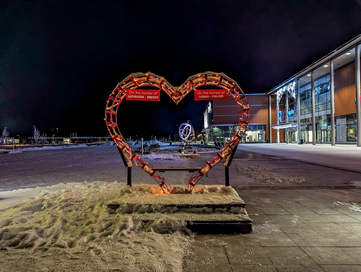 Passer d’Haparanda, en Suède, à Tornio, en Finlande, se fait sans s’en rendre compte. Ou presque. Si vous passez par là, la tradition exige que l’on prenne une petite photo souvenir à Victoria Square, une esplanade partagée par les deux villes (et donc les deux pays). La frontière est marquée par un banc posé au-dessous d’un grand cœur rouge. Vous pourrez y poser, comme nous, avec un pied dans chaque pays et un pied dans chaque fuseau horaire ! Eh oui, la Finlande a une heure de décalage par rapport à la Suède (qui est sur le même fuseau horaire que l’Europe occidentale). Du coup, les habitants des deux villes fêtent deux fois la nouvelle année. Minuit sonne en Finlande en premier, puis en Suède. Ce qui donne d’ailleurs lieu à une compétition de feux d’artifice pour l’occasion. Détail comique : la Finlande chauffe son côté de la place par le sol… mais pas la Suède. On ne peut pas se louper pour savoir dans quel pays on se trouve!