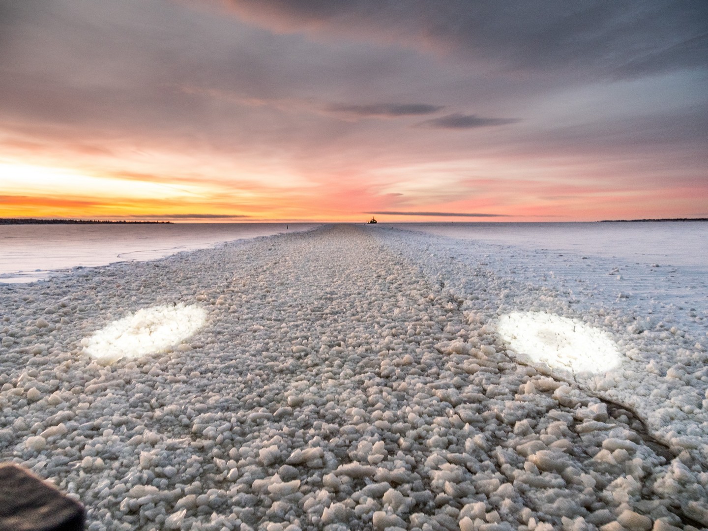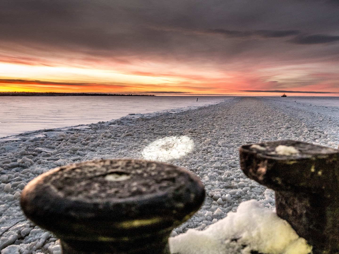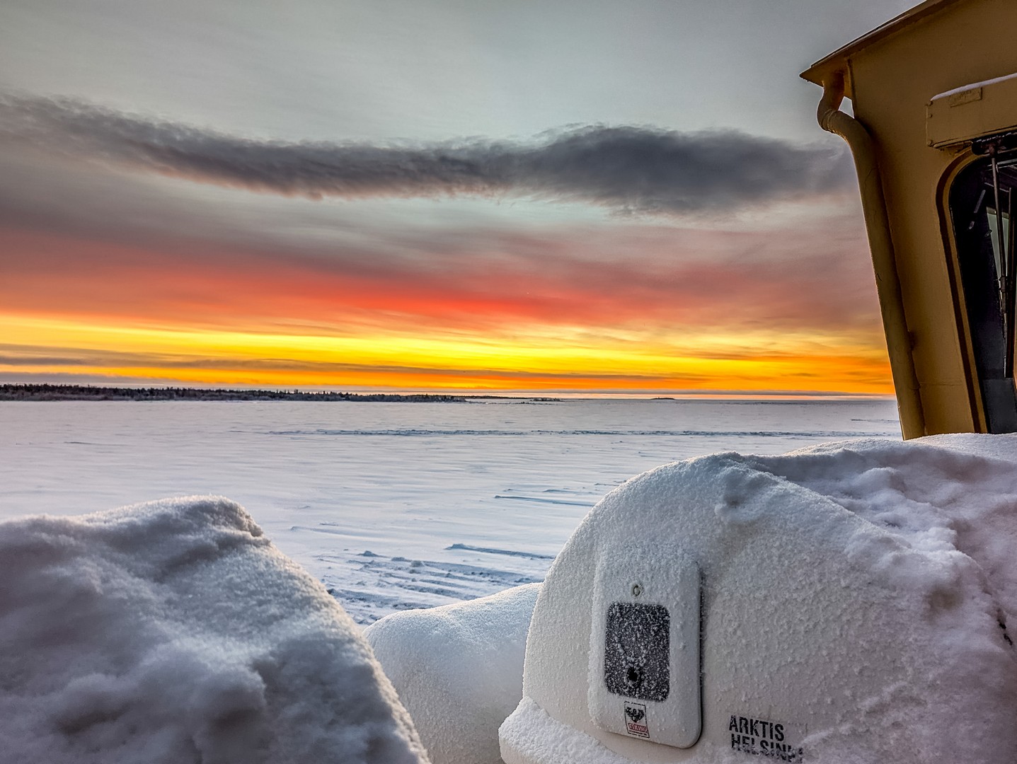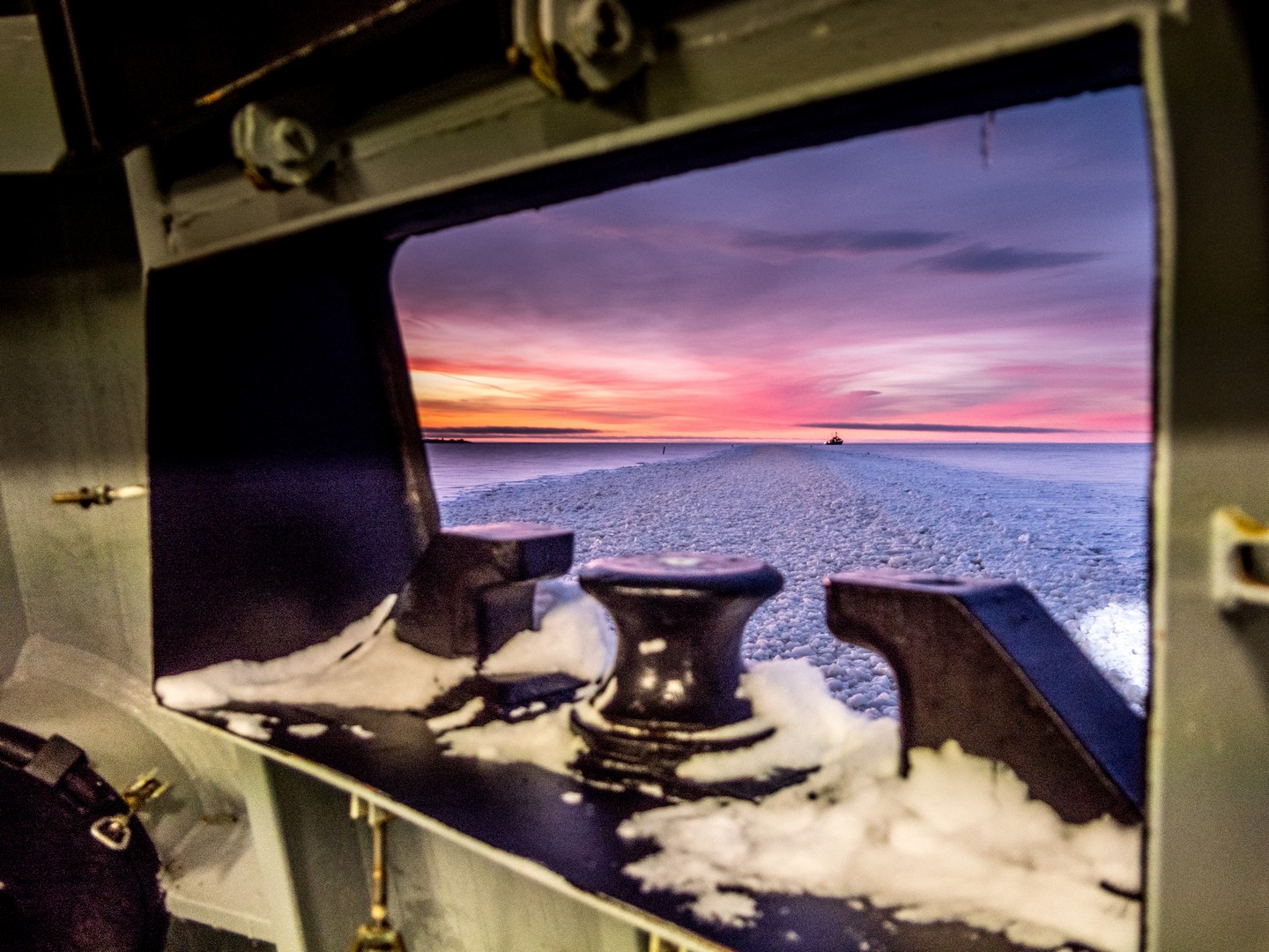 Petit à petit, le paysage se colore grâce au lever du soleil, la neige absorbe la lumière. On distingue les installations du port de Kemi, les forêts toutes proches… Après un petit moment, le bateau largue les amarres. Ça y est, on va briser la glace. Je fais des allers-retours entre le pont et les lounges, car il fait bien frisquet avec le vent. Heureusement, l’Arktis ne manque pas d’espaces où se réchauffer et il y a même un café où l’on peut se sustenter. Pour l’instant, je suis dehors et je photographie le soleil levant, la proue du navire qui fend ce qui reste de glace dans un bruit de craquement profond, mêlé au grondement des moteurs. À la proue, deux phares illuminent le chemin à tracer, comme deux grands yeux projetant de la lumière. S’il ne faisait pas si froid, je passerais toute la traversée sur le pont !
