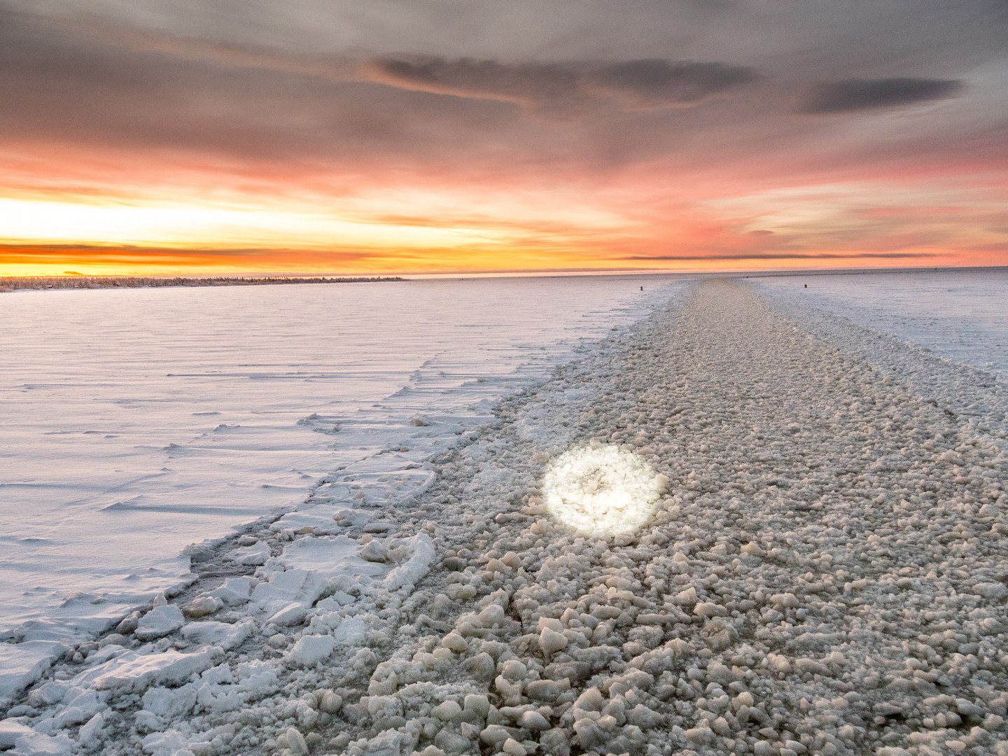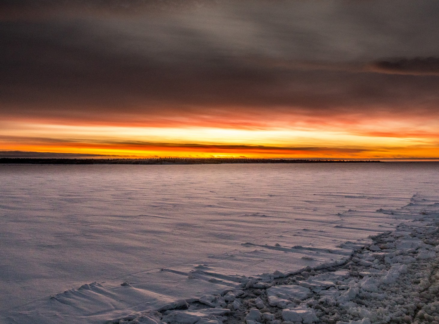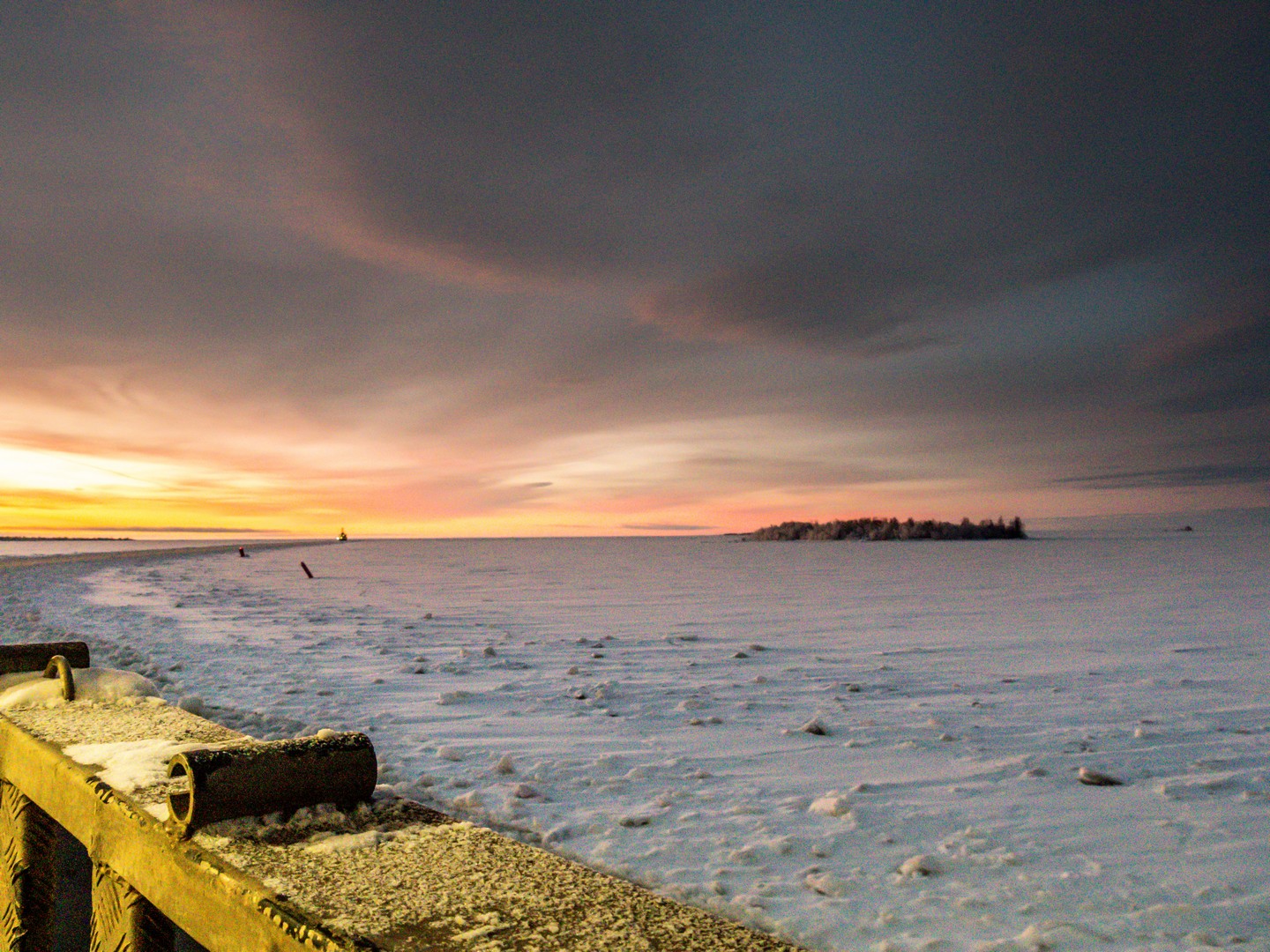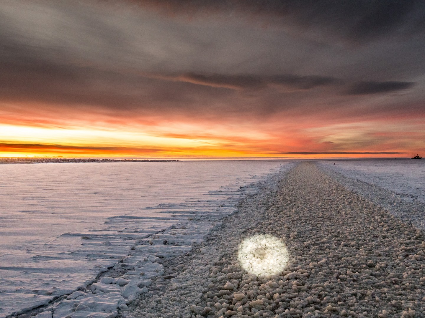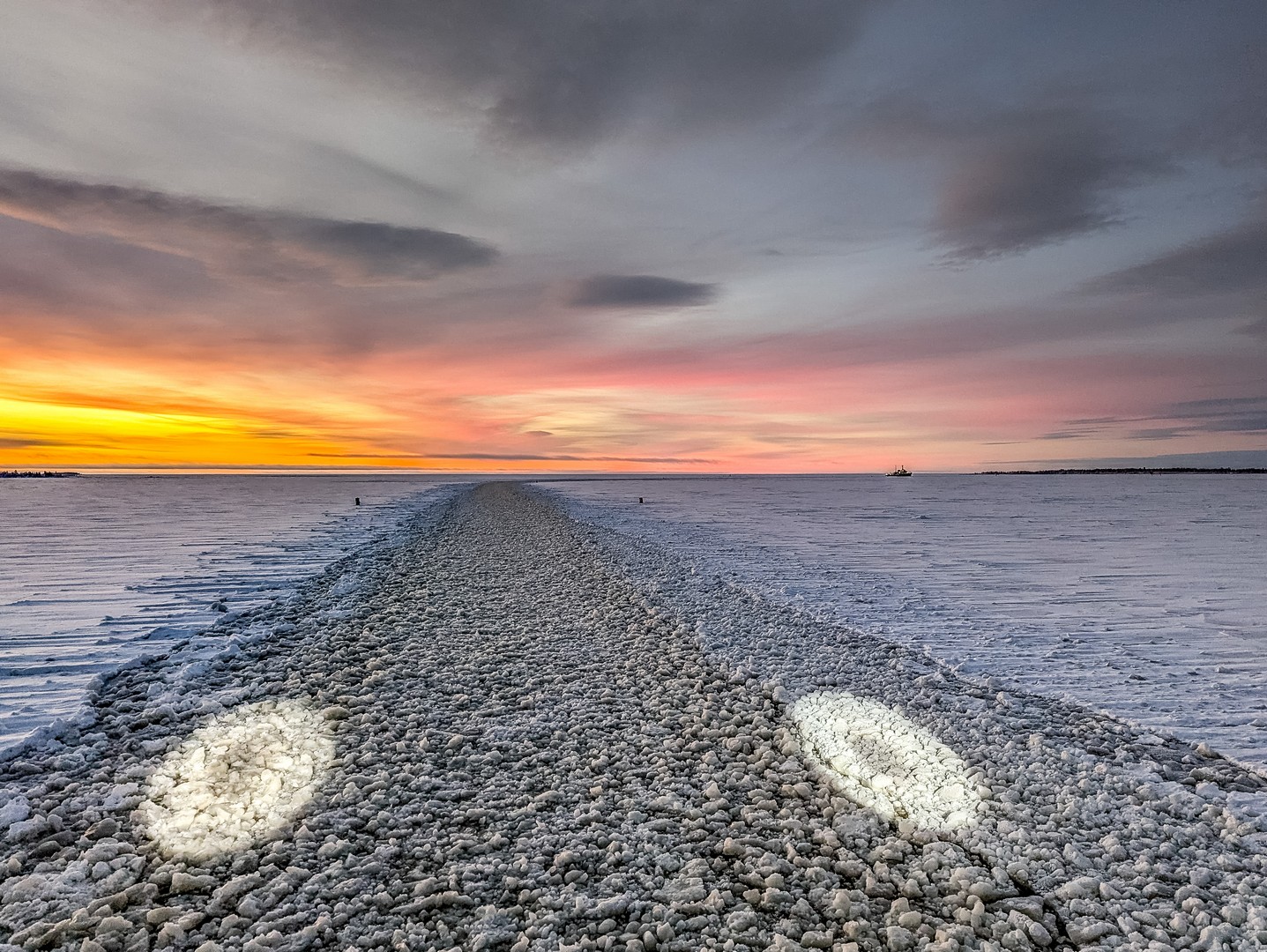 Petit à petit, le paysage se colore grâce au lever du soleil, la neige absorbe la lumière. On distingue les installations du port de Kemi, les forêts toutes proches… Après un petit moment, le bateau largue les amarres. Ça y est, on va briser la glace. Je fais des allers-retours entre le pont et les lounges, car il fait bien frisquet avec le vent. Heureusement, l’Arktis ne manque pas d’espaces où se réchauffer et il y a même un café où l’on peut se sustenter. Pour l’instant, je suis dehors et je photographie le soleil levant, la proue du navire qui fend ce qui reste de glace dans un bruit de craquement profond, mêlé au grondement des moteurs. À la proue, deux phares illuminent le chemin à tracer, comme deux grands yeux projetant de la lumière. S’il ne faisait pas si froid, je passerais toute la traversée sur le pont !