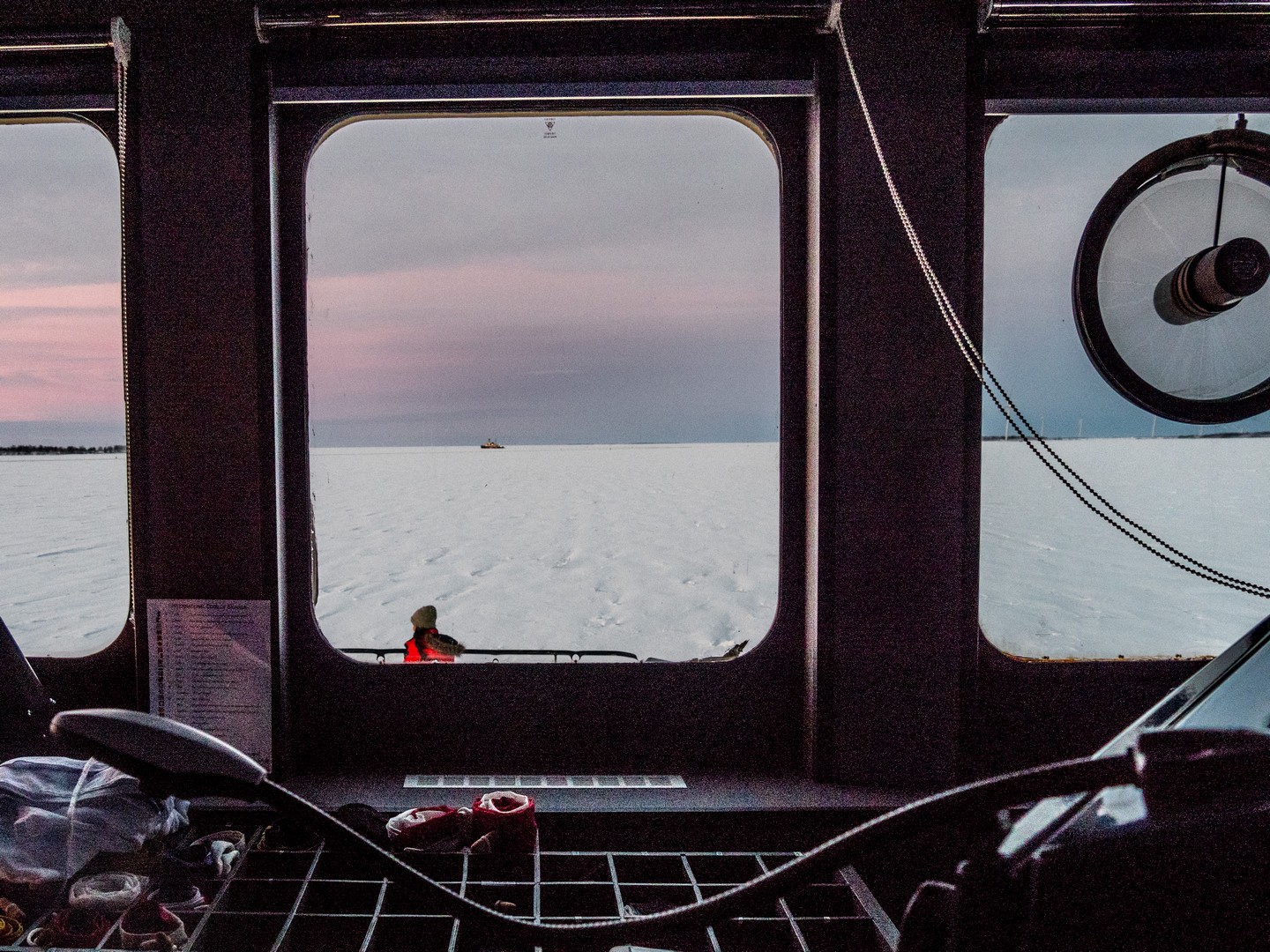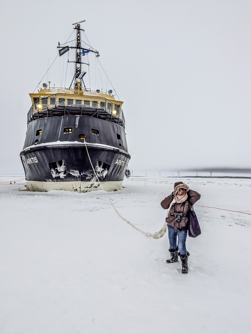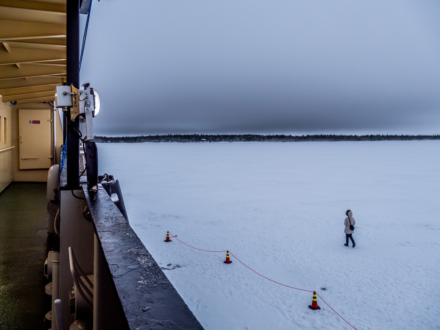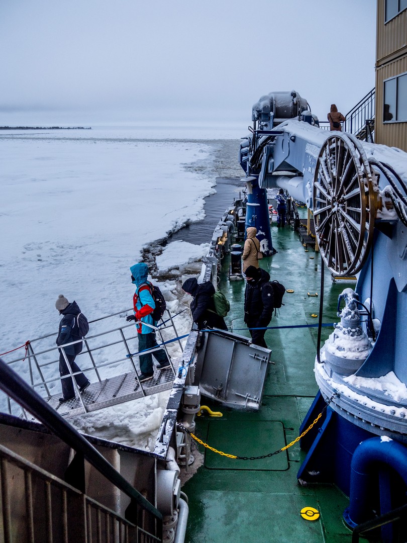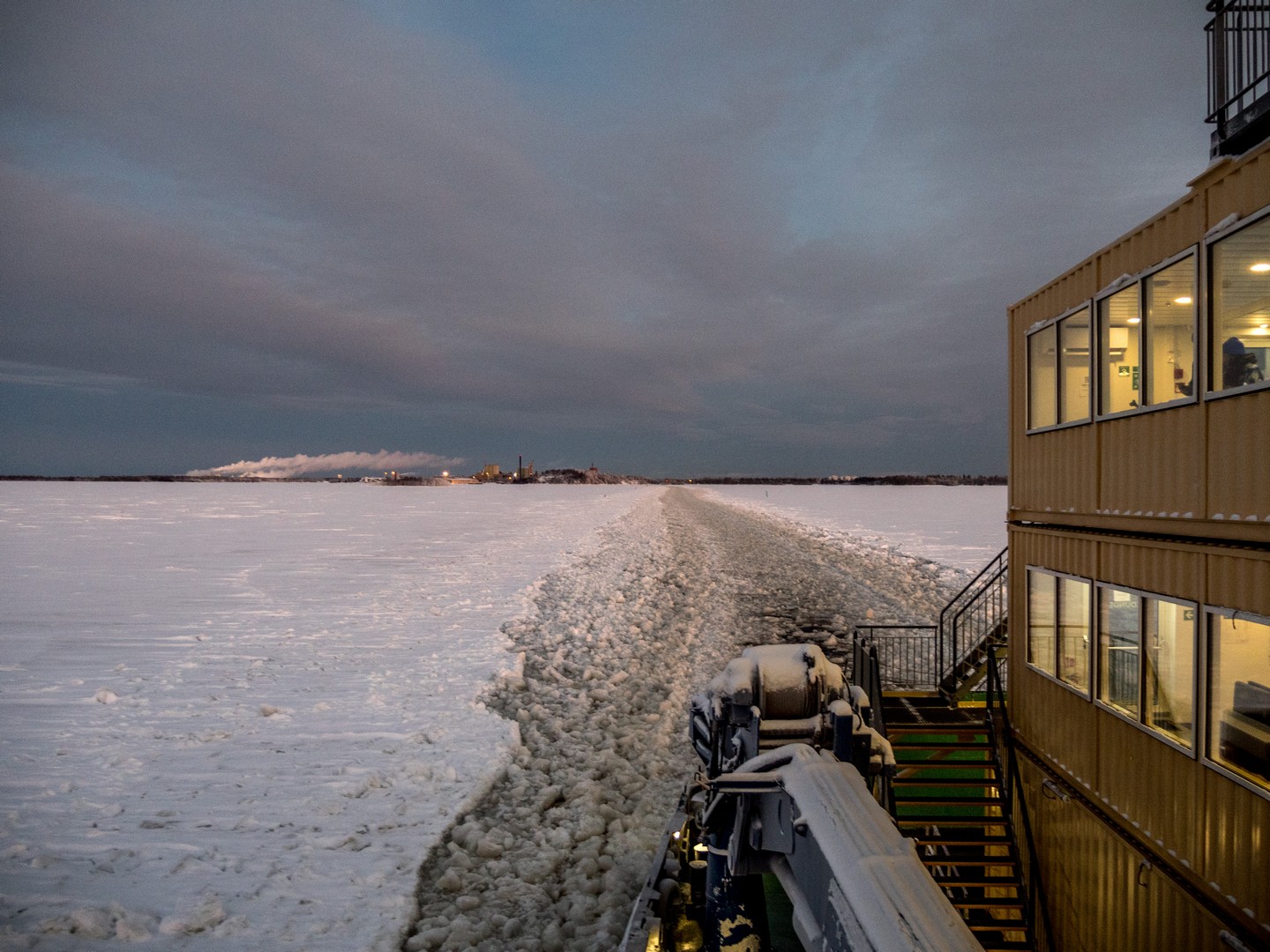 Faire un petit tour sur l’eau gelée du port de Luleå était déjà impressionnant, mais se retrouver à quelques kilomètres du rivage, au milieu de la mer, c’est encore plus marquant. D’autant plus que nous sommes au pied d’un brise-glace ! Le ciel s’est couvert et forme une masse blanche au-dessus de nos têtes. Si blanche que quand on regarde en direction du large, on ne distingue quasi pas la limite entre ciel et mer. C’est presque comme être dans un rêve un peu angoissant. Un regard derrière moi suffit à m’ancrer dans la réalité, le bateau est bien là !