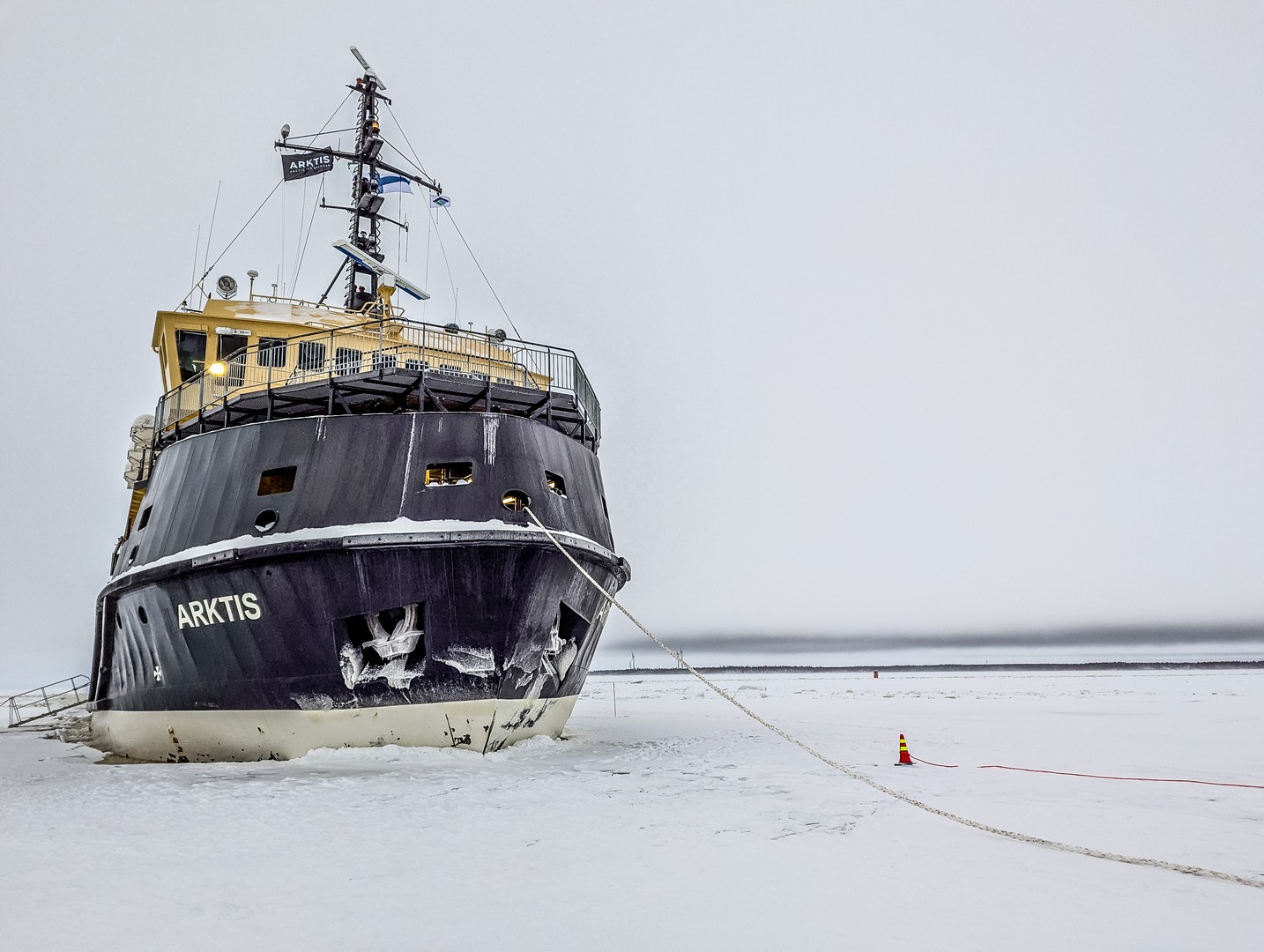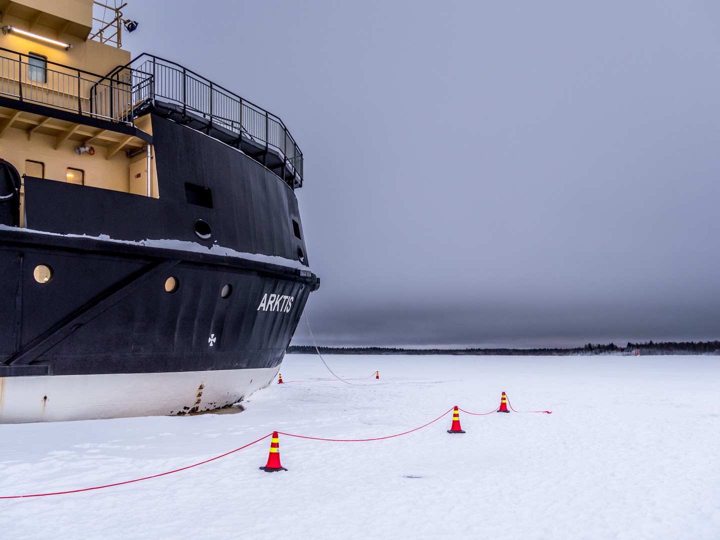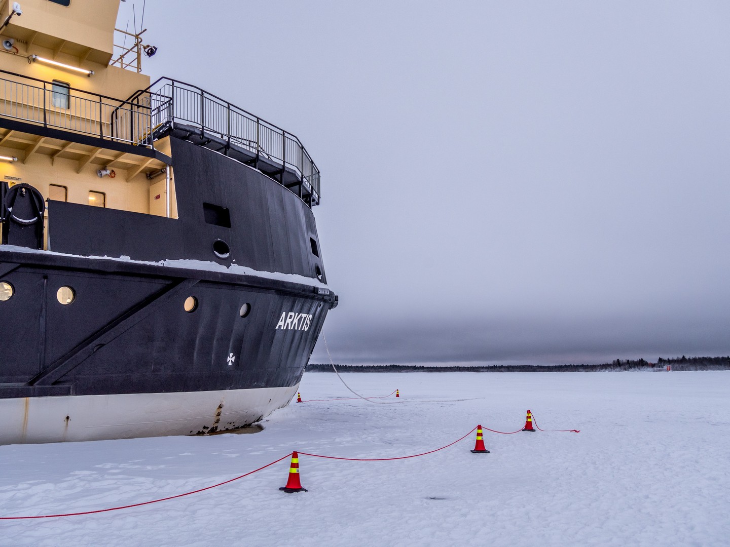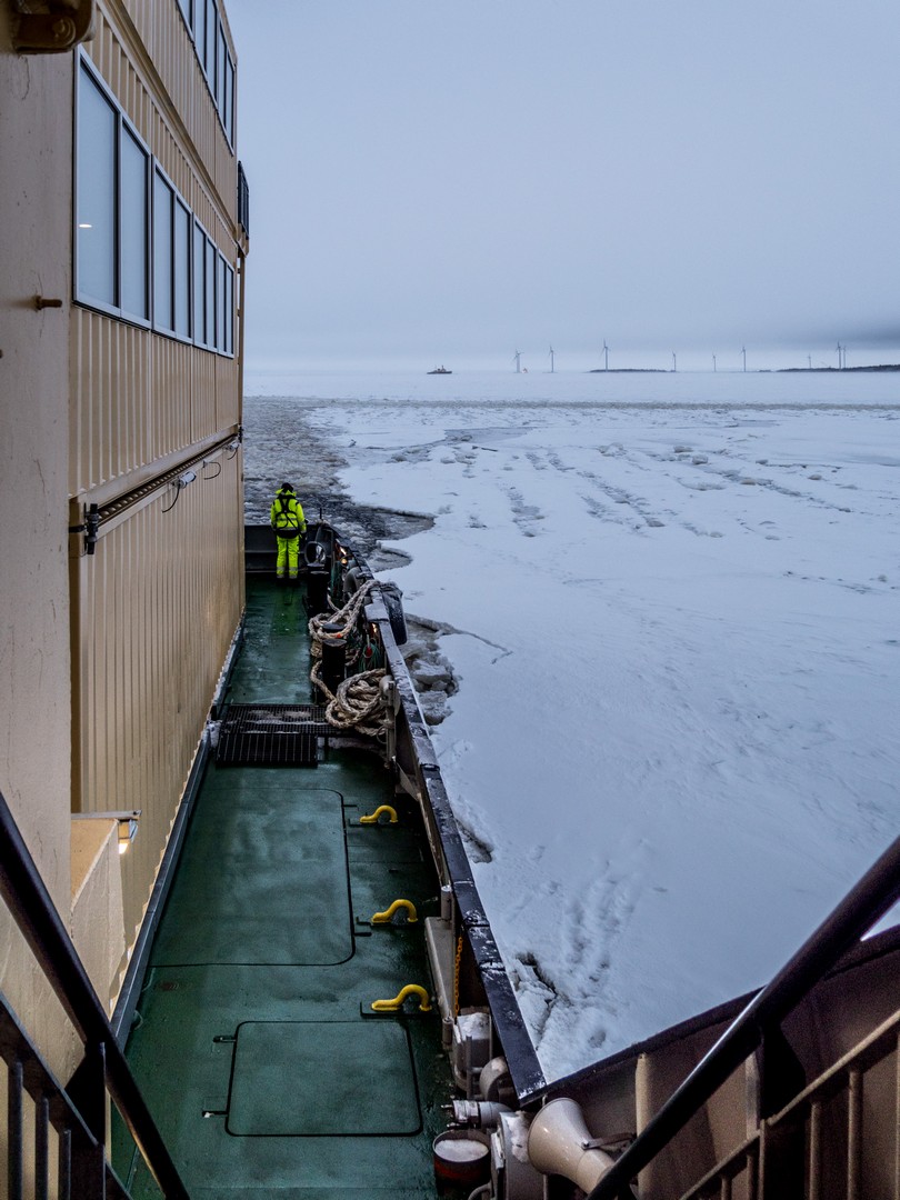 Faire un petit tour sur l’eau gelée du port de Luleå était déjà impressionnant, mais se retrouver à quelques kilomètres du rivage, au milieu de la mer, c’est encore plus marquant. D’autant plus que nous sommes au pied d’un brise-glace ! Le ciel s’est couvert et forme une masse blanche au-dessus de nos têtes. Si blanche que quand on regarde en direction du large, on ne distingue quasi pas la limite entre ciel et mer. C’est presque comme être dans un rêve un peu angoissant. Un regard derrière moi suffit à m’ancrer dans la réalité, le bateau est bien là !