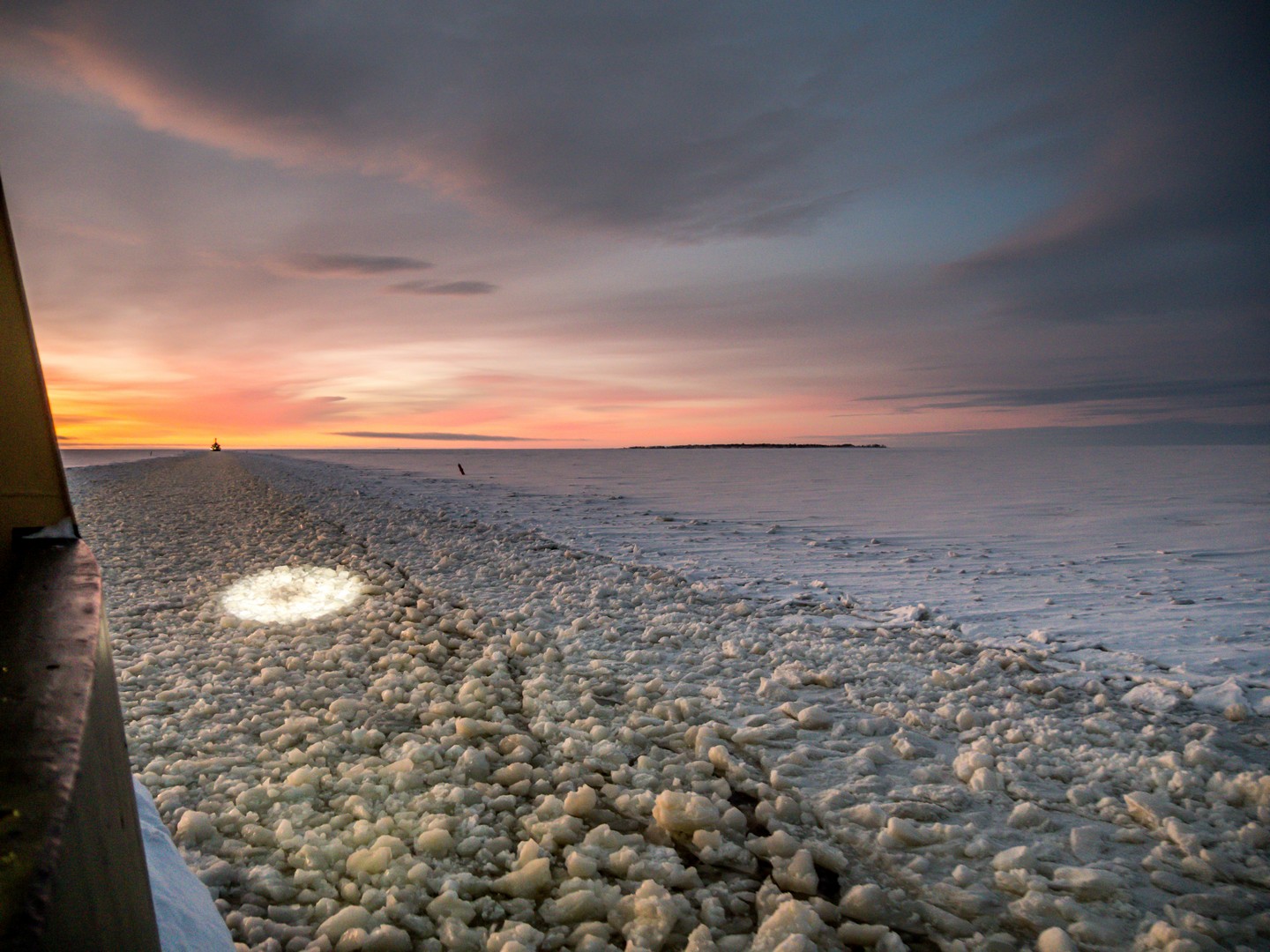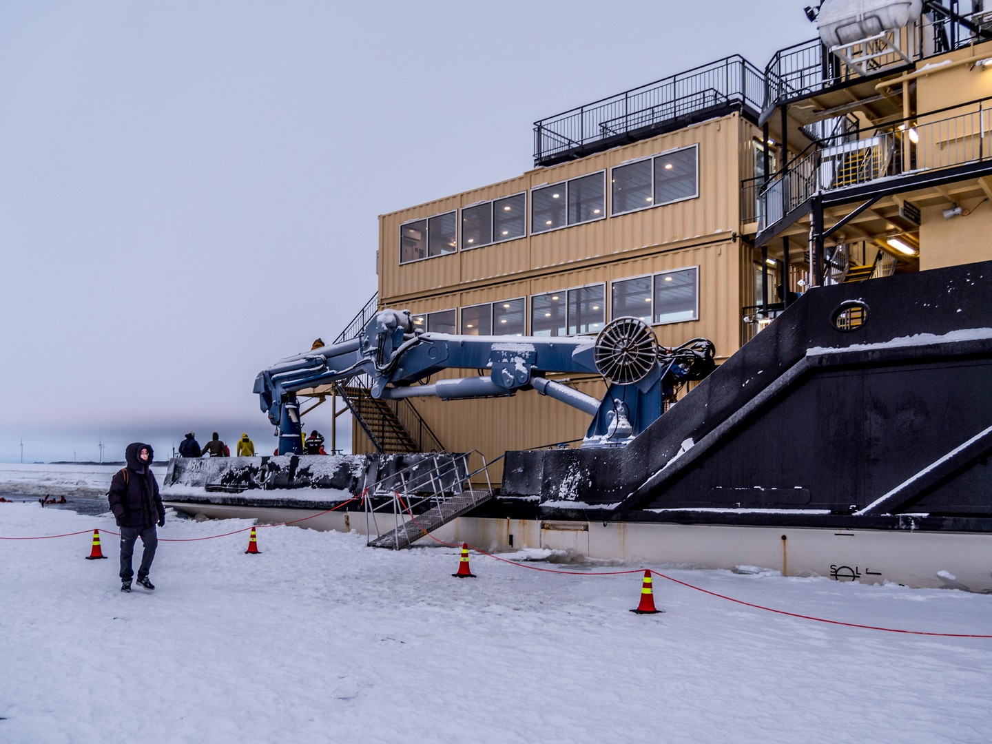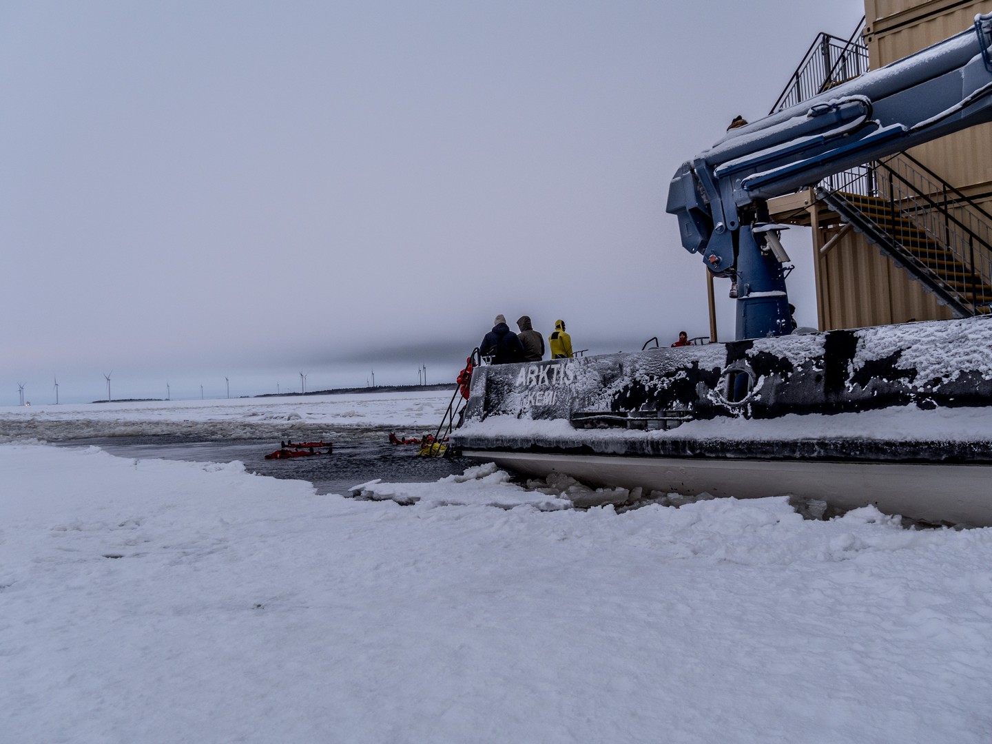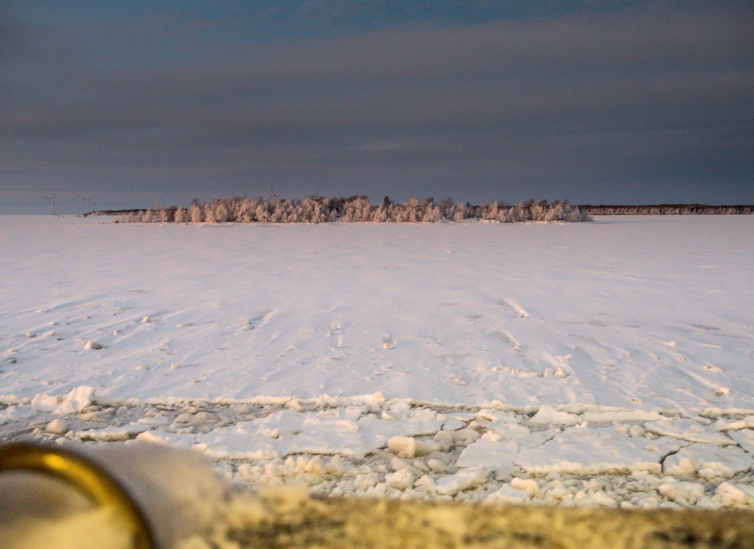 Faire un petit tour sur l’eau gelée du port de Luleå était déjà impressionnant, mais se retrouver à quelques kilomètres du rivage, au milieu de la mer, c’est encore plus marquant. D’autant plus que nous sommes au pied d’un brise-glace ! Le ciel s’est couvert et forme une masse blanche au-dessus de nos têtes. Si blanche que quand on regarde en direction du large, on ne distingue quasi pas la limite entre ciel et mer. C’est presque comme être dans un rêve un peu angoissant. Un regard derrière moi suffit à m’ancrer dans la réalité, le bateau est bien là !