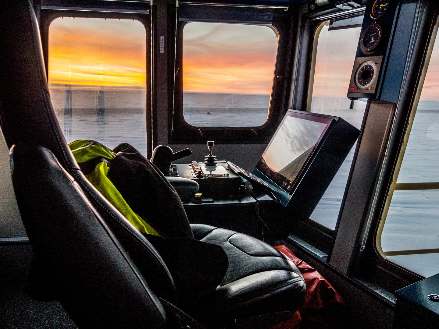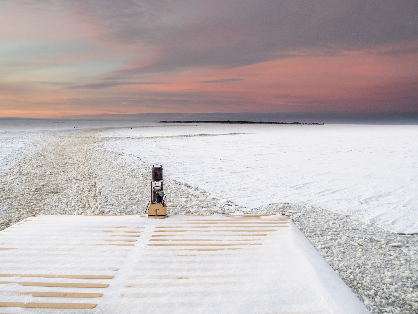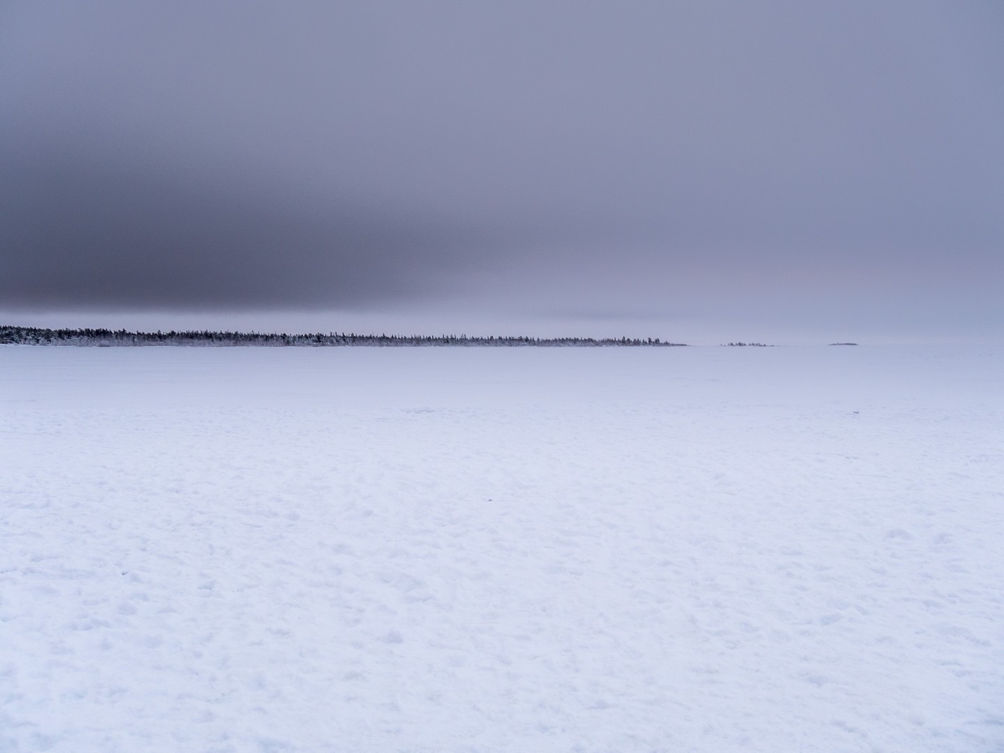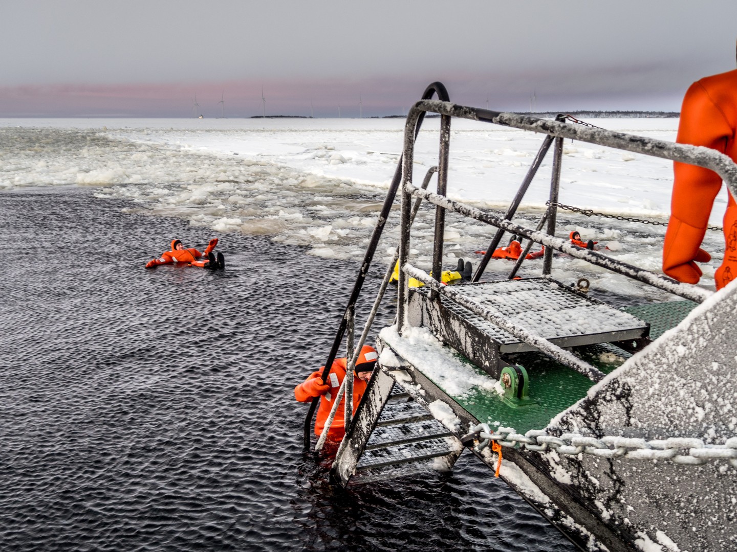 Faire un petit tour sur l’eau gelée du port de Luleå était déjà impressionnant, mais se retrouver à quelques kilomètres du rivage, au milieu de la mer, c’est encore plus marquant. D’autant plus que nous sommes au pied d’un brise-glace ! Le ciel s’est couvert et forme une masse blanche au-dessus de nos têtes. Si blanche que quand on regarde en direction du large, on ne distingue quasi pas la limite entre ciel et mer. C’est presque comme être dans un rêve un peu angoissant. Un regard derrière moi suffit à m’ancrer dans la réalité, le bateau est bien là !
