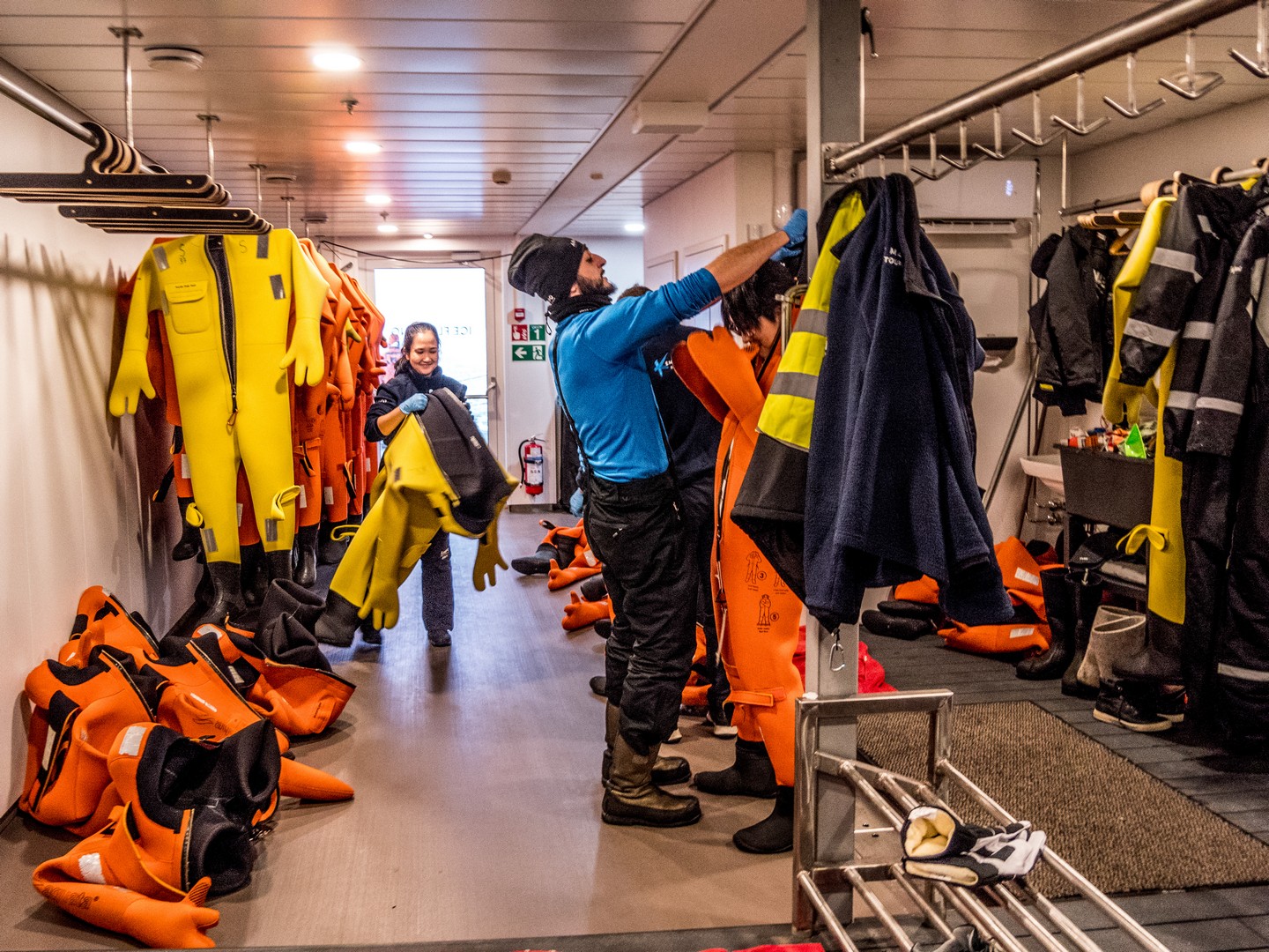 C’est le branle-bas de combat dans les vestiaires. Lors du check-in, nous avons tous reçu un bracelet de couleur différente, indiquant l’heure de passage pour notre plongeon. Les bracelets argent sont les premiers ! Nous nous déshabillons rapidement, ne gardant que nos couches techniques (sous-pull et pantalon thermique), avant d’enfiler une combinaison de survie énorme qui nous fait ressembler à des Télétubbies orange. Tout doit être parfaitement étanche et pas un cheveu ne doit dépasser. Aidés par les employés de l’Arktis, nous voilà fin prêts.