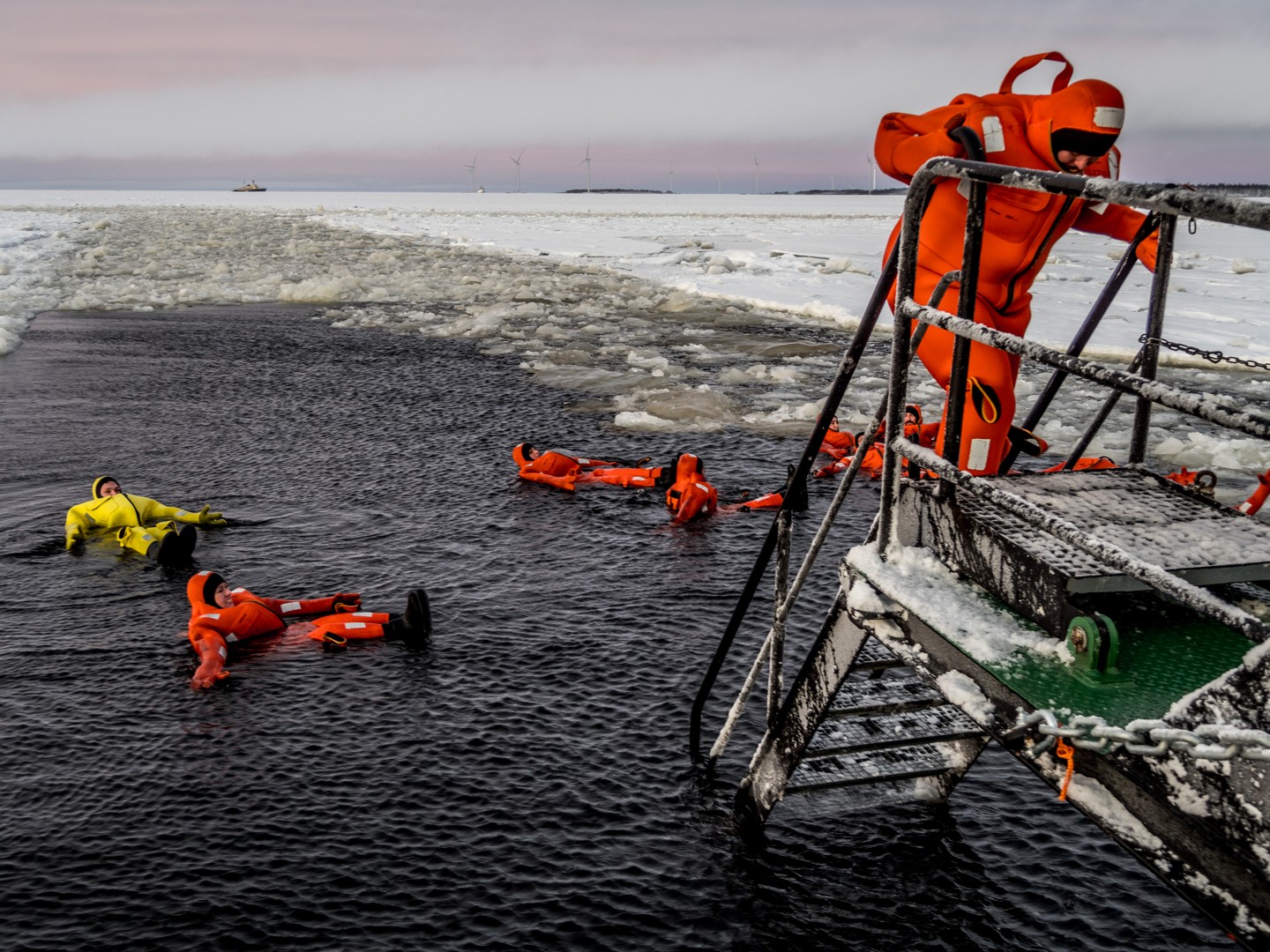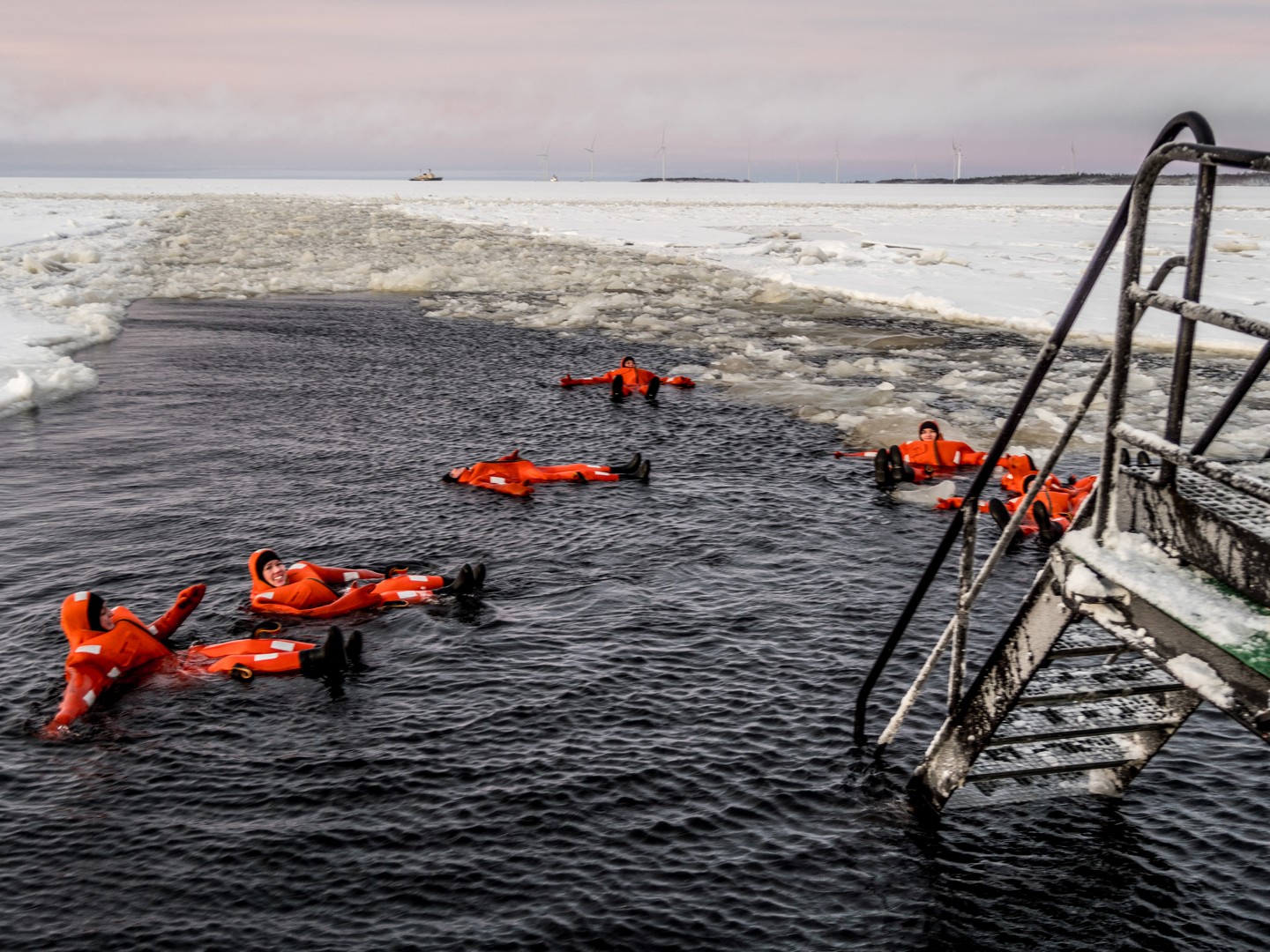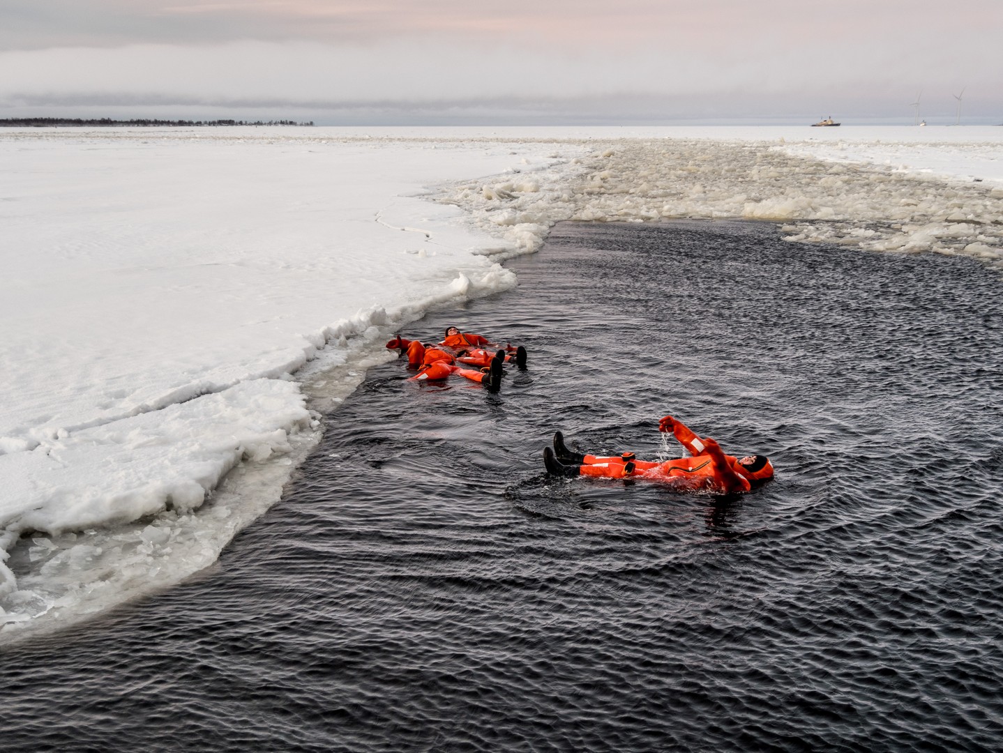 On a l’air parfaitement ridicules, mais sachez que cette combinaison peut littéralement vous sauver la vie : on peut y survivre jusqu’à six heures dans l’eau glacée ! Elle est tellement imposante et pleine d’air qu’il est pratiquement impossible de couler.