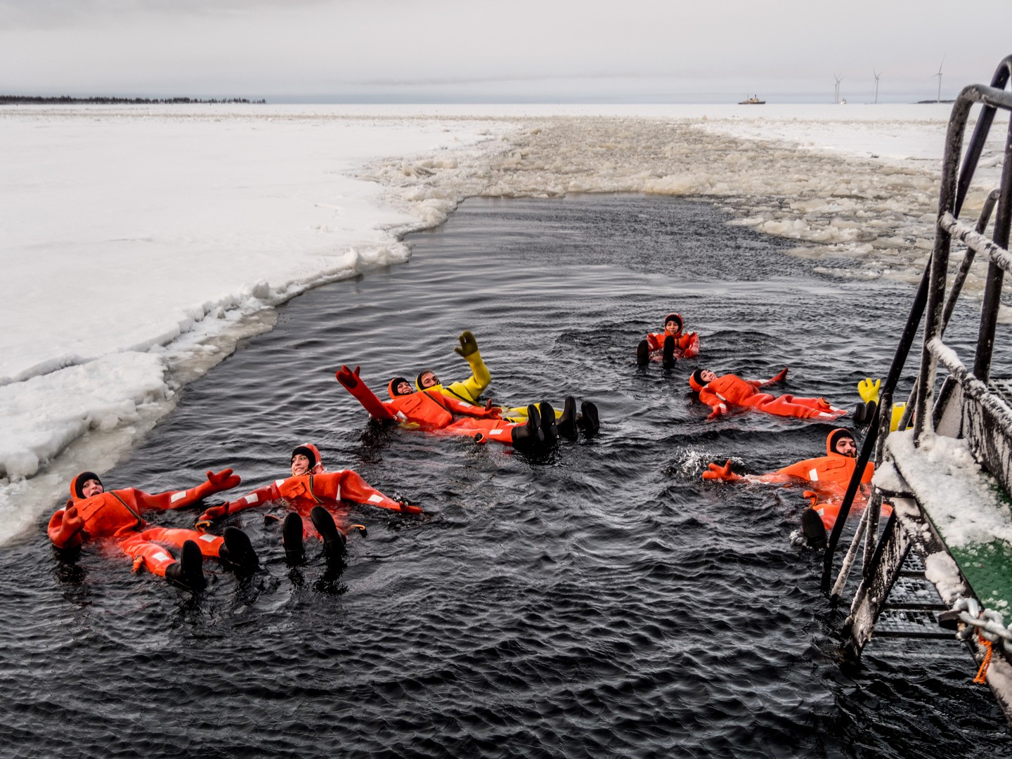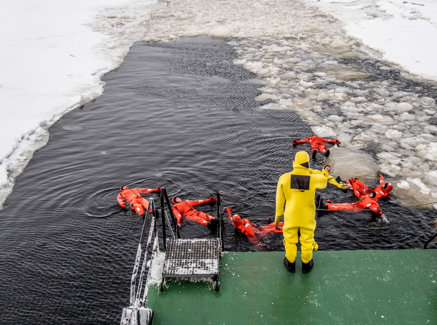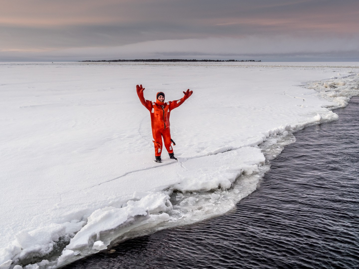 Le plus compliqué, c’est d’éviter les autres baigneurs, car se diriger dans cette combi alors qu’on flotte sur le dos n’est pas une mince affaire. De temps en temps, ma tête heurte quelque chose. Quelqu’un ? Non, un morceau de glace ! Parfois, quelques gouttes d’eau éclaboussent mon visage. Après une brève appréhension – craignant qu’elles ne gèlent instantanément – je réalise que tout se passe bien. Les températures sont négatives, mais pas excessivement. L’eau glisse sur mes lèvres… et elle est étrangement peu salée. J’avoue que le moment est totalement surréaliste !