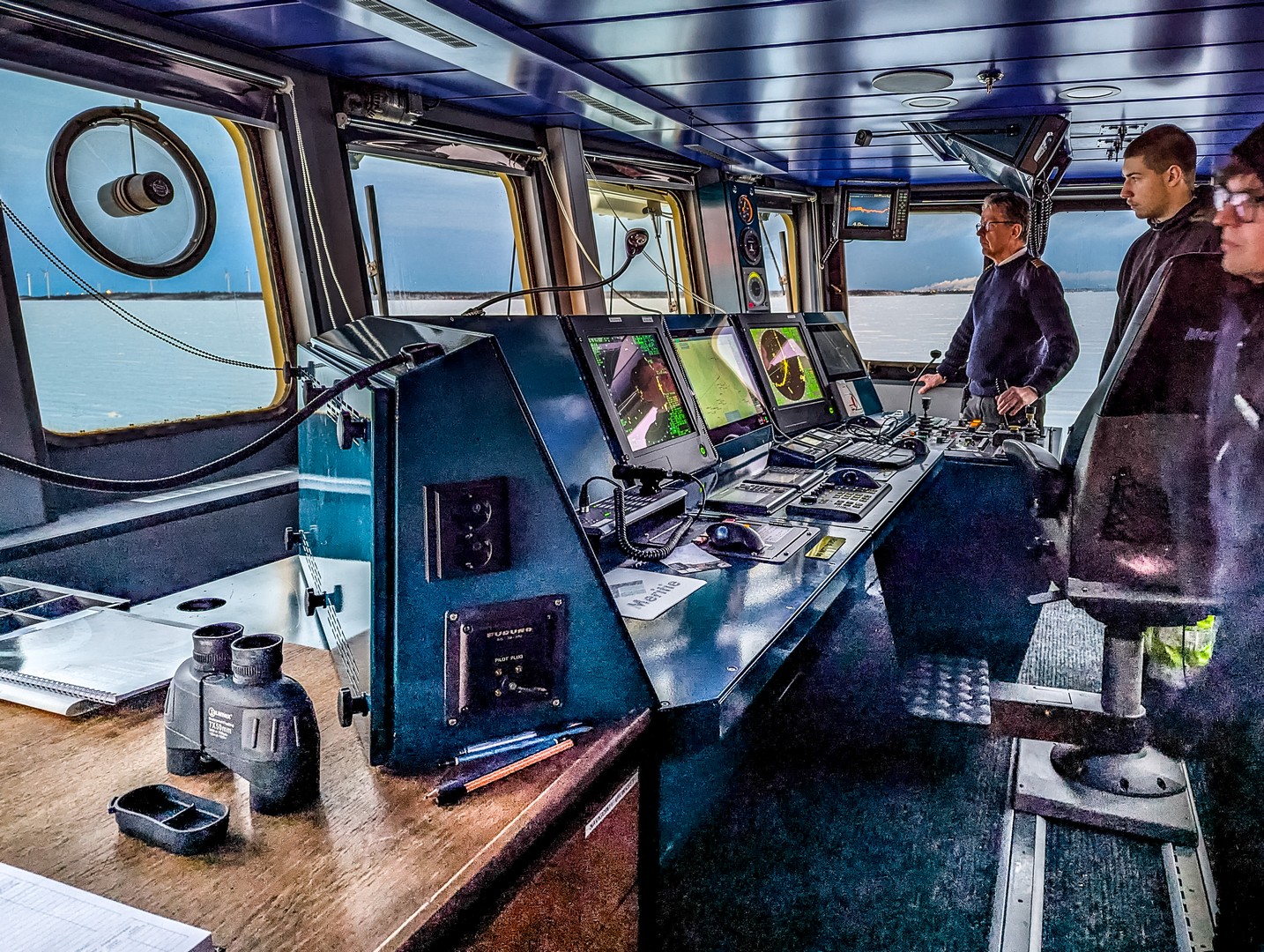 Je suis tirée de ma rêverie quand on nous signale que nous sommes invités à faire un petit tour au poste de pilotage. J’ai un peu l’impression de débouler comme un chien dans un jeu de quilles quand nous envahissons l’espace où se trouvent le commandant, le second, le navigateur… mais très vite, on se fait discrets. L’intérieur ressemble plus à une salle informatique avec plein d’écrans qu’à un poste de navigation et, si vous pensez trouver le commandant derrière une roue, détrompez-vous : le navire se dirige à l’aide… d’un joystick ! Mais depuis là-haut, la vue est imprenable.
