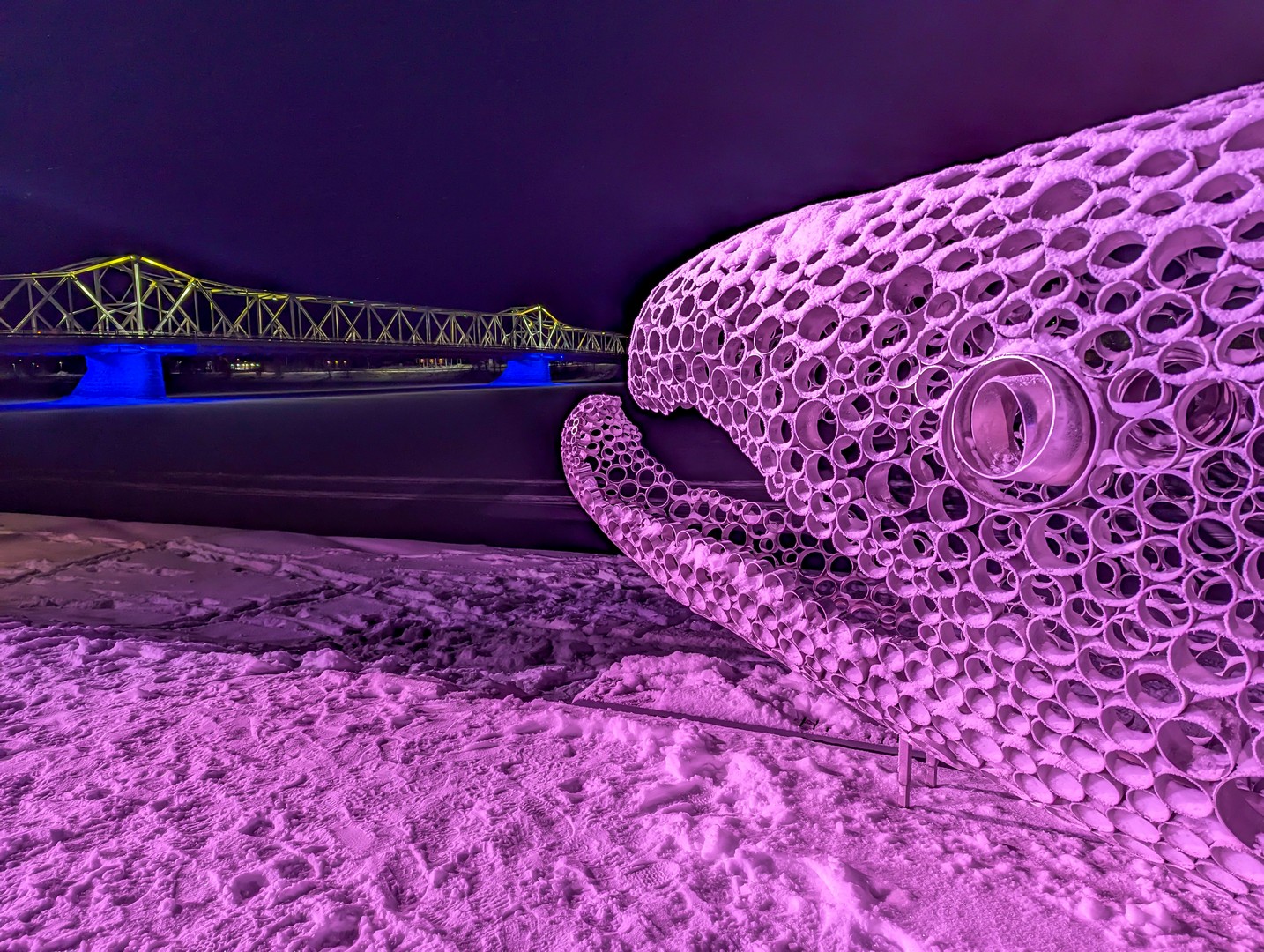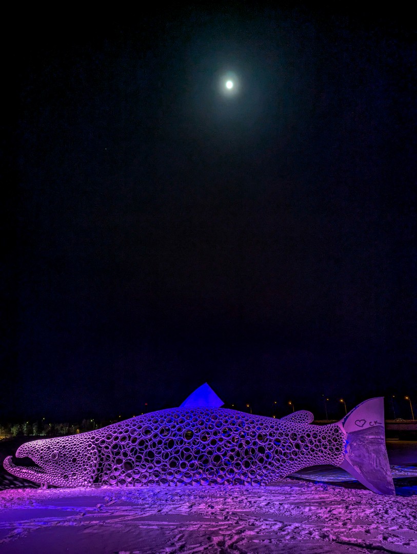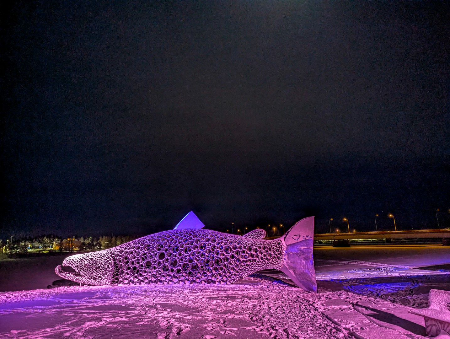 Il n’est pas si tard lorsque nous arrivons dans le centre-ville, relativement petit. Tout est calme, presque trop calme. Pas un chat dans les rues. Peut-être parce que c’est dimanche ? On dirait une ville fantôme. Tornio n’étant pour nous qu’une étape pour manger et dormir, nous n’en verrons pas grand-chose… sauf la grande sculpture faite de cercles d’acier, baptisée « Kojamo », qui représente un immense saumon. Posée sur une petite falaise au-dessus du fleuve, elle symbolise l’importance du poisson et de l’industrie pour Tornio. Toute illuminée à la nuit tombée, avec une pleine lune brillant sur le fleuve, le métal en devient poétique. N’hésitez pas à entrer dans la sculpture pour prendre quelques jolies photos.
