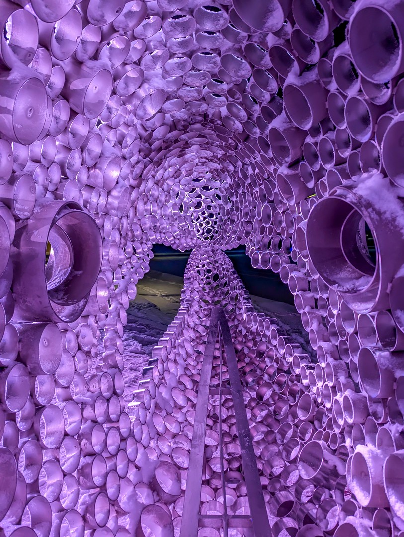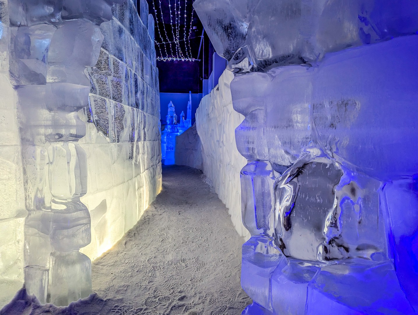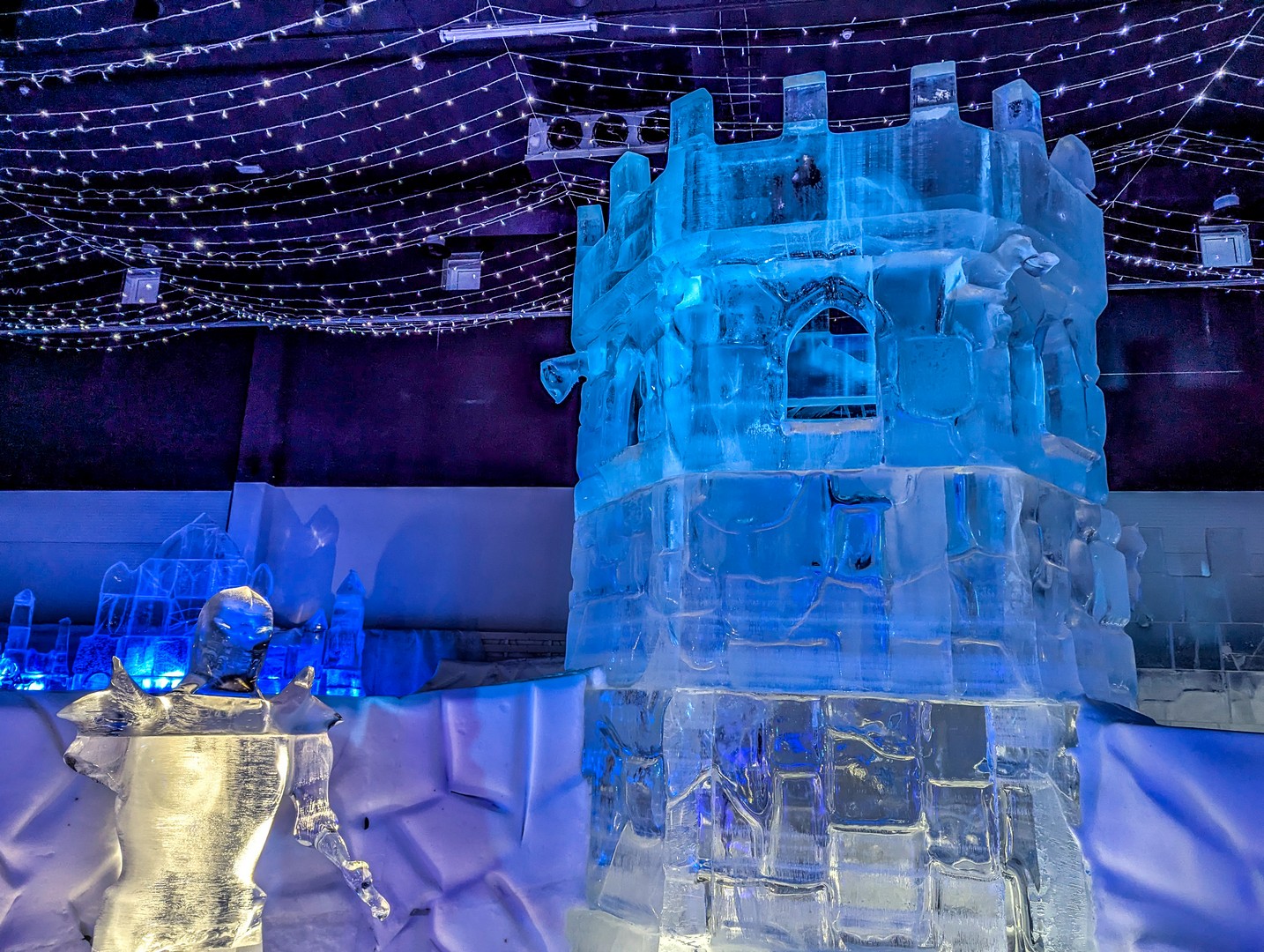 Seconde étape : le château des glaces d’Experience 365. Si Lumilinna est connue, c’est pour son village des neiges qui reprend forme tous les hivers (et que nous ne verrons pas). Mais que faire une fois la neige fondue pour continuer à attirer les visiteurs ? Simple ! Créer un château des glaces dans un endroit constamment réfrigéré. À l’intérieur, d’énormes morceaux de glace sculptée sont agencés pour construire un château médiéval : tours crénelées, trône royal, grande table pour les festins, statues de chevaliers… et même un toboggan de glace que je n’ai pas hésité à descendre ! On retrouve vraiment son âme d’enfant ici !