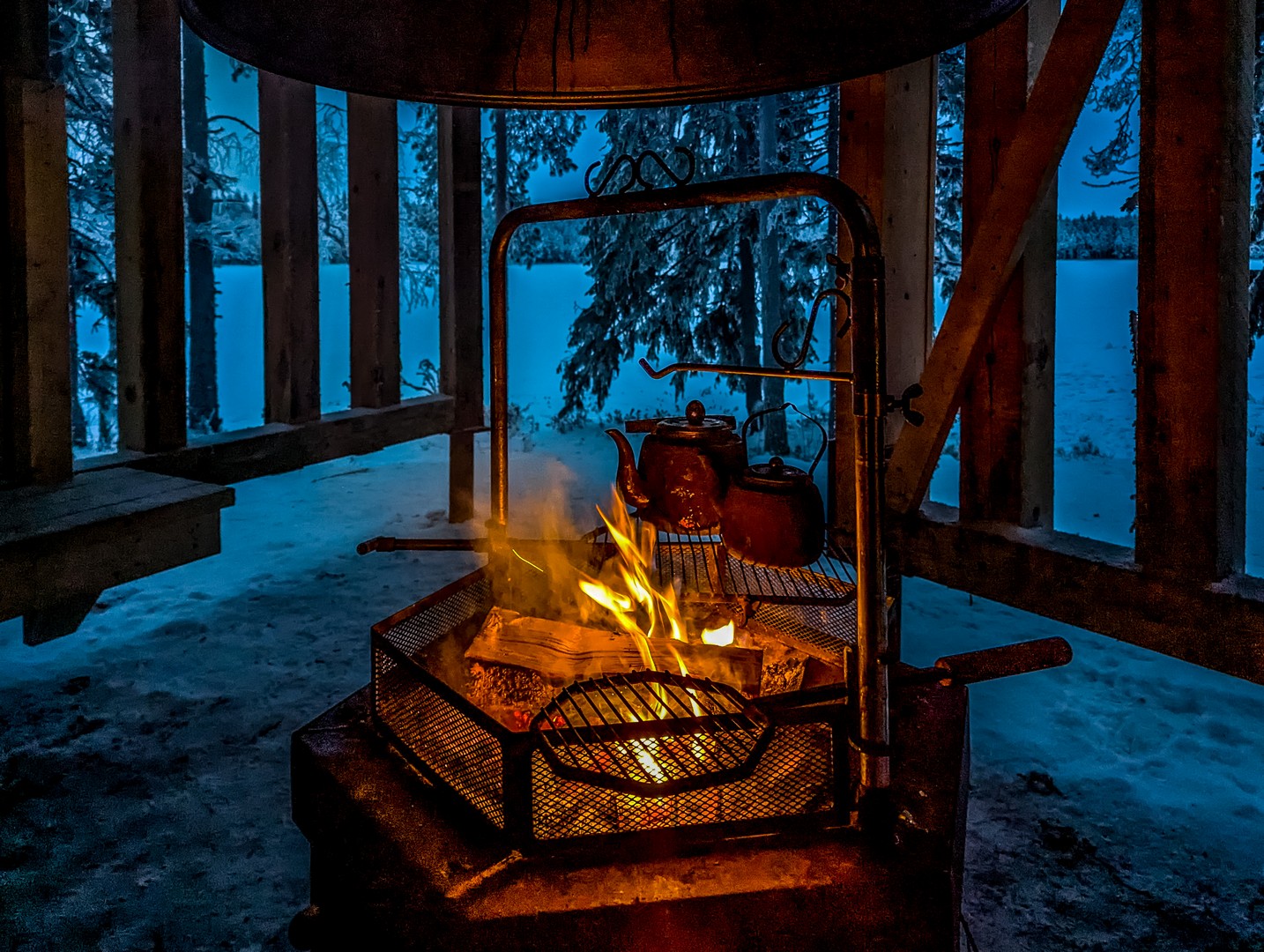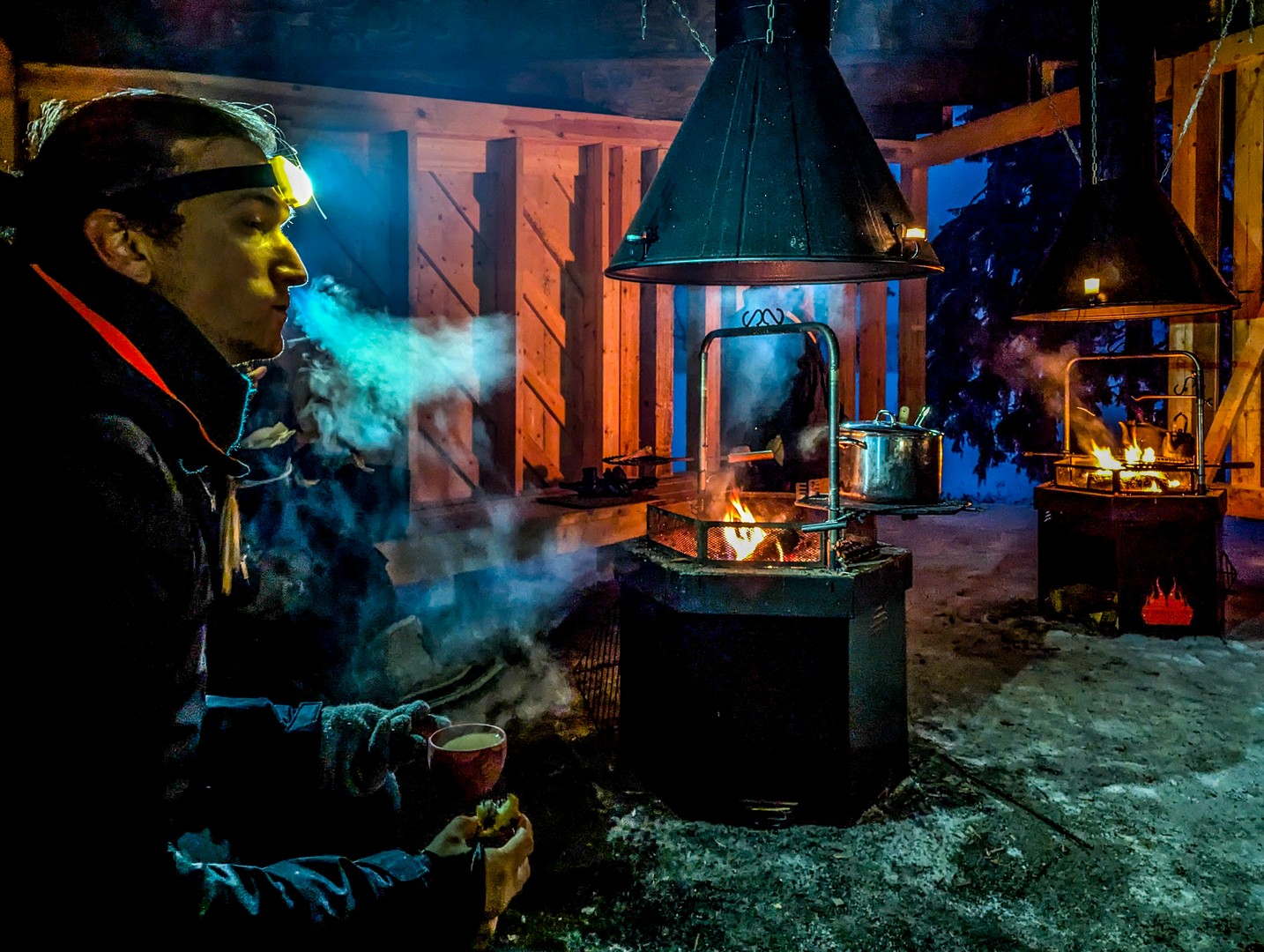 Après la promenade, Rita nous guide vers un abri où un feu réchauffe une bouilloire de soupe. Nous sommes conviés à un apéritif forestier : soupe de patates douces, pain noir, salade de champignons, spread à l’ortie, gâteau à la myrtille… Je me sens apaisé : l’odeur de fumée, la chaleur de la soupe, la lumière dorée de l’abri contrastant avec le bleu glacial de l’extérieur, et la bonne humeur régnant entre nous. Oui, la forêt opère bel et bien.