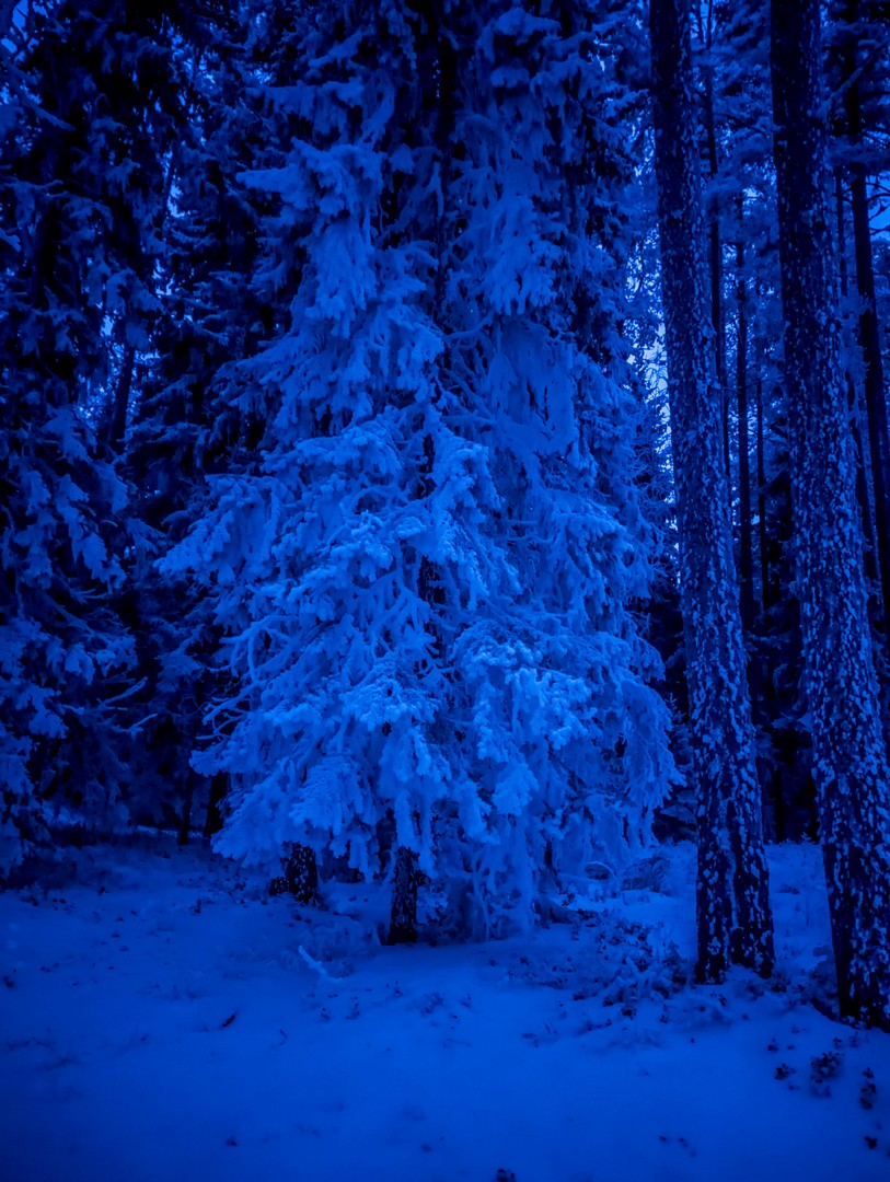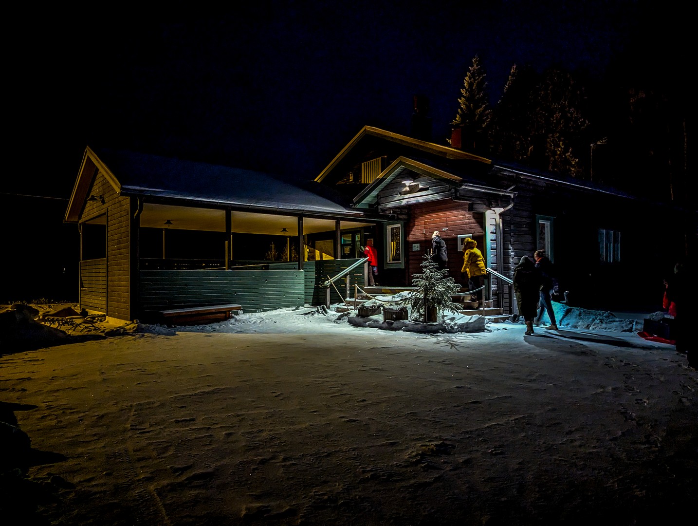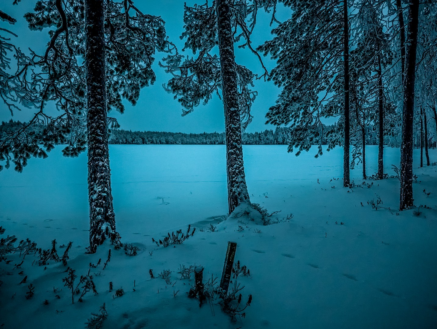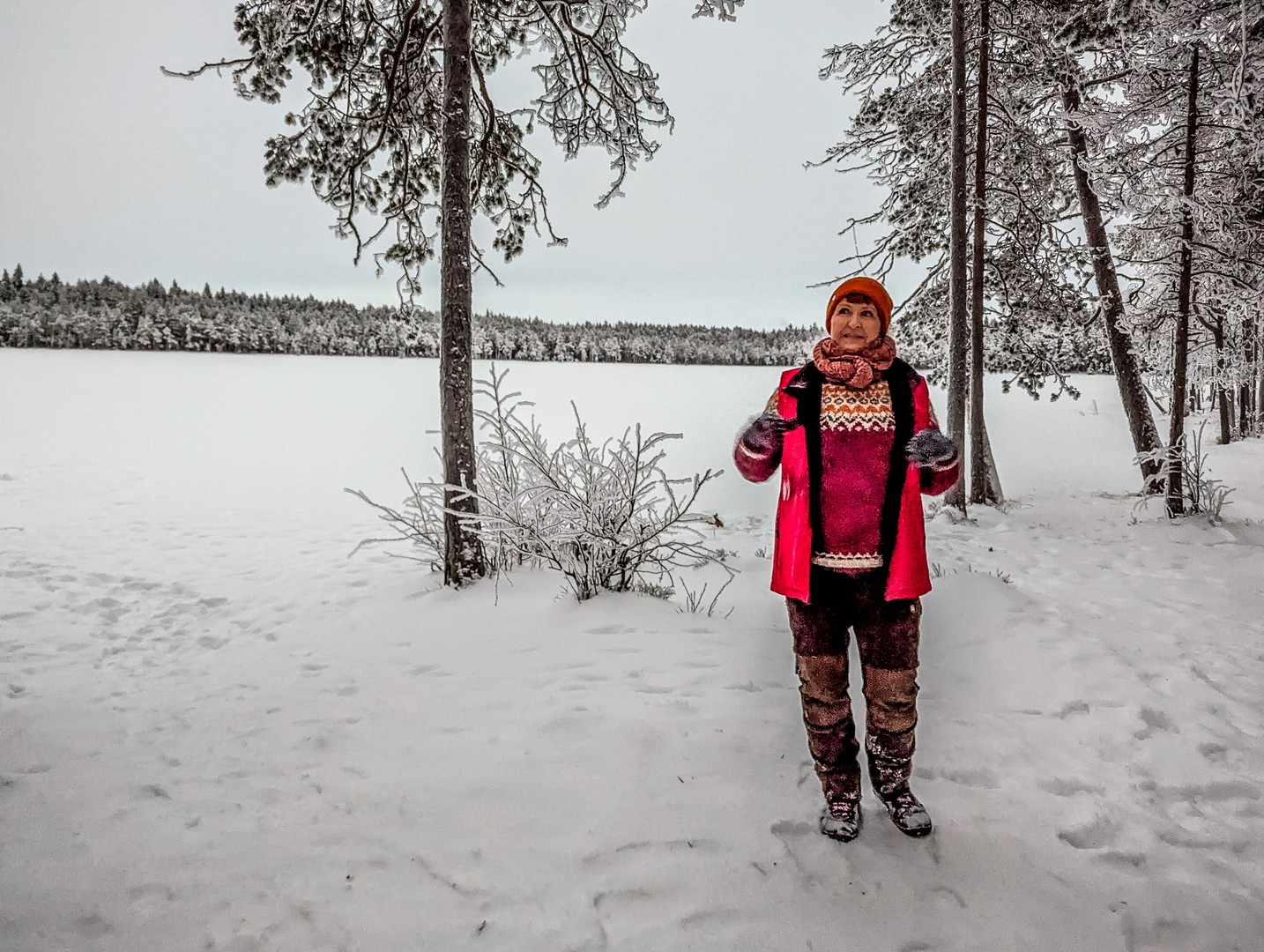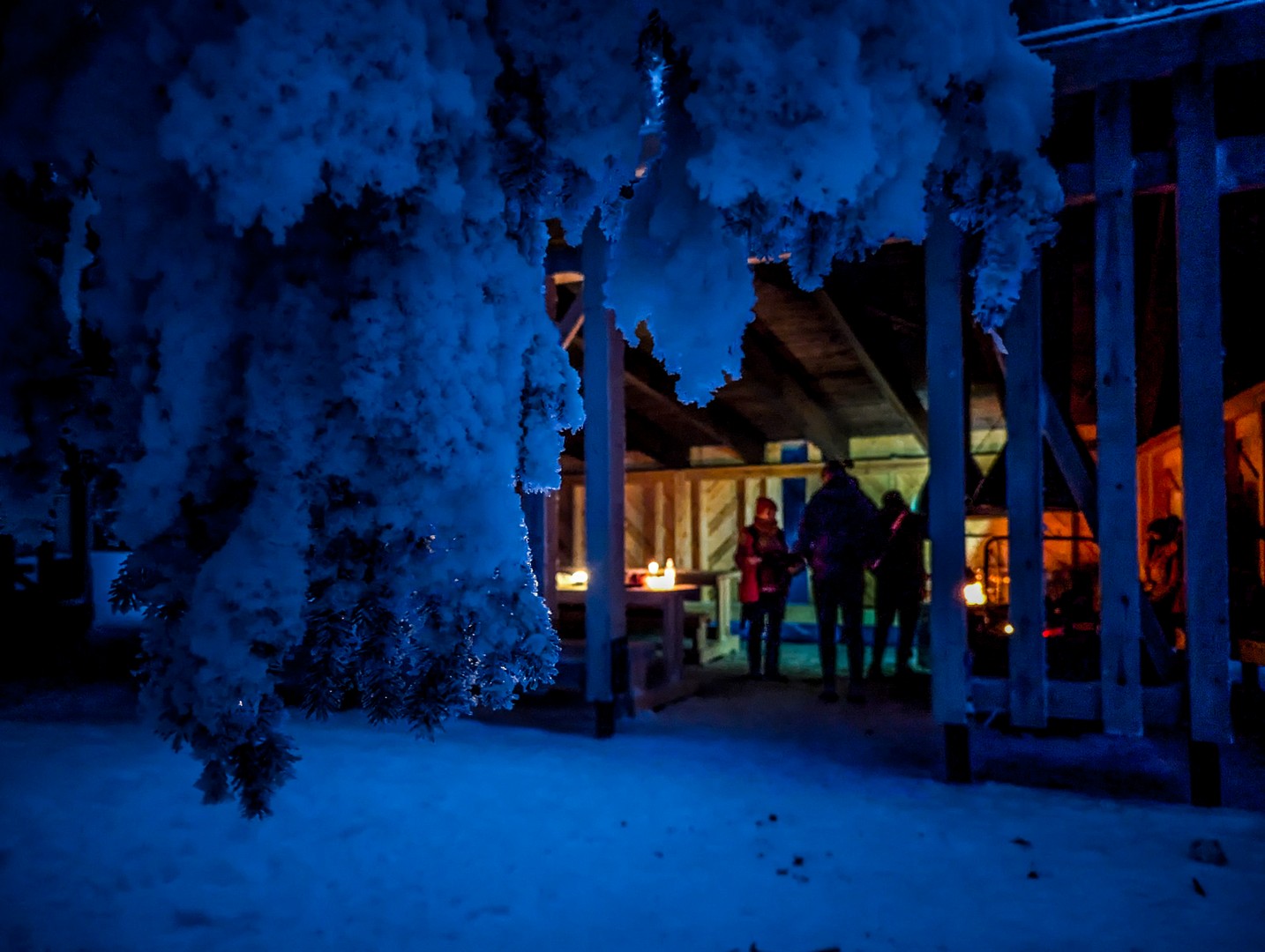 Enfin, nous débarquons en lisière d’une forêt de pins, alors que le soleil se couche. Pas de jolies lueurs orangées cette fois, mais un crépuscule bleu-gris qui nous accueille à la réserve naturelle de Sanginjoki. Il n’est pas seul : Rita Porkka, la patronne de Naturest et sa collègue nous attendent elles aussi pour une brève exploration. Naturest propose des services variés pour découvrir la réserve : randonnées, ateliers nature, soin de la santé mentale par la forêt (yoga en forêt)… Les activités ne manquent pas. Rita nous emmène d’ailleurs en balade pour admirer le paysage avant la nuit.