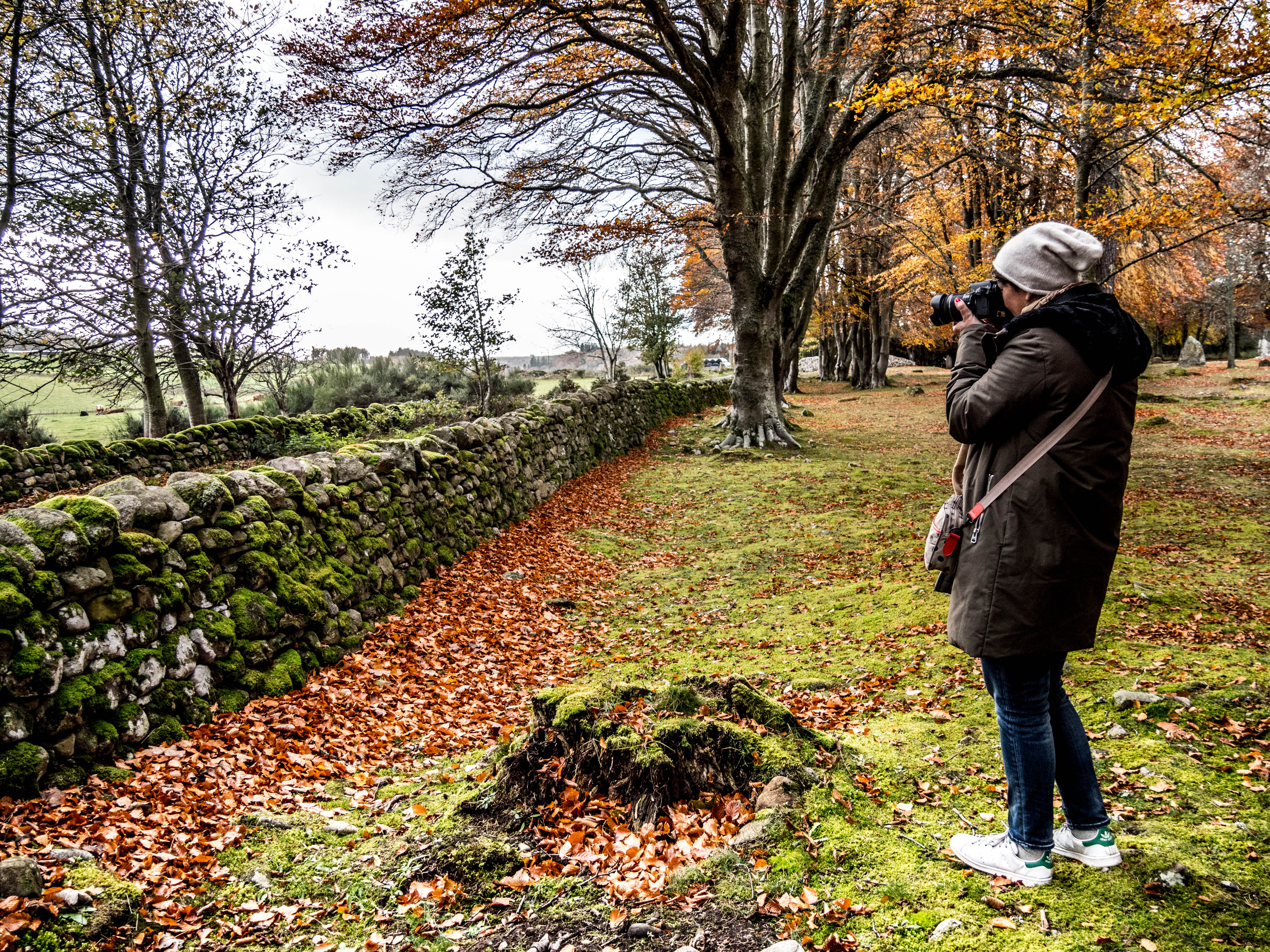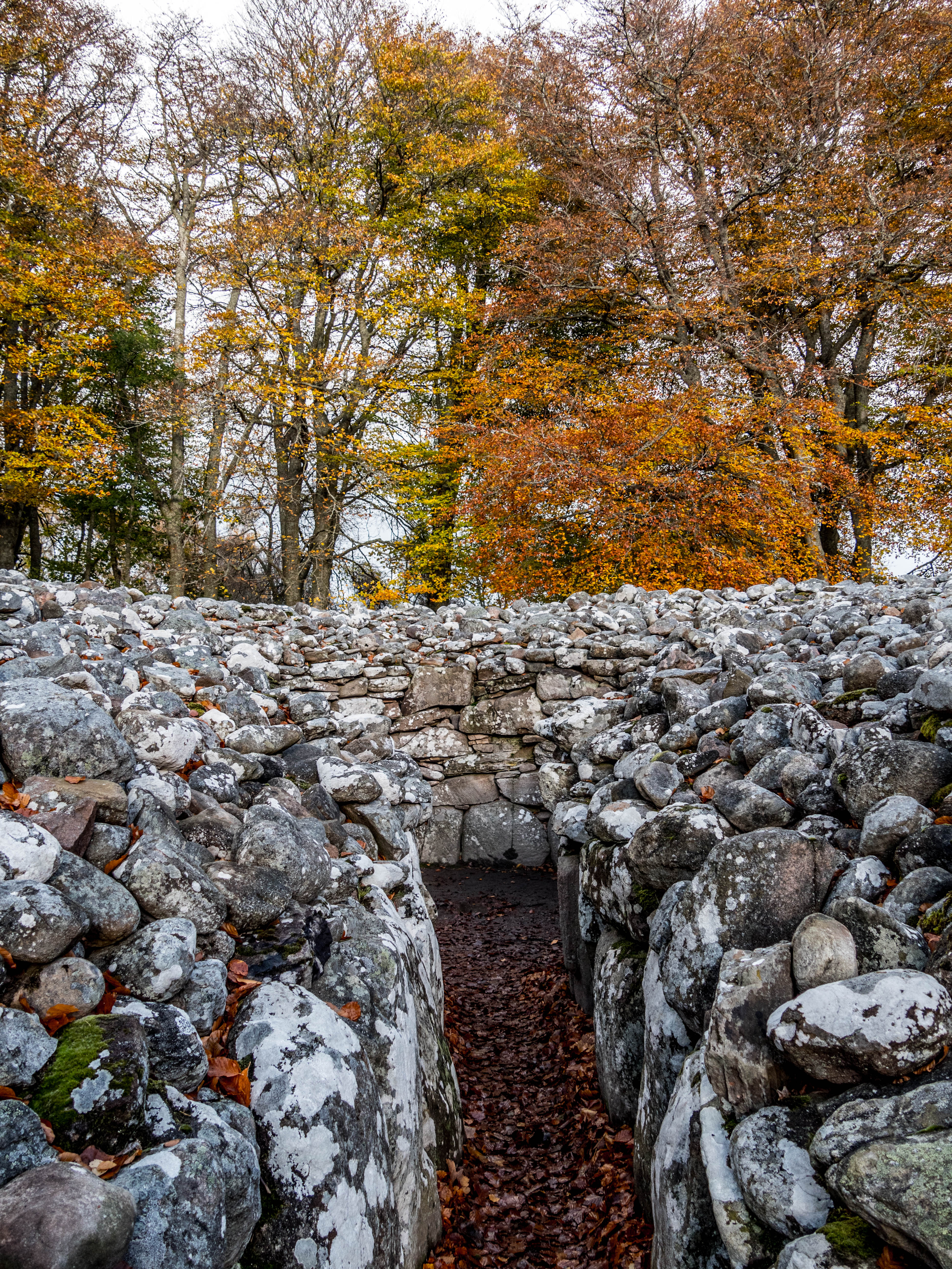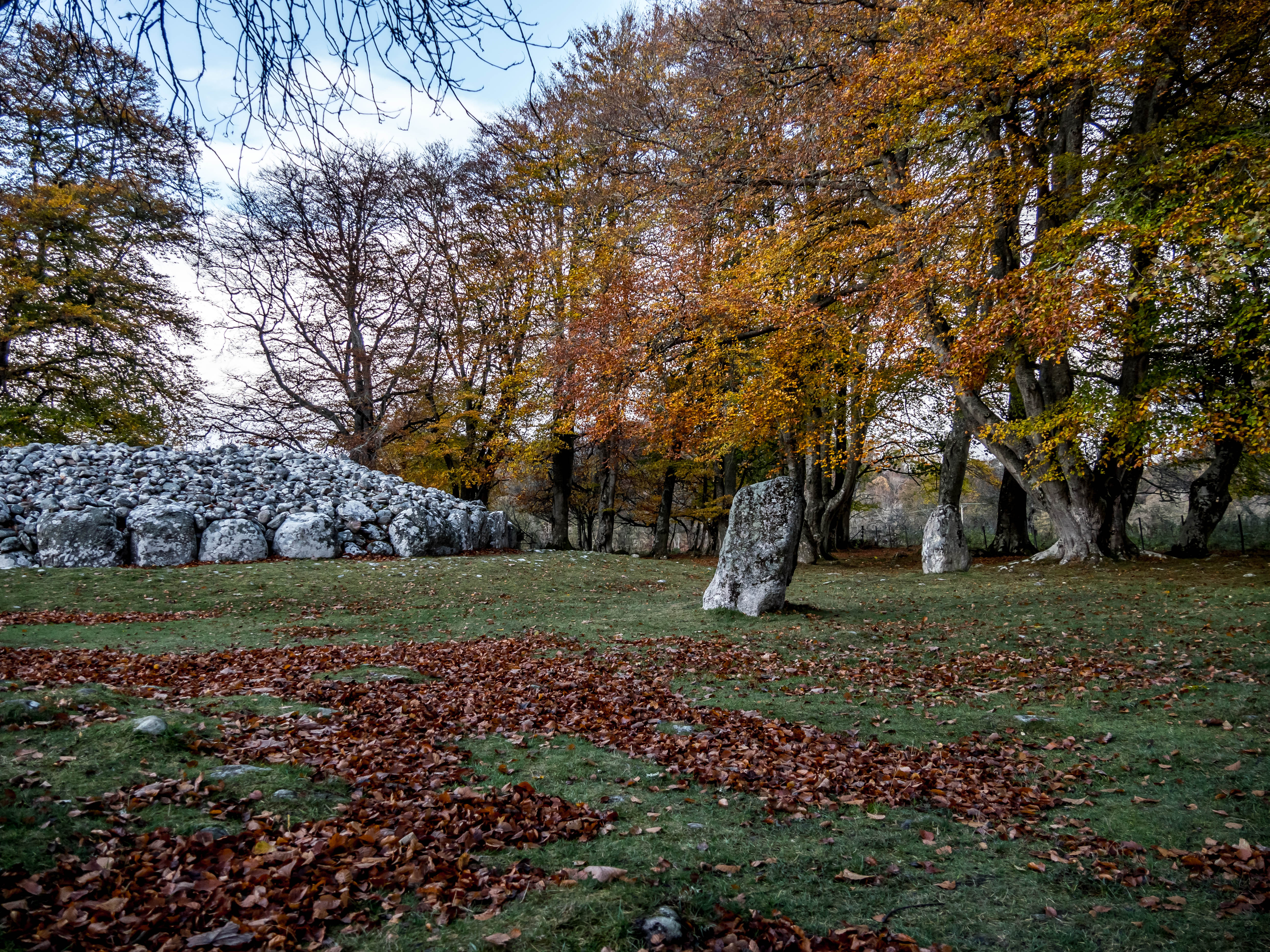 Fans des aventures de Claire Beauchamp-Randall-Fraser, je vais vous décevoir : Craigh na Dun n’existe pas. Par contre, la fameuse pierre magique, elle, fait partie du complexe de Clava Cairns (le site plus large étant celui de Callanish Stones dans les Hébrides extérieures). Elle se dresse de manière imposante sur ce petit ensemble de tombes datant de l’âge de bronze. Pour les archéologues, il s’agit d’une série de chambres à tombes qui témoignent de la vie des hommes il y a des milliers d’années mais pour les plus rêveurs, c’est aussi un endroit porteur d’une certaine force ésotérique. La tombe à couloir, dont l’étroit passage est orienté de manière à ce que les rayons du soleil y entrent au solstice d’hiver, en est le plus bel exemple… et il se trouve qu’au moment où nous sommes arrivés aux Clava Cairns, le soleil est soudainement réapparu, illuminant le feuillage d’automne d’une lueur de feu. Finalement, se passerait-il vraiment « quelque chose » à Clava Cairns ? En tout cas, je ne suis étrangement pas très à l’aise lorsque je me retrouve nez-à-nez avec la fameuse pierre. Heureusement, pas de drôle de sifflements, ni de transport mystérieux au XVIIIe siècle, à l’époque des révoltes jacobites, au moment où je touche la pierre.
