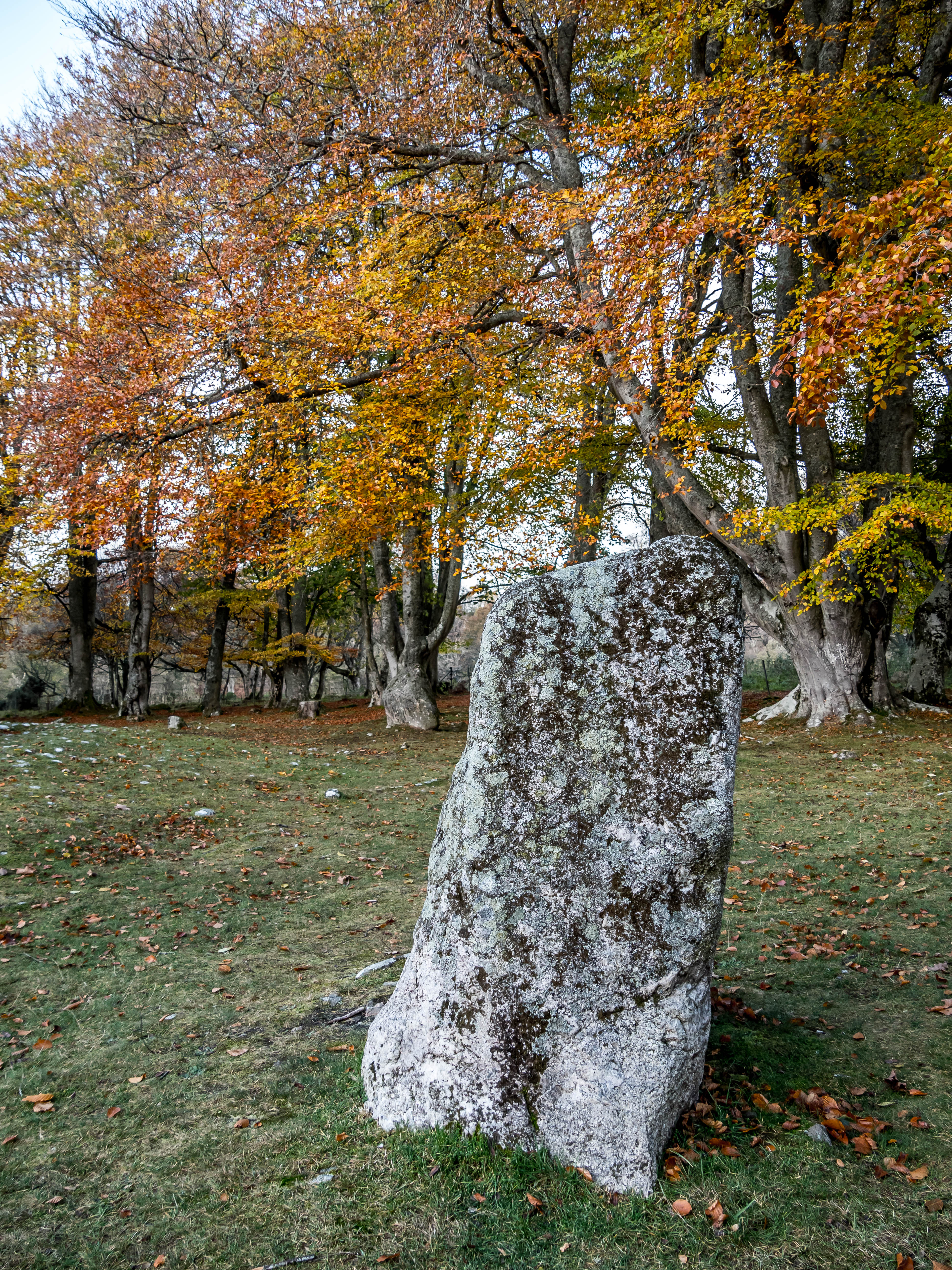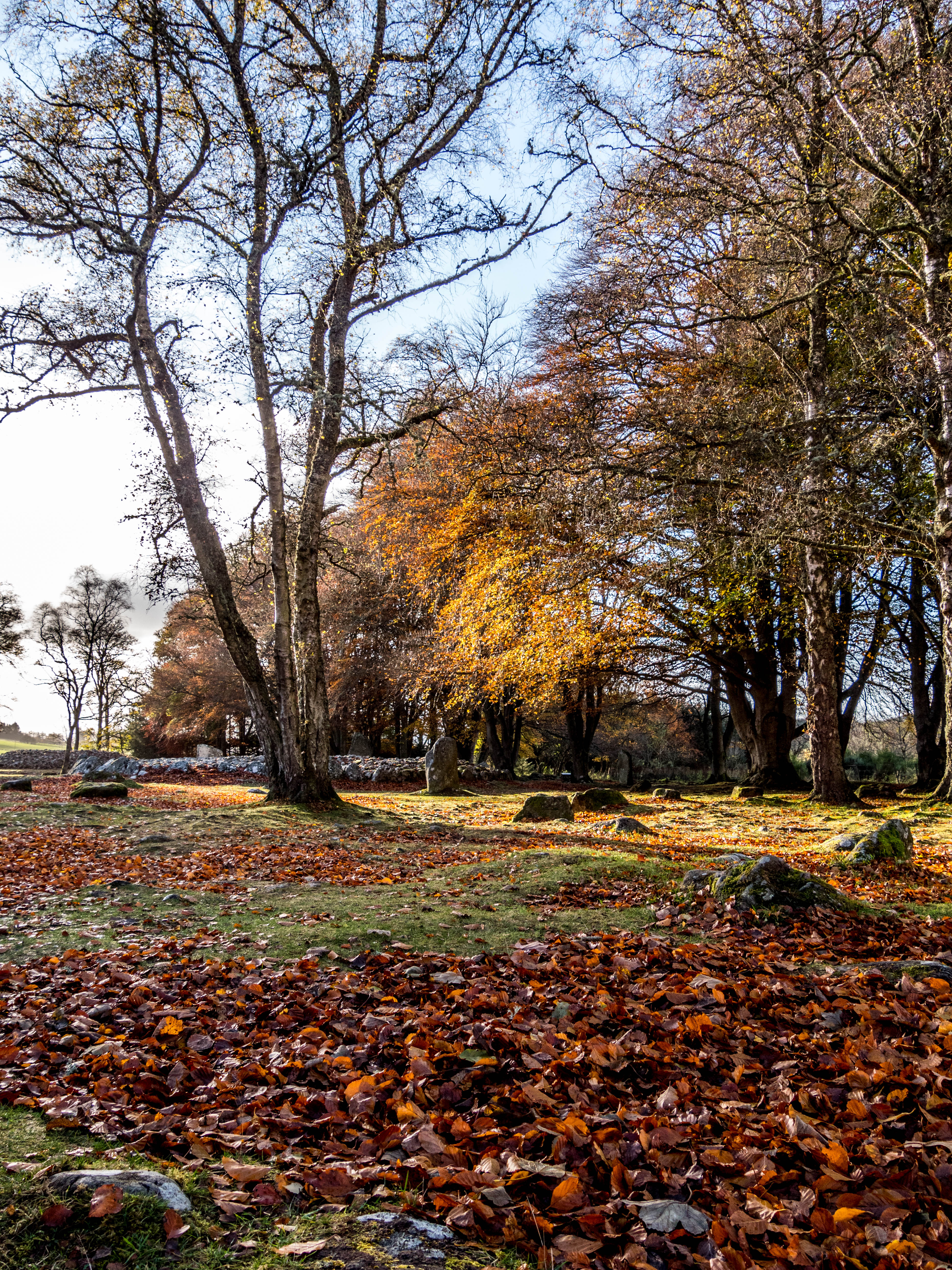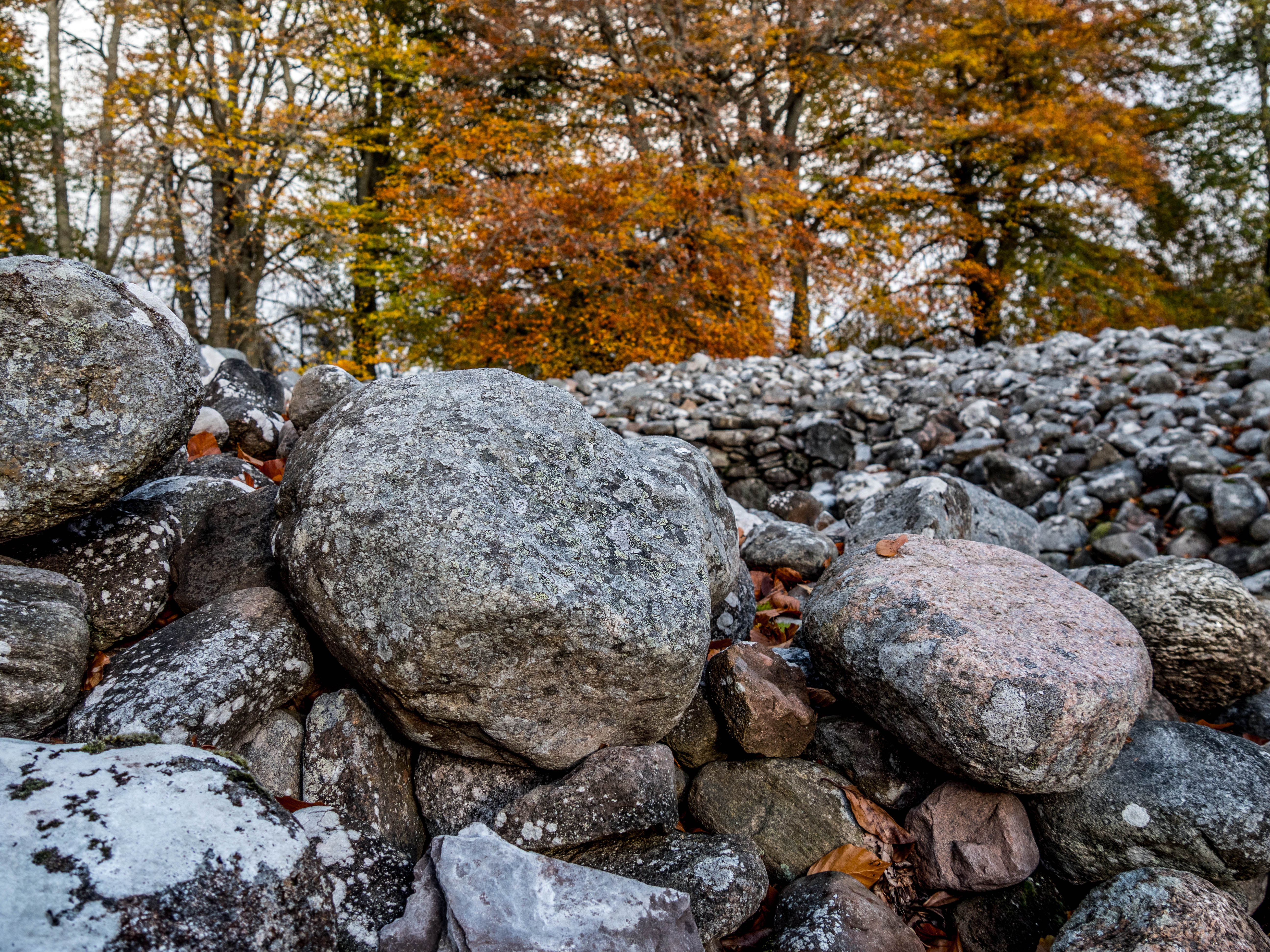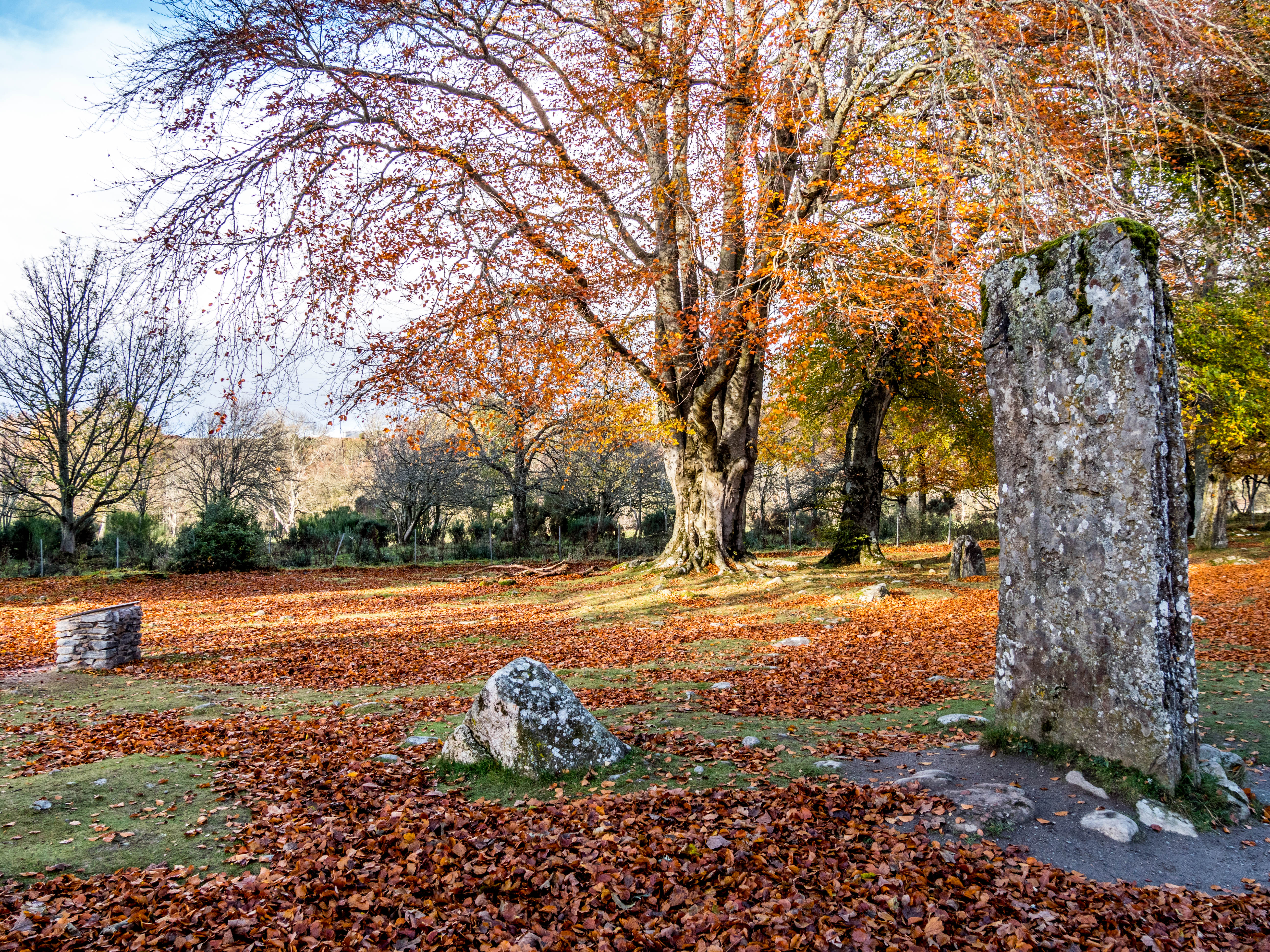 Fans des aventures de Claire Beauchamp-Randall-Fraser, je vais vous décevoir : Craigh na Dun n’existe pas. Par contre, la fameuse pierre magique, elle, fait partie du complexe de Clava Cairns (le site plus large étant celui de Callanish Stones dans les Hébrides extérieures). Elle se dresse de manière imposante sur ce petit ensemble de tombes datant de l’âge de bronze. Pour les archéologues, il s’agit d’une série de chambres à tombes qui témoignent de la vie des hommes il y a des milliers d’années mais pour les plus rêveurs, c’est aussi un endroit porteur d’une certaine force ésotérique. La tombe à couloir, dont l’étroit passage est orienté de manière à ce que les rayons du soleil y entrent au solstice d’hiver, en est le plus bel exemple… et il se trouve qu’au moment où nous sommes arrivés aux Clava Cairns, le soleil est soudainement réapparu, illuminant le feuillage d’automne d’une lueur de feu. Finalement, se passerait-il vraiment « quelque chose » à Clava Cairns ? En tout cas, je ne suis étrangement pas très à l’aise lorsque je me retrouve nez-à-nez avec la fameuse pierre. Heureusement, pas de drôle de sifflements, ni de transport mystérieux au XVIIIe siècle, à l’époque des révoltes jacobites, au moment où je touche la pierre.
